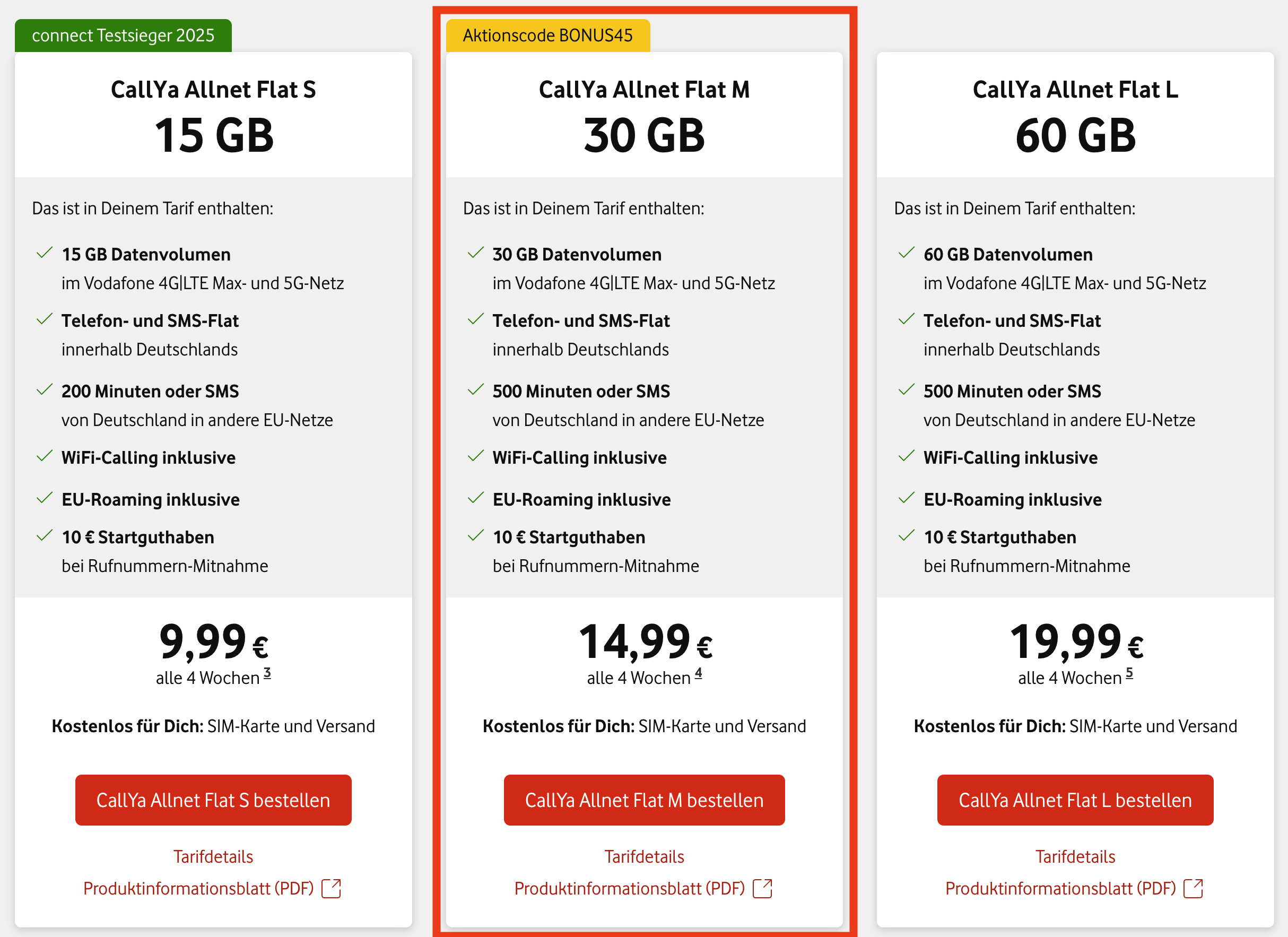 Schaut ihr euch das Tarif-Portfolio von CallYa an, findet ihr über dem „Allnet Flat M“ nur noch einen 60GB-Tarif und ein Angebot mit 5G-Datenflat. Nach unten hin gibt es noch 3 weitere Tarife mit weniger Leistungen. In anderen Worten: Der „CallYa M“ ist genau in der Mitte angesiedelt und bietet Leistungen, die im Alltag jedes Nutzungsverhalten abdecken.