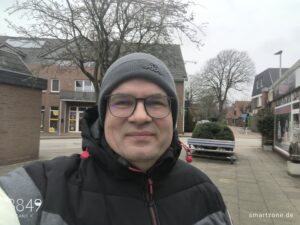 Obwohl ein 50-Megapixel-Sensor zum Einsatz kommt, fallen die Ergebnisse der Frontkamera enttäuschend aus. Es mangelt den Selfies an Schärfe und dem korrekten Fokuspunkt. Die Farben wirken matt und der Kontrast bietet Luft nach oben. Trotz bedecktem Himmel neigt die Kamera zu Überbelichtungen. Für ansehnliche Selfies eignet sich das 8849 Tank X nicht.