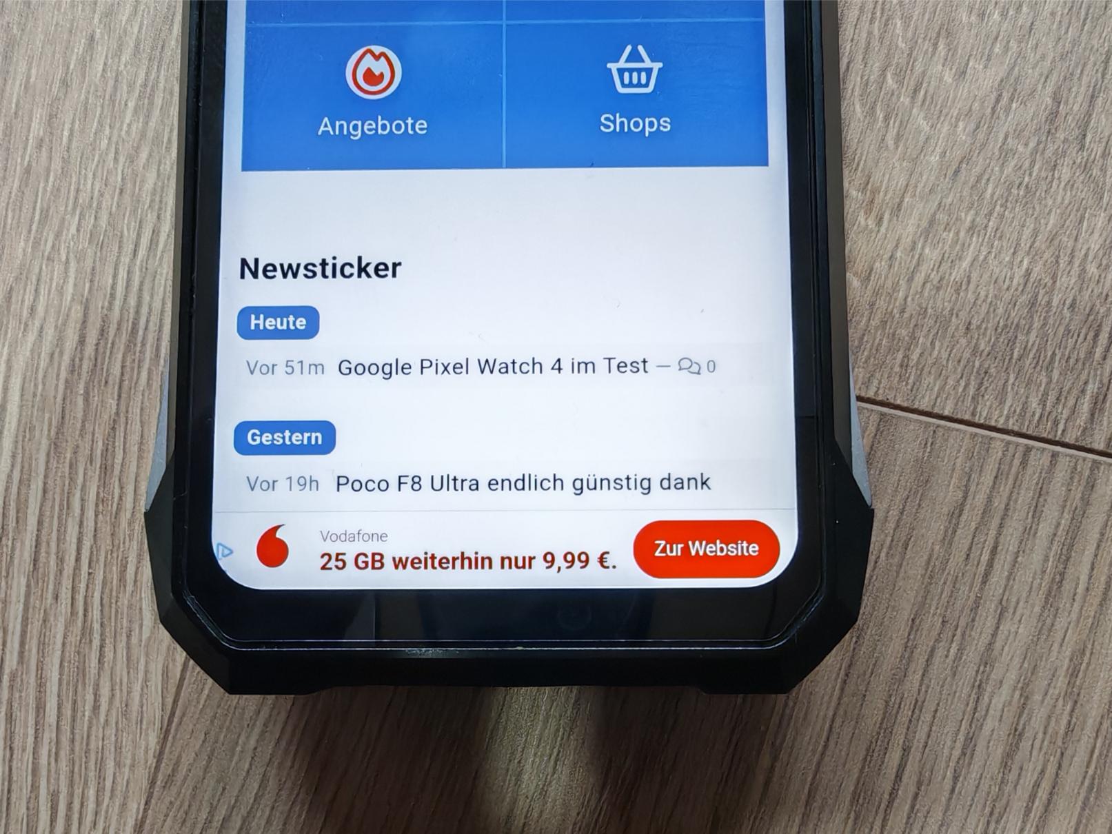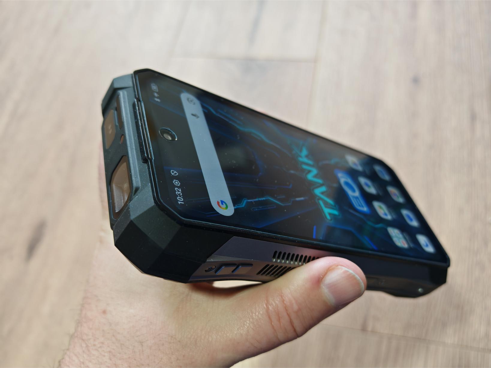 Breite Displayränder umgeben das Panel, wie in dieser Klasse üblich, wobei das etwas breitere Kinn kaum auffällt. Der Bildschirm liegt einen knappen Millimeter tiefer im Gehäuse und ist dadurch gut geschützt. Im Bildschirm selbst sitzt die Frontkamera sichtbar in einer „Punch-Hole-Notch“. Insgesamt überzeugt das 8849 Tank X in diesem Bereich und erregt in der Öffentlichkeit definitiv Aufsehen. Unterschätzt aber nicht die Abmessungen und das Gewicht!
