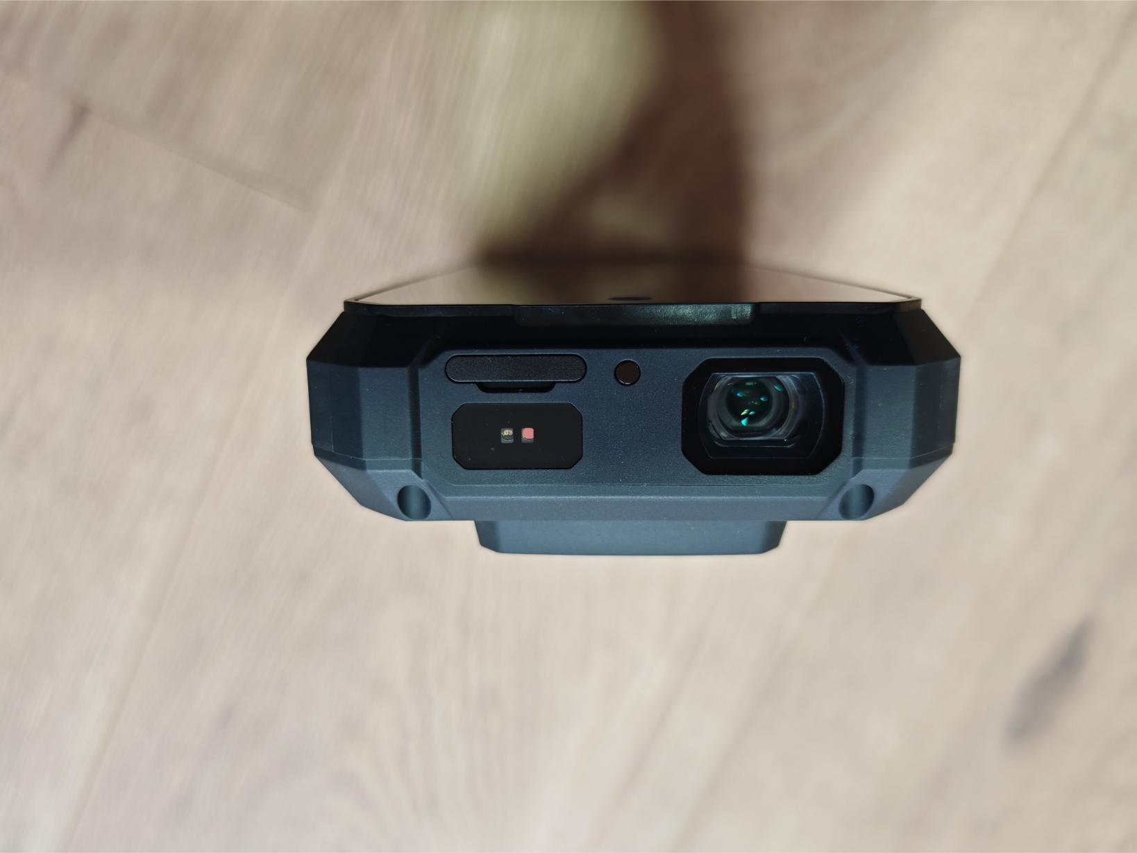 Spannend ist die Oberseite mit der Öffnung für den Beamer, dem Laser zur Erfassung des Abstands und dem Hybrid-Slot für die SIM-Karten oder eine microSD-Karte. Zur Entfernung des Slots ist keine SIM-Nadel erforderlich. Dazu gesellt sich ein IR-Sender. Sowohl der Beamer als auch der Laser sind durch Glas geschützt. Die Rückseite unterscheidet sich kaum von den anderen Tank-Modellen, wirkt für ein reguläres Smartphone aber außergewöhnlich. Besonders das große LED-Element sticht hervor. Die oberen beiden Kameras und der LED-Blitz stehen nochmals 2,5mm hervor, was angesichts der Gehäusedicke unnötig erscheint. Am unteren Ende befindet sich eine massive Befestigungsöse.
