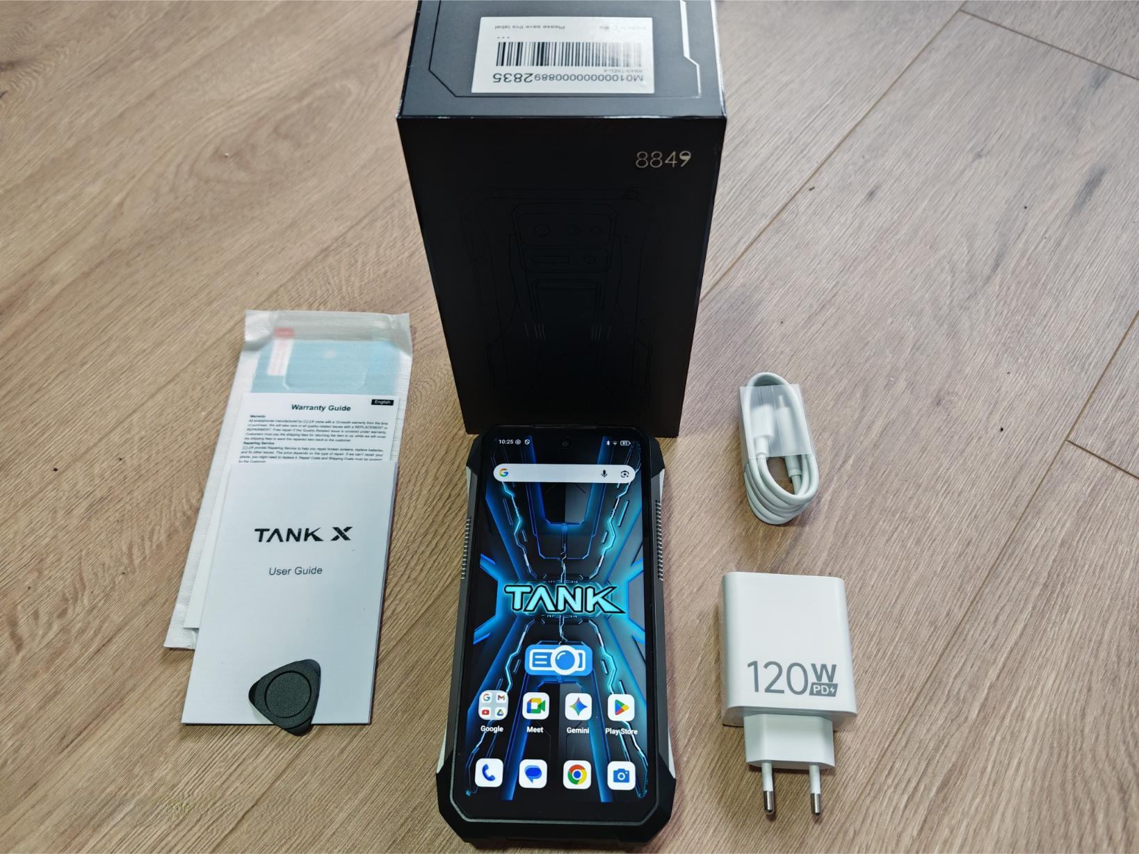 Der Lieferumfang des 8849 Tank X fällt vollständig aus. Im Gegensatz zu vielen Konkurrenten liegt ein passendes 120 Watt starkes Netzteil bei. Dazu kommen der übliche Papierkram und eine SIM-Nadel. Auf dem Bildschirm ist bereits eine hochwertige Schutzfolie angebracht, eine zweite liegt bei. Eine Handschlaufe oder ein Lanyard fehlen, da sich das Smartphone aufgrund der Größe nicht für die Hosentasche eignet.