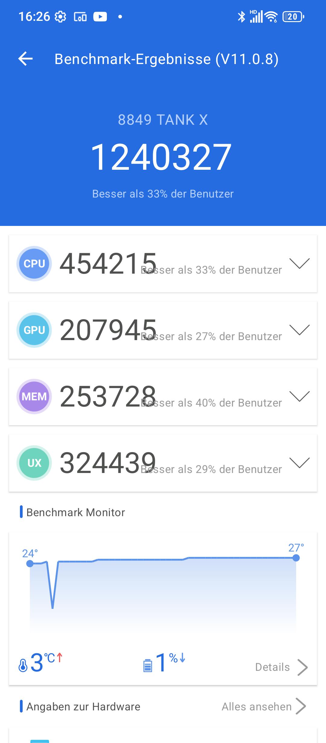 Mit dem MediaTek Dimensity 8200 kommt ein fast drei Jahre alter Prozessor im 8849 Tank X zum Einsatz, der allerdings stark genug für die obere Mittelklasse ist. Der Chip besitzt vier Leistungskerne sowie vier Energiesparkerne und wird im 4nm-Verfahren gefertigt. Zusammen mit dem riesigen 16GB großen LPDDR5-Arbeitsspeicher liefert die CPU eine ansprechende Leistung.