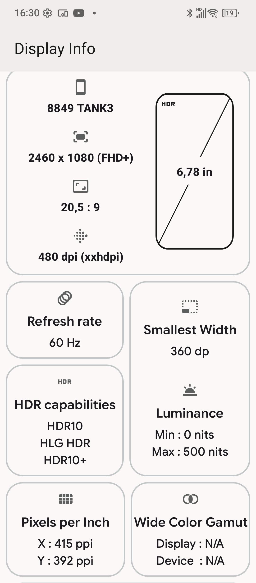 Die Anzeige des Tank X fällt in Anbetracht der restlichen Ausstattung unspektakulär aus. Ein 6,78 Zoll großes IPS-Panel mit einer Auflösung von 2460 x 1080 Pixel kommt zum Einsatz. Einzelne Pixel sind dadurch nicht zu erkennen, die Ausleuchtung des Bildschirms dürfte jedoch homogener sein. Die maximale Helligkeit von 551 Lux reicht für sonnige Tage im Freien zudem nicht aus.