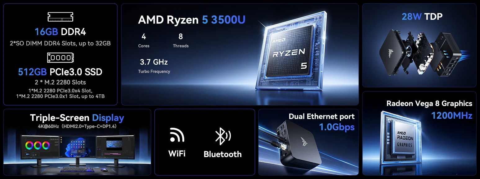 Wer einen zuverlässigen Office-PC oder einen Home-Server sucht, wird beim E3 fündig. Für knapp 210€ gibt es hier den bewährten Ryzen 5 3500U mit 16GB RAM und 512GB SSD. Die Leistung liegt laut Hersteller rund 35% über den oft verbauten Intel N100 Chips in dieser Preisklasse.