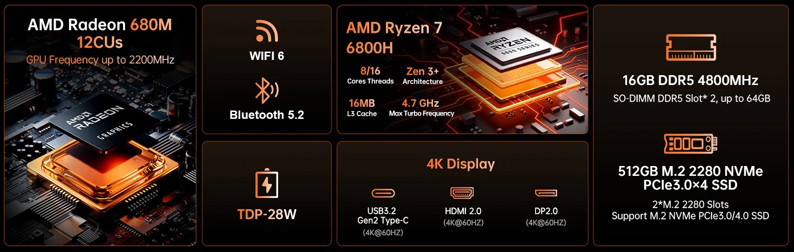 Der H1 ist die kompaktere, flache Alternative und setzt voll auf AMD-Hardware. Im Gehäuse arbeitet der Ryzen 7 6800H (8 Kerne, 16 Threads). Der große Vorteil dieses Chips ist die integrierte Radeon 680M Grafikeinheit. Diese bietet deutlich mehr Grafikleistung als übliche Intel-Lösungen und ermöglicht sogar leichtes Gaming in 1080p. Dazu verbaut NiPoGi hier bereits den schnelleren DDR5-Arbeitsspeicher (32GB), was der Grafikperformance zusätzlich zugutekommt.