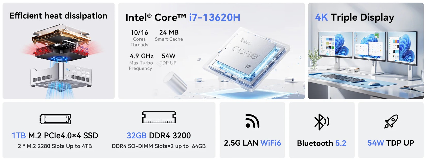 Der H2 unterscheidet sich optisch durch sein vertikales Design von klassischen Mini-PCs und spart so Stellfläche auf dem Schreibtisch. Im Inneren arbeitet ein aktueller Intel Core i7-13620H der 13. Generation mit 10 Kernen (6 Performance-Kerne, 4 Effizienz-Kerne) und bis zu 4,90GHz Takt.