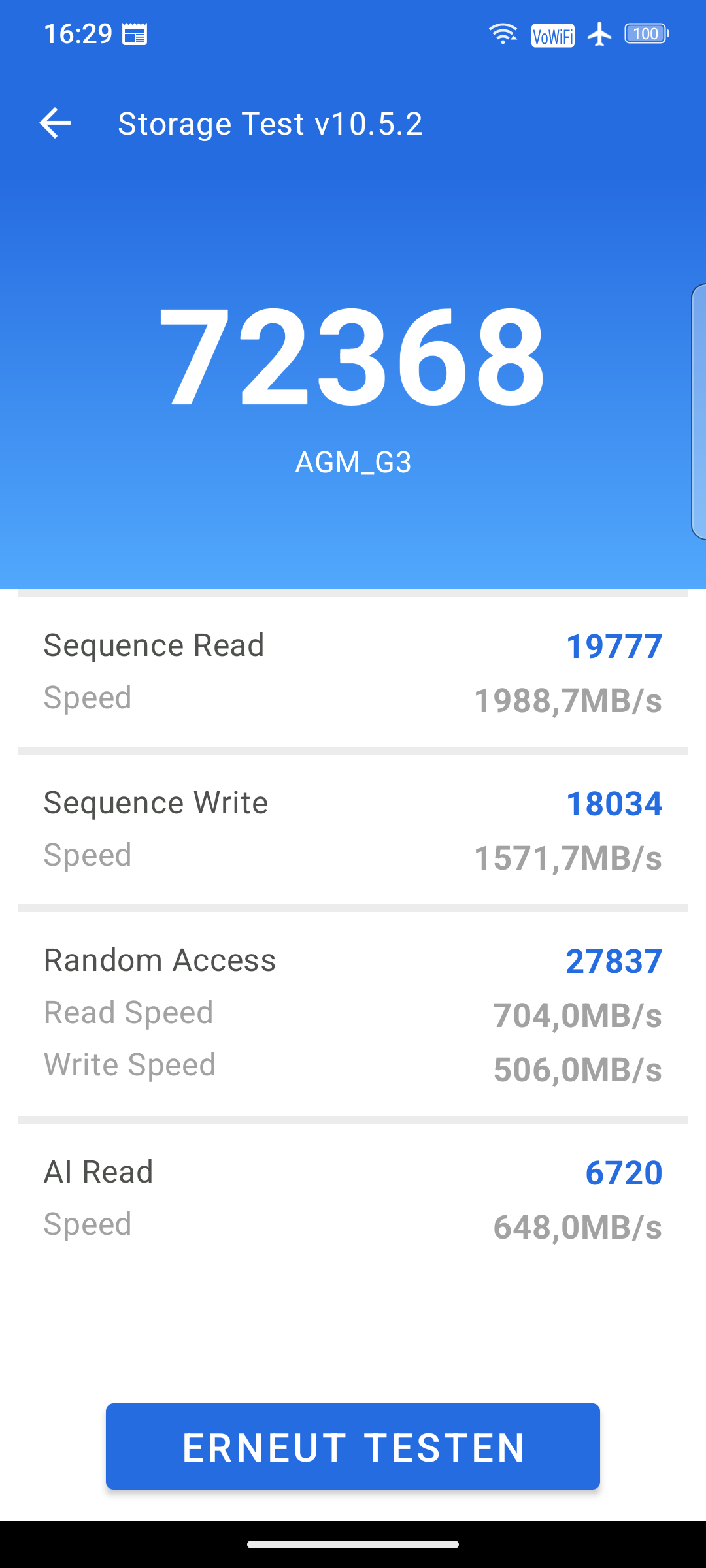 Das AGM G3 Pro ist lediglich in einer Speicherversion zu haben. Mit 12GB RAM und 512GB Flashspeicher fällt diese allerdings zeitgemäß aus und dürfte den Ansprüchen der meisten Nutzer entsprechen. Sind diese höher, kann die Kapazität unkompliziert per MicroSD-Karte erweitert werden. Die Information, welcher Speicherstandard verbaut wurde, bleibt uns AGM schuldig. Ordentliche 1988MB/s Lese- und 1571MB/s Schreibgeschwindigkeit sprechen allerdings für UFS 3.1 Speicher.