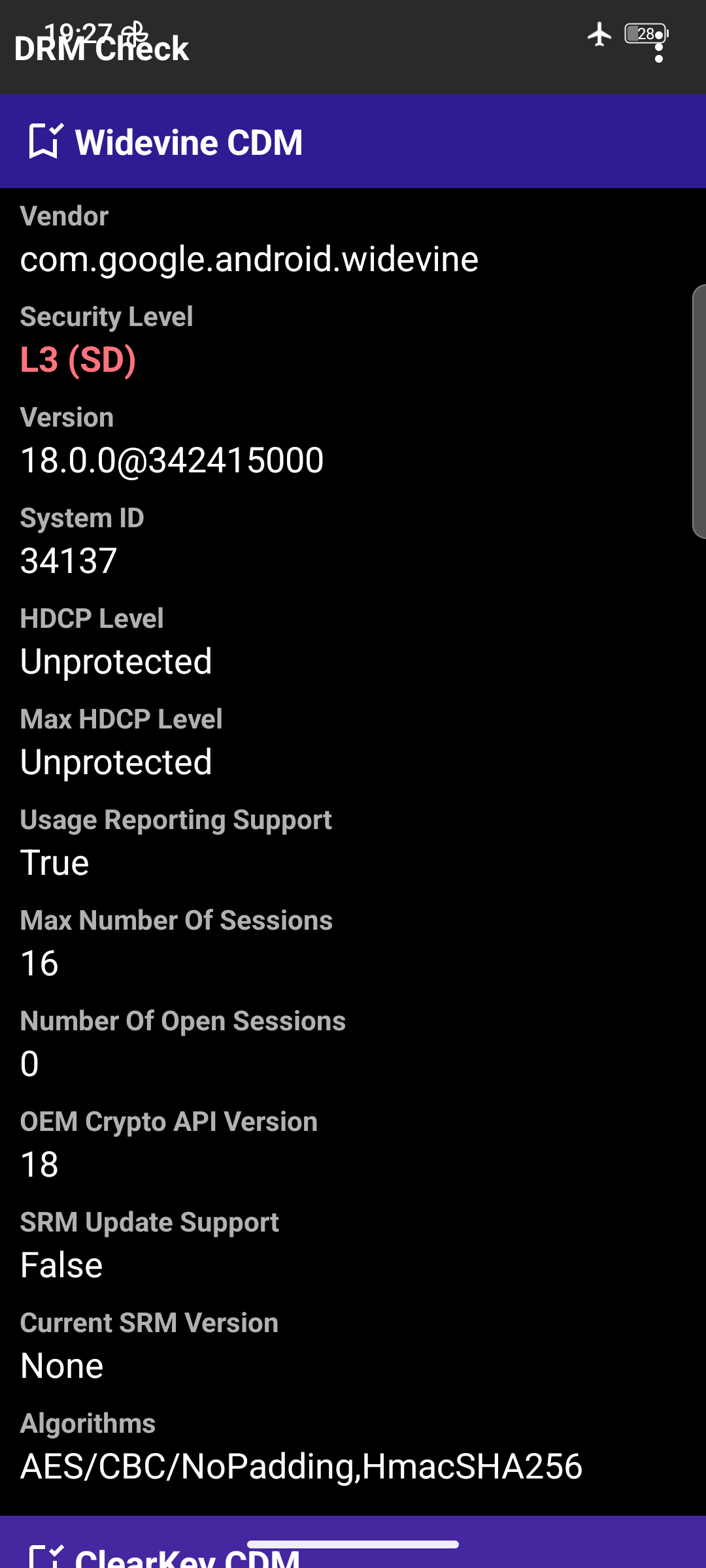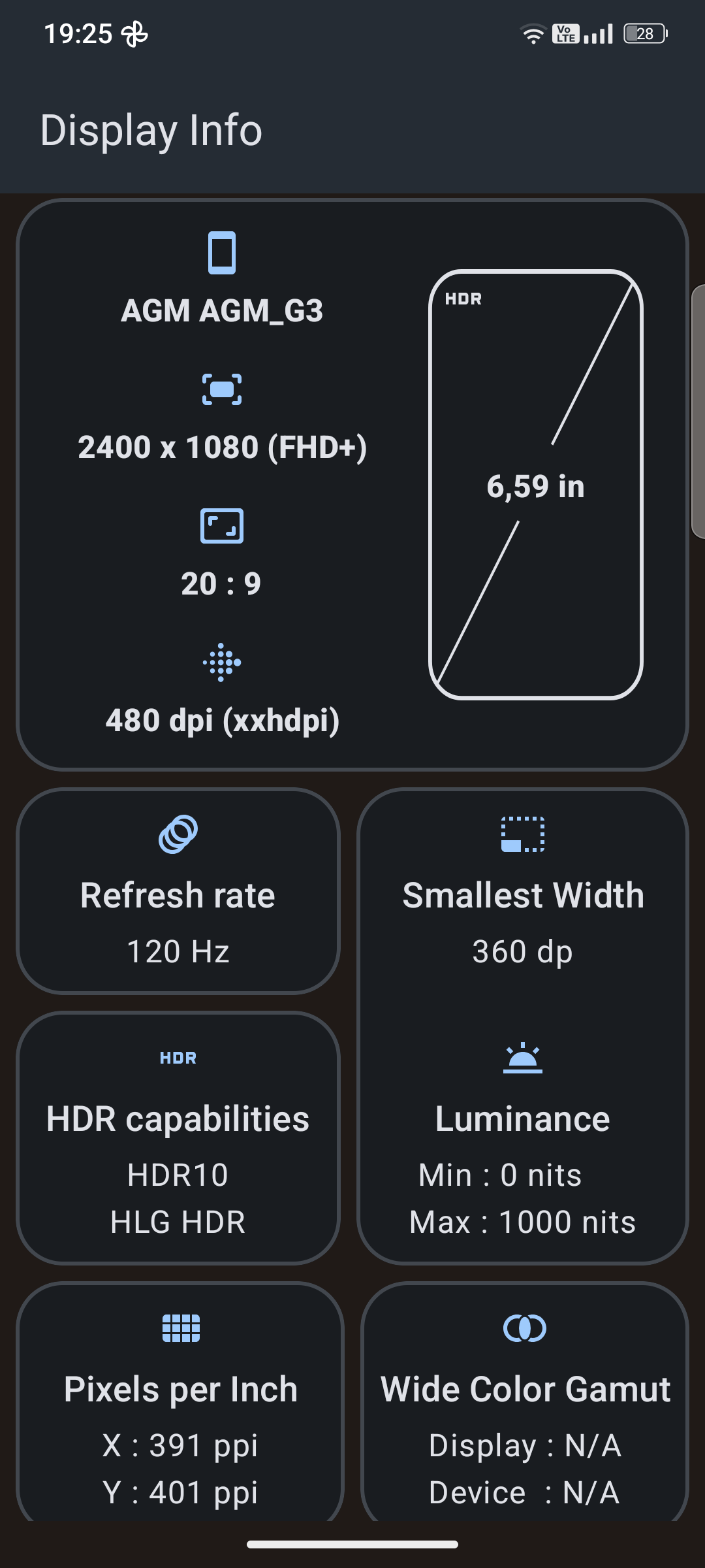 Der IPS-Bildschirm unseres Testgeräts hat eine monströse Diagonale von 6,72 Zoll und kommt mit seiner Auflösung von 2400 x 1080 Pixel auf 391 PPI. Einzelne Pixel lassen sich hierdurch nicht mit bloßem Auge ausmachen und die Inhalte werden scharf dargestellt. Diese Pixeldichte lässt sich allerdings nicht für hochauflösendes Streaming über die gängigen Pay-To-Watch-Anbieter nutzen, da unser Testgerät nur Widevine L3 unterstützt und Inhalte lediglich in SD-Qualität (480p) wiedergegeben werden. Wie üblich bei Outdoor-Smartphones wird das Display des AGM G3 Pro durch einen breiten Rahmen geschützt. Die Displayränder messen an den Seiten 6, oben 9 und unten 13 Millimeter und sind damit nicht nur breit, sondern ebenfalls an den Ecken erhöht, um den Bildschirm zu schützen.