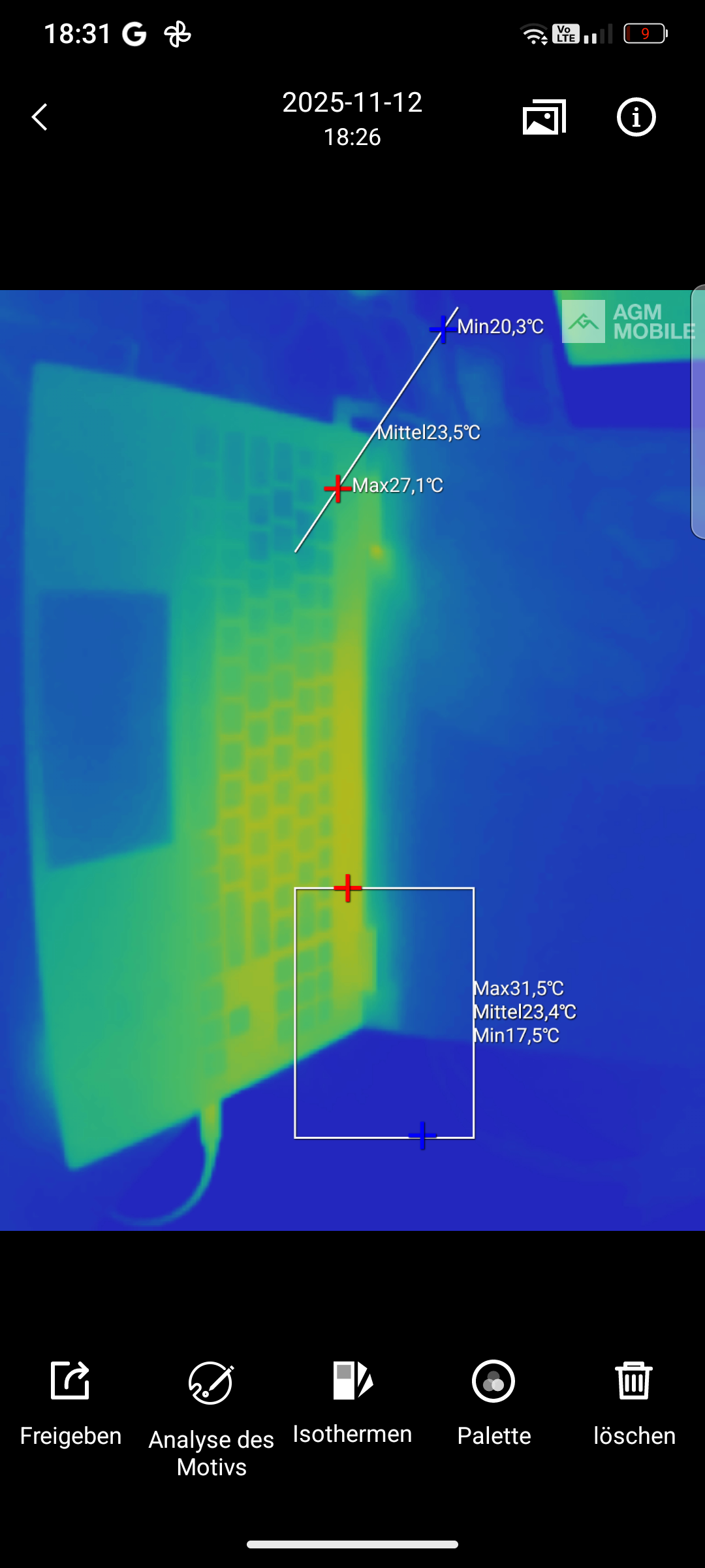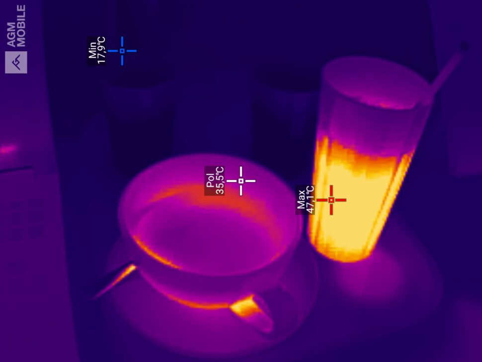 Die Wärmebildkamera eröffnet einem neue Welten! Im Testzeitraum wurde mithilfe des Sensors die Position von Warmwasserleitungen bestimmt, Wärmebrücken in einem Altbau identifiziert oder schlicht und ergreifend geprüft, ob frisch gezogener Tee bereits auf Trinktemperatur abgekühlt ist. Nach Aufnahme können festgelegte Bereiche des Bildes analysiert, die Darstellung abhängig von ausgewählten Temperaturgrenzen angepasst sowie die Farbdarstellung geändert werden.