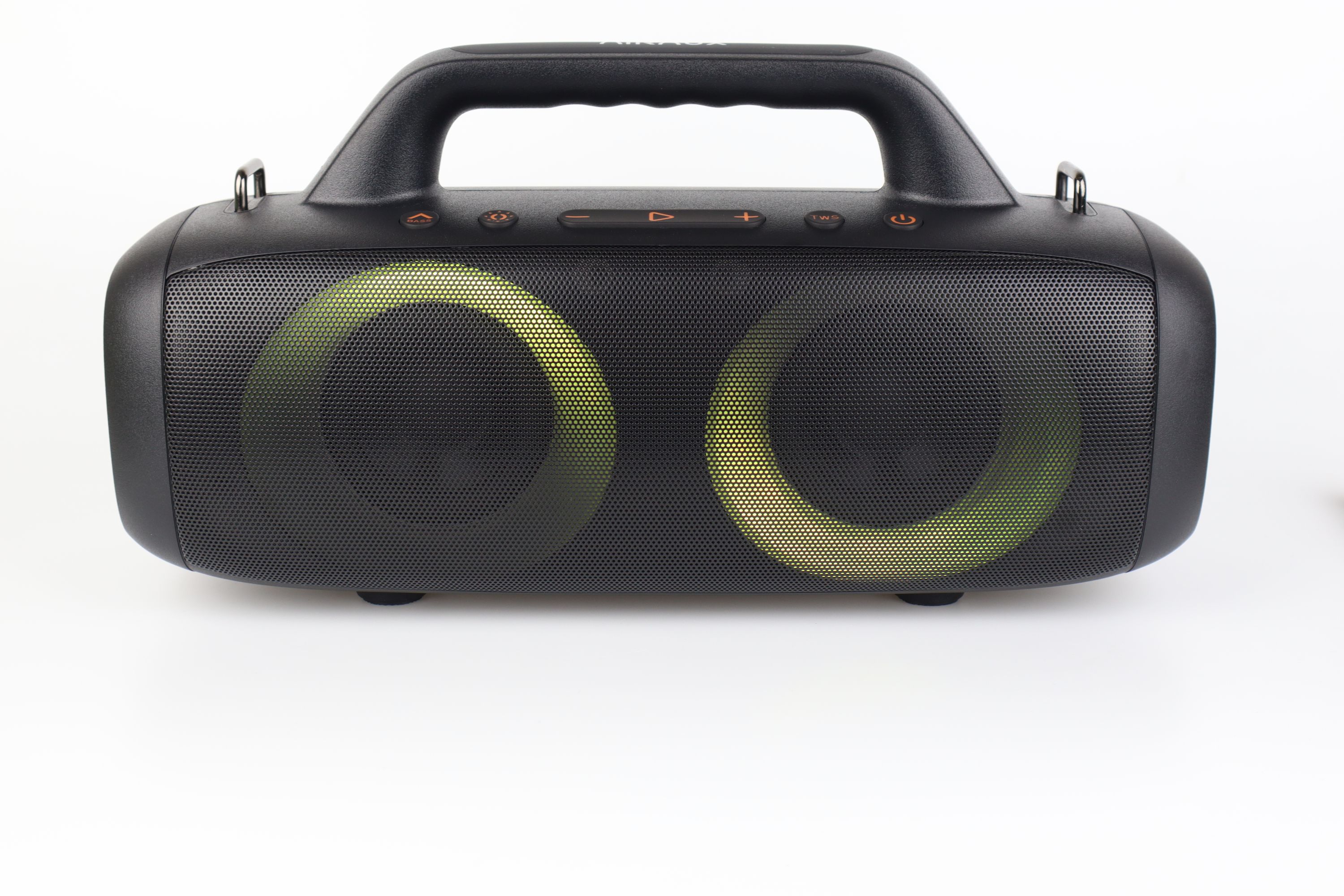 An beiden Seiten der AirAux AA-DH1 finden wir zwei große passive Bass Radiatoren, die mit dem relativ unbekannten Markenlogo von AirAux versehen ist. Hier wäre eine Wiedererkennung da, wenn man das Logo häufiger auf den Geräten oder in der Werbung entdecken würde – ist aber leider nicht so. Das schwarze Gitter vorn schützt die Lautsprecherchassis ausgezeichnet gegen Stöße und Druck beim Transport oder Lagerung entstehen kann. Um die beiden 25W Breitbandchassis befinden sich 2 RGB-LED Ringe, die im ausgeschalteten Zustand von außen nicht erkennbar sind, allerdings einwandfrei und hell durchscheinen, sobald der Lautsprecher angeschaltet wird.