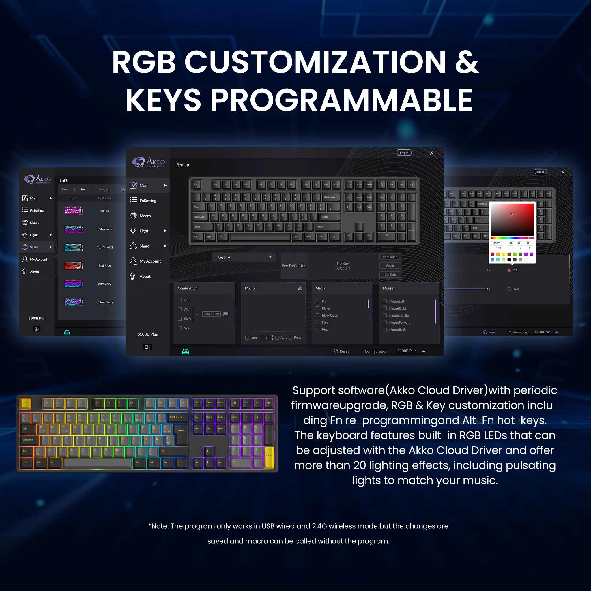 Wie eingangs angeschnitten, kann sich die Beleuchtung der Akko sehen lassen, auch wenn die einzelnen Tasten nicht beleuchtet werden. Eine Vielzahl an Leuchteffekten und Farbvarianten sind schon direkt über die Tastatur auswählbar, dazu noch in diversen Geschwindigkeiten und Helligkeitsstufen. In den höheren Helligkeitseinstellungen reicht die Beleuchtung definitiv für das Finden der Tasten bei Dunkelheit. Weitere Anpassungsmöglichkeiten findet ihr dann in der Software.
