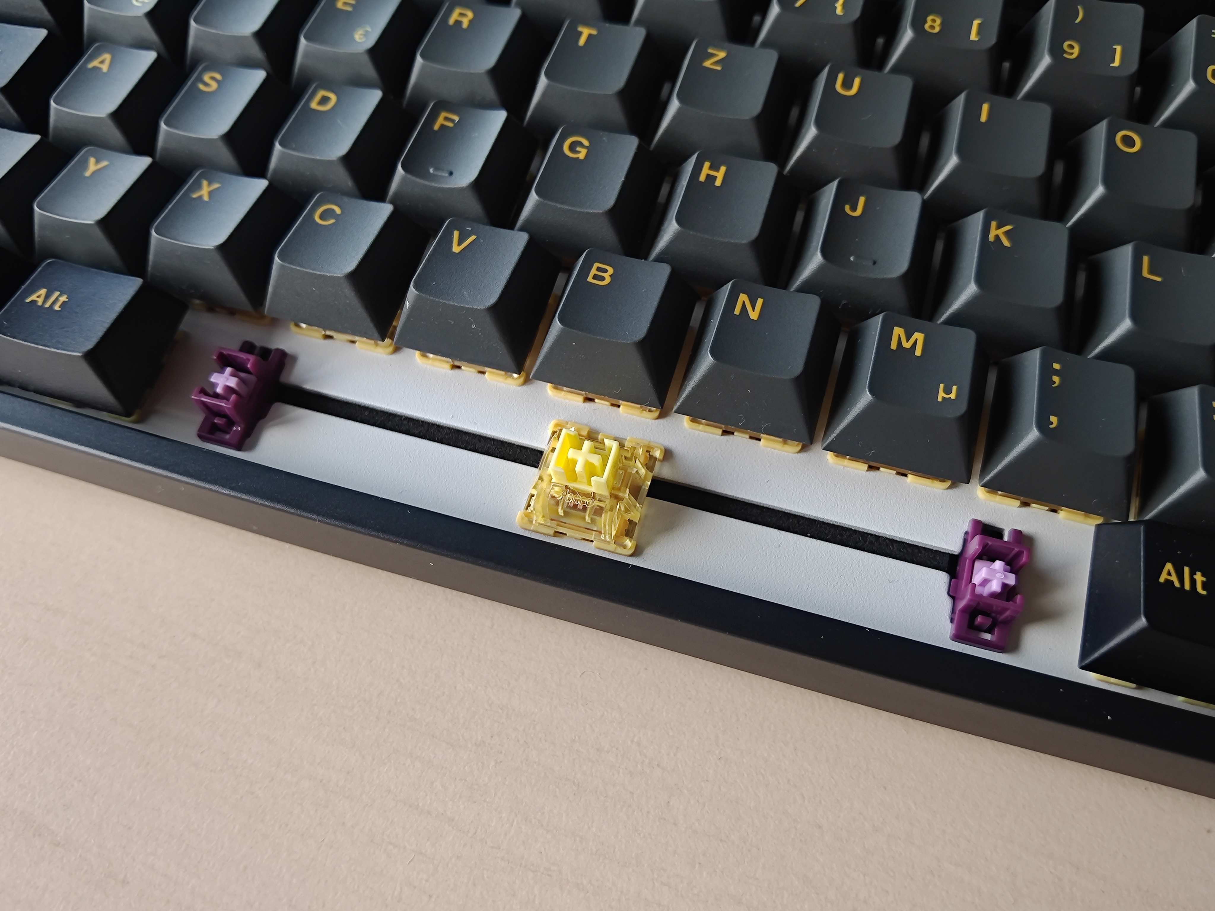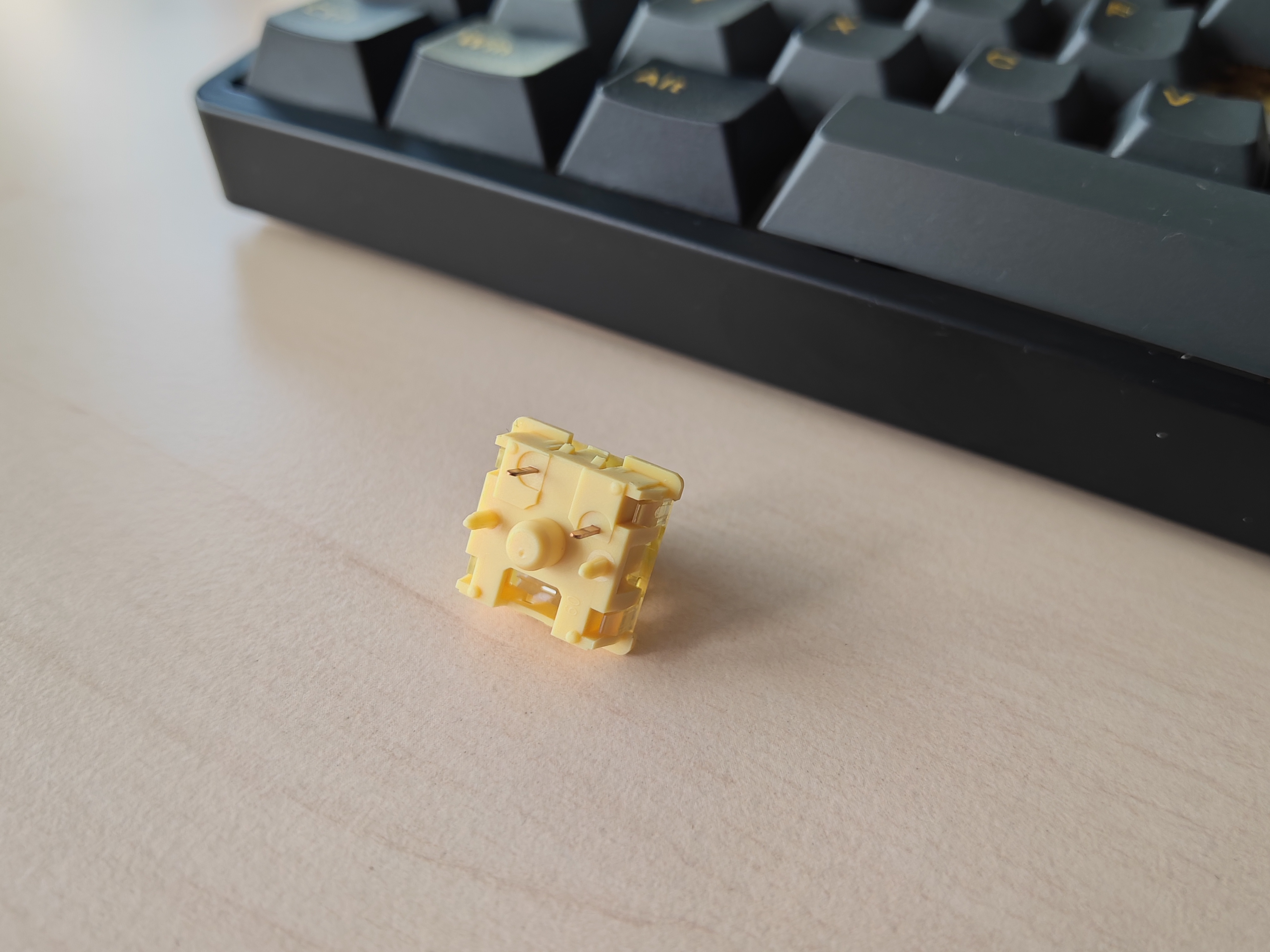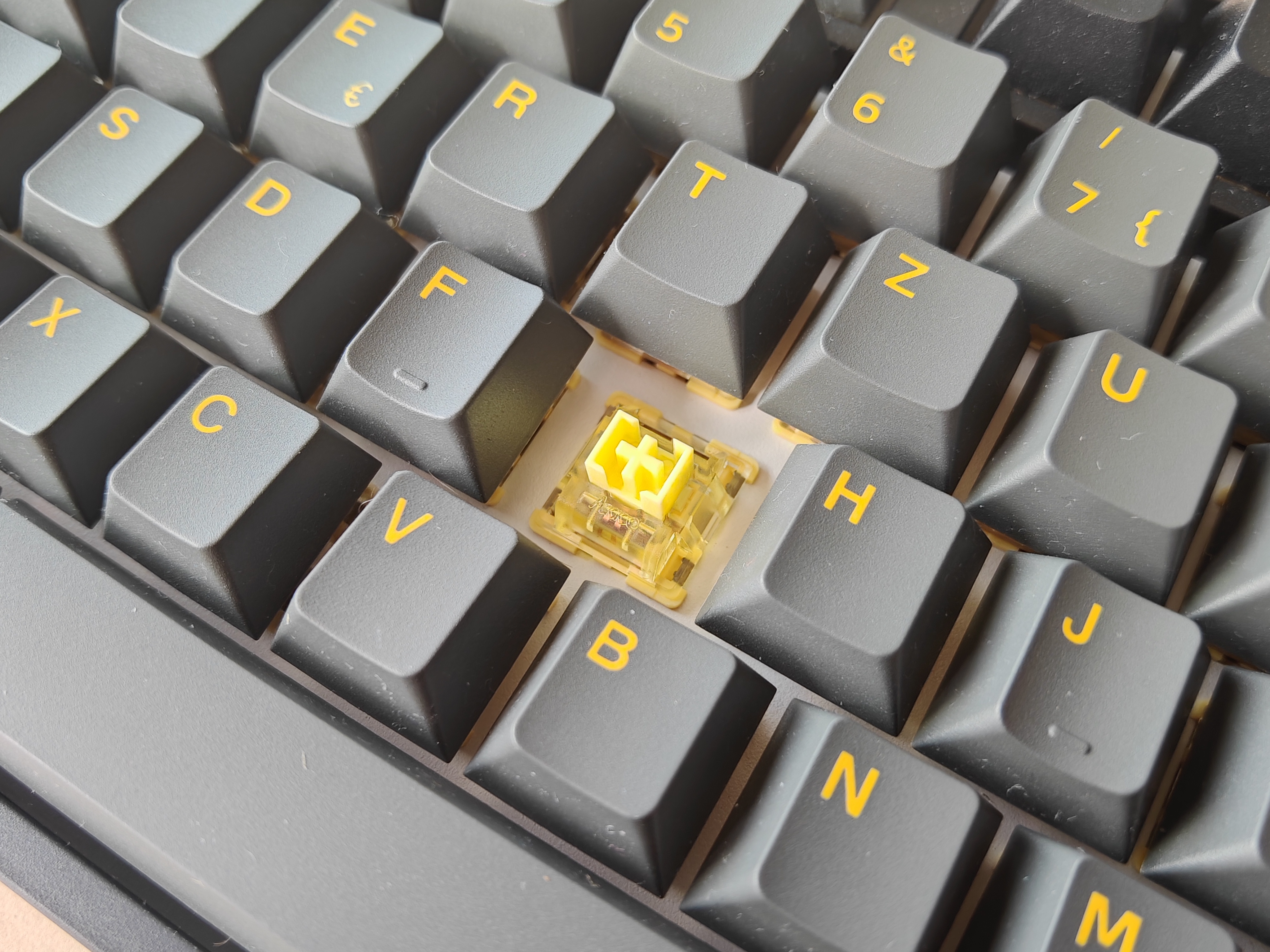 Die bei unserem Testmodell verwendeten Creamy Yellow Pro V3-Switche sind die Standardwahl beim „Black & Gold“-Design. Es handelt sich um lineare Schalter, das heißt, die Auslösekraft ist über den gesamten Hubweg hinweg gleich. Aufwenden müsst ihr dabei 50±5gf. Das sind, zum Vergleich, 5gf mehr als die Cherry-Schalter der Epomaker TH99. Der maximale Hubweg liegt bei 3,3 Millimetern, wobei bereits nach 2±0,6mm der eigentliche Tastendruck ausgelöst wird. Halten sollen die Tasten zwischen 50 und 100.000.000 (einhundert Millionen) Anschläge lang.