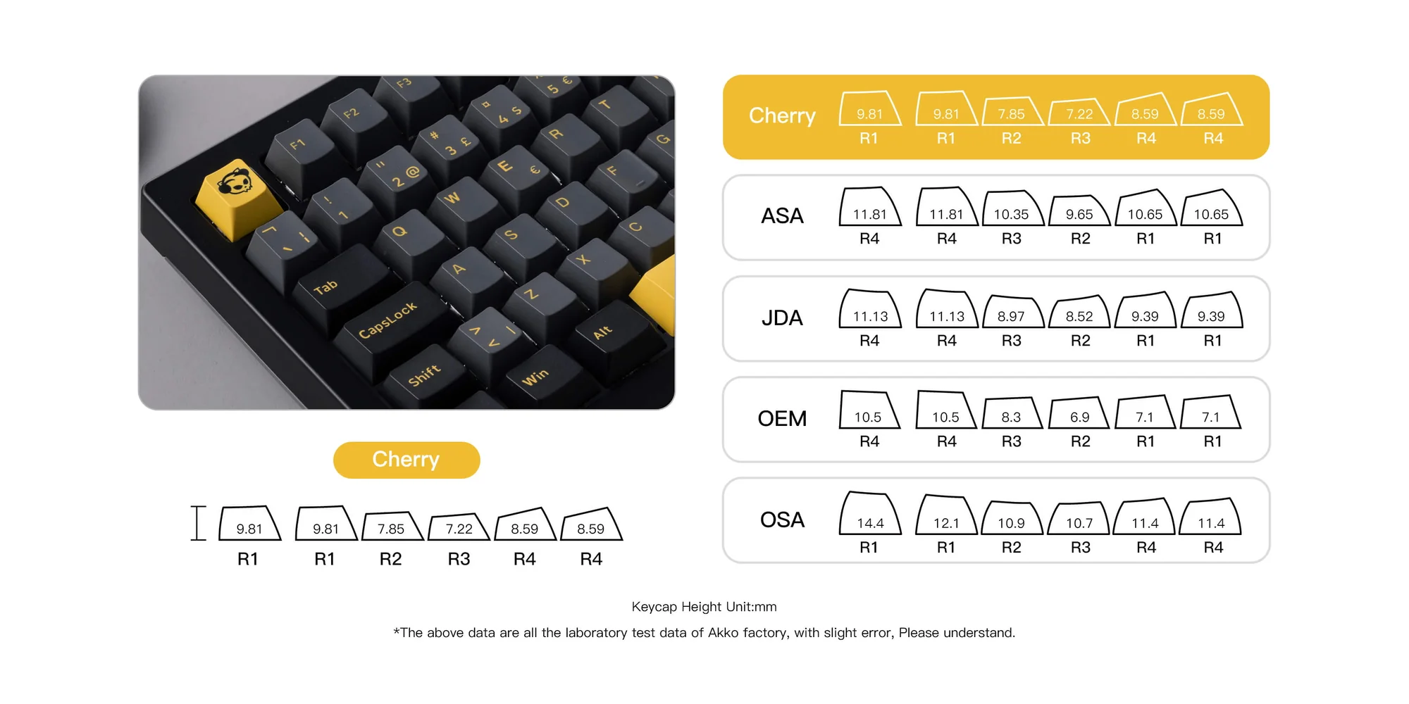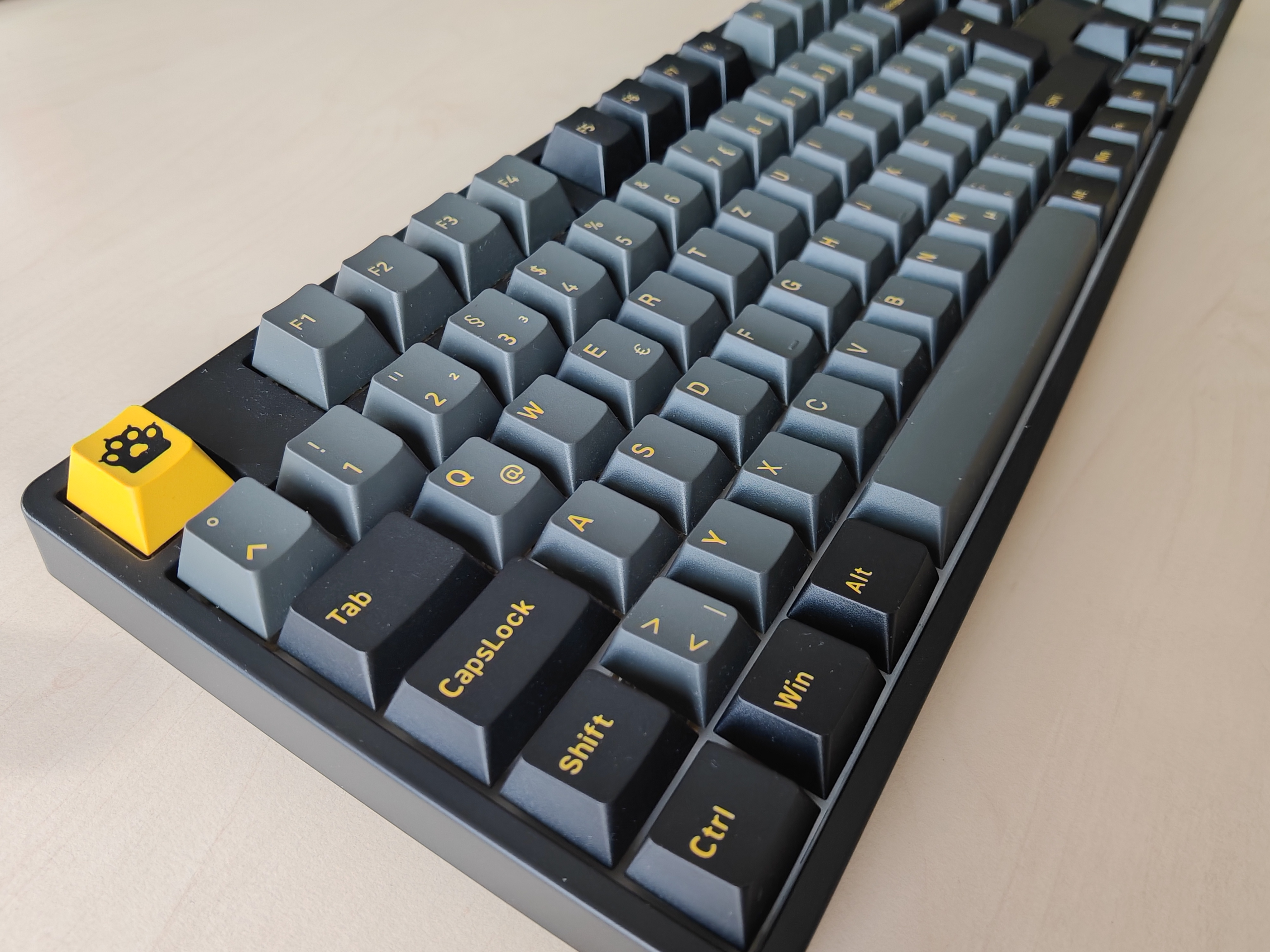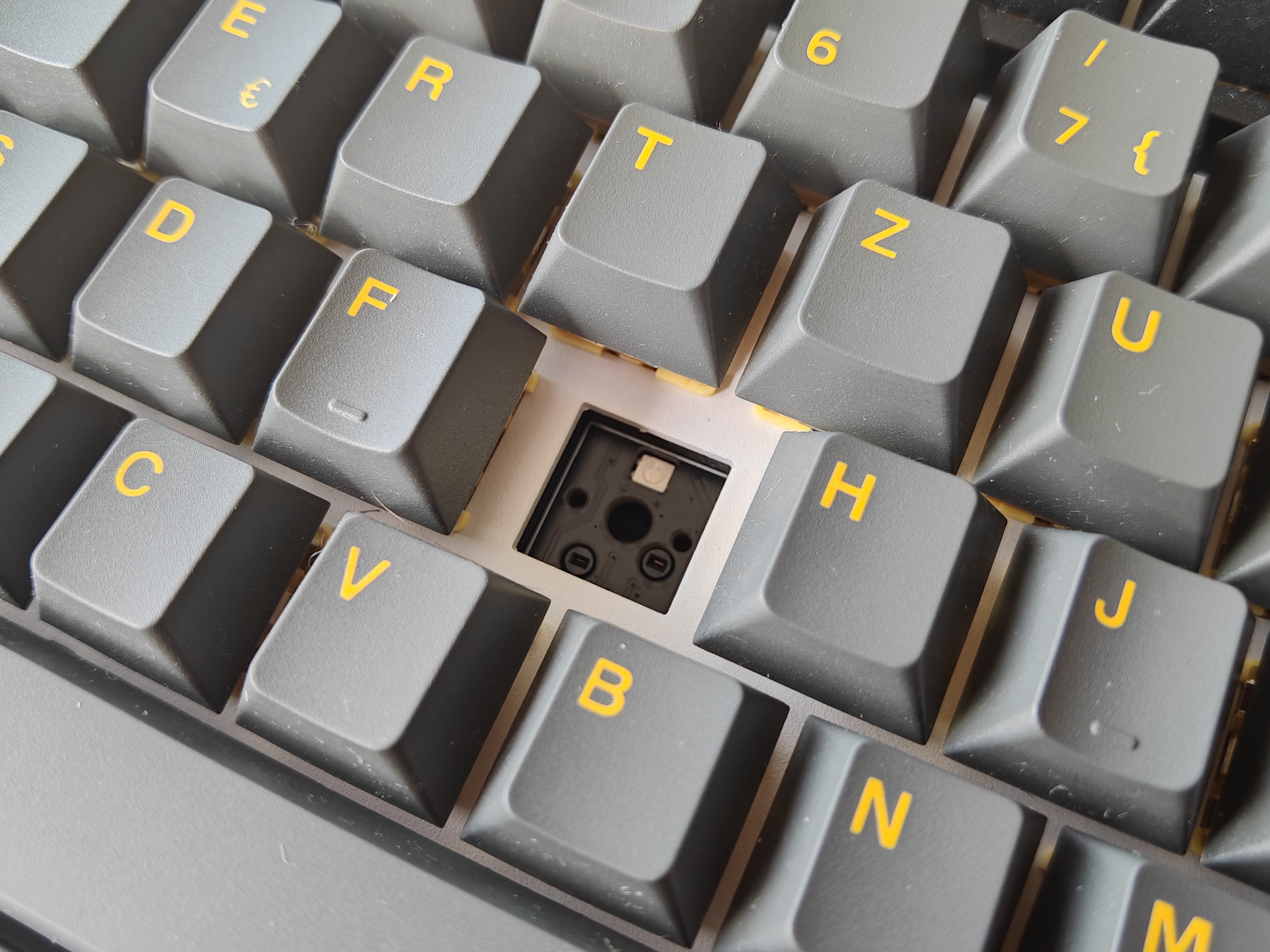 Die bei unserem Testmodell verwendeten Creamy Yellow Pro V3-Switche sind die Standardwahl beim „Black & Gold“-Design. Es handelt sich um lineare Schalter, das heißt, die Auslösekraft ist über den gesamten Hubweg hinweg gleich. Aufwenden müsst ihr dabei 50±5gf. Das sind, zum Vergleich, 5gf mehr als die Cherry-Schalter der Epomaker TH99. Der maximale Hubweg liegt bei 3,3 Millimetern, wobei bereits nach 2±0,6mm der eigentliche Tastendruck ausgelöst wird. Halten sollen die Tasten zwischen 50 und 100.000.000 (einhundert Millionen) Anschläge lang.