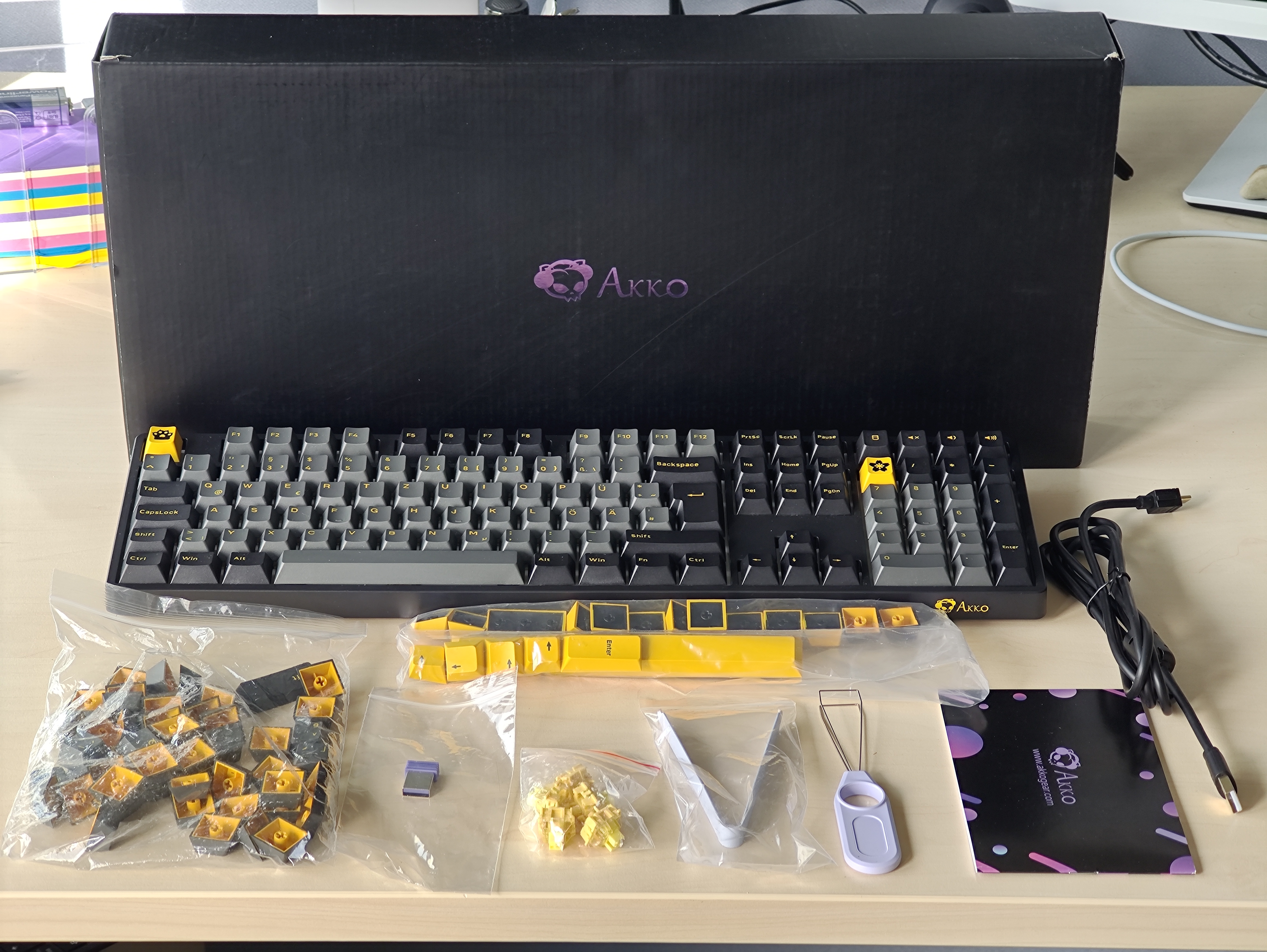Neben der Standardvariante in Schwarz bietet Akko die 5108b Plus in vielen verschiedenen Farben und Designs an. Manche sind sehr aufwendig gestaltet, wie etwa die „Lord of the Mysteries“-Variante, bei manchen stehen Anime-Figuren Vorbild für die Farbpalette. Tendenziell dürfte bei den 15 Designs für jeden etwas Passendes dabei sein. Der Lieferumfang ist dabei immer identisch, aber farblich auf die jeweilige Version angepasst. Vorsicht ist nur bei der Belegung geboten: Die meisten dieser Designs sind in QWERTY.