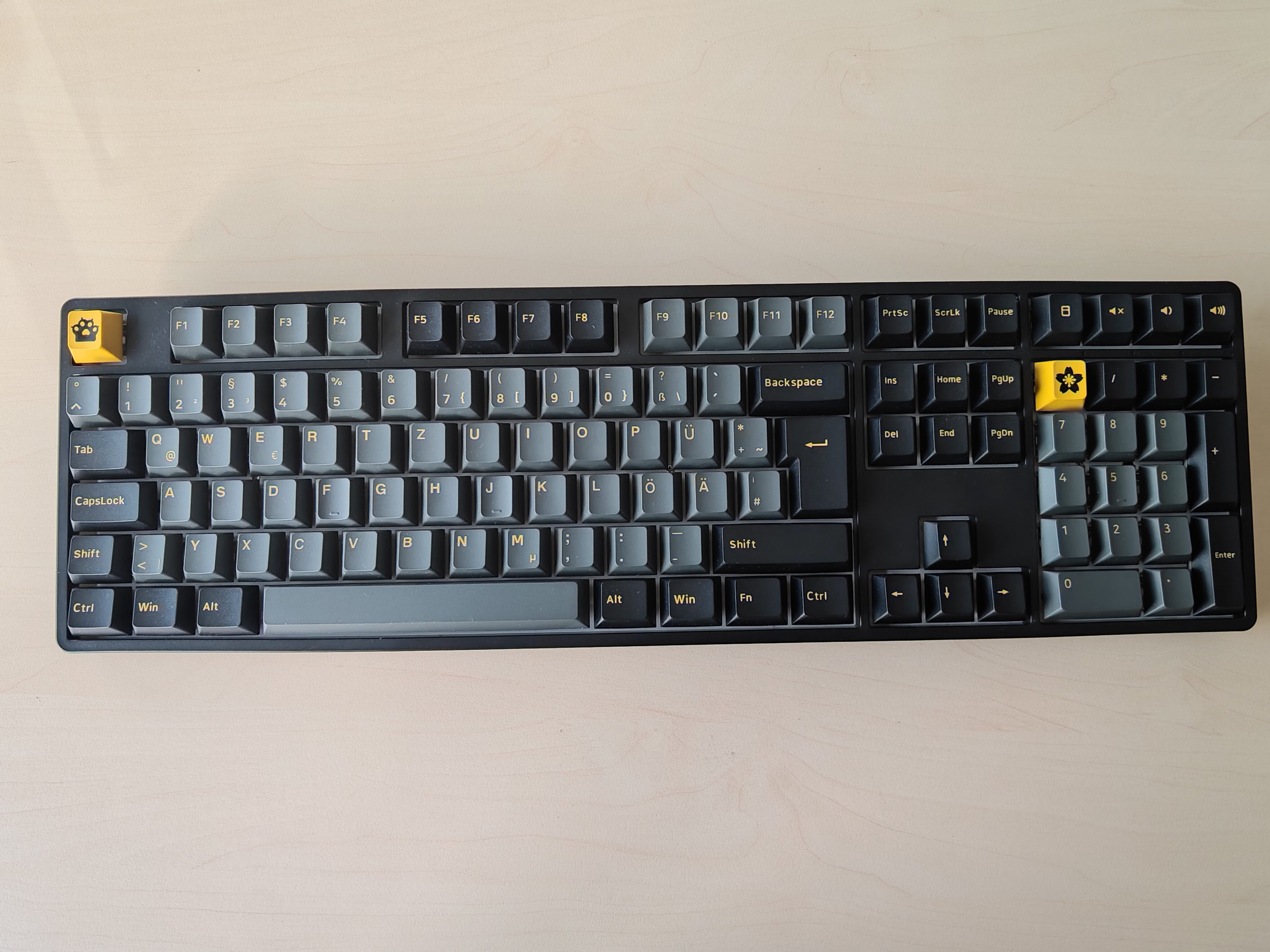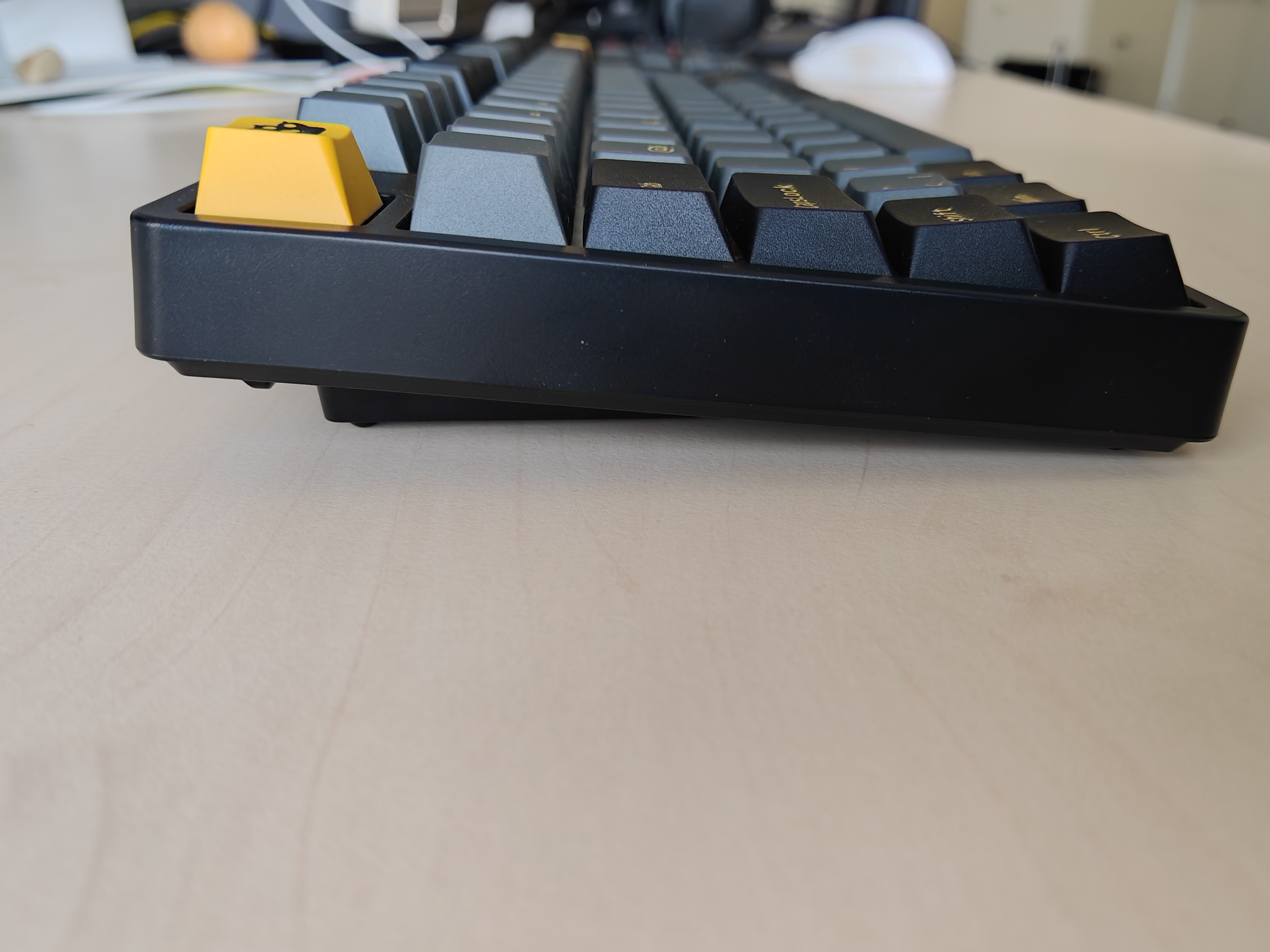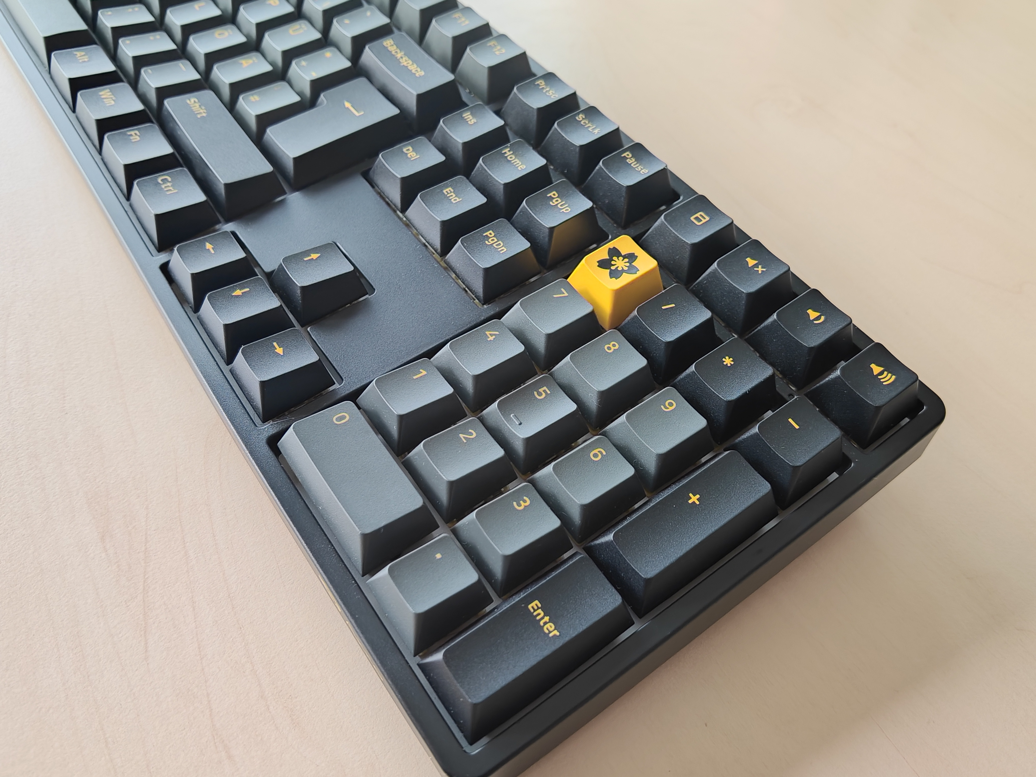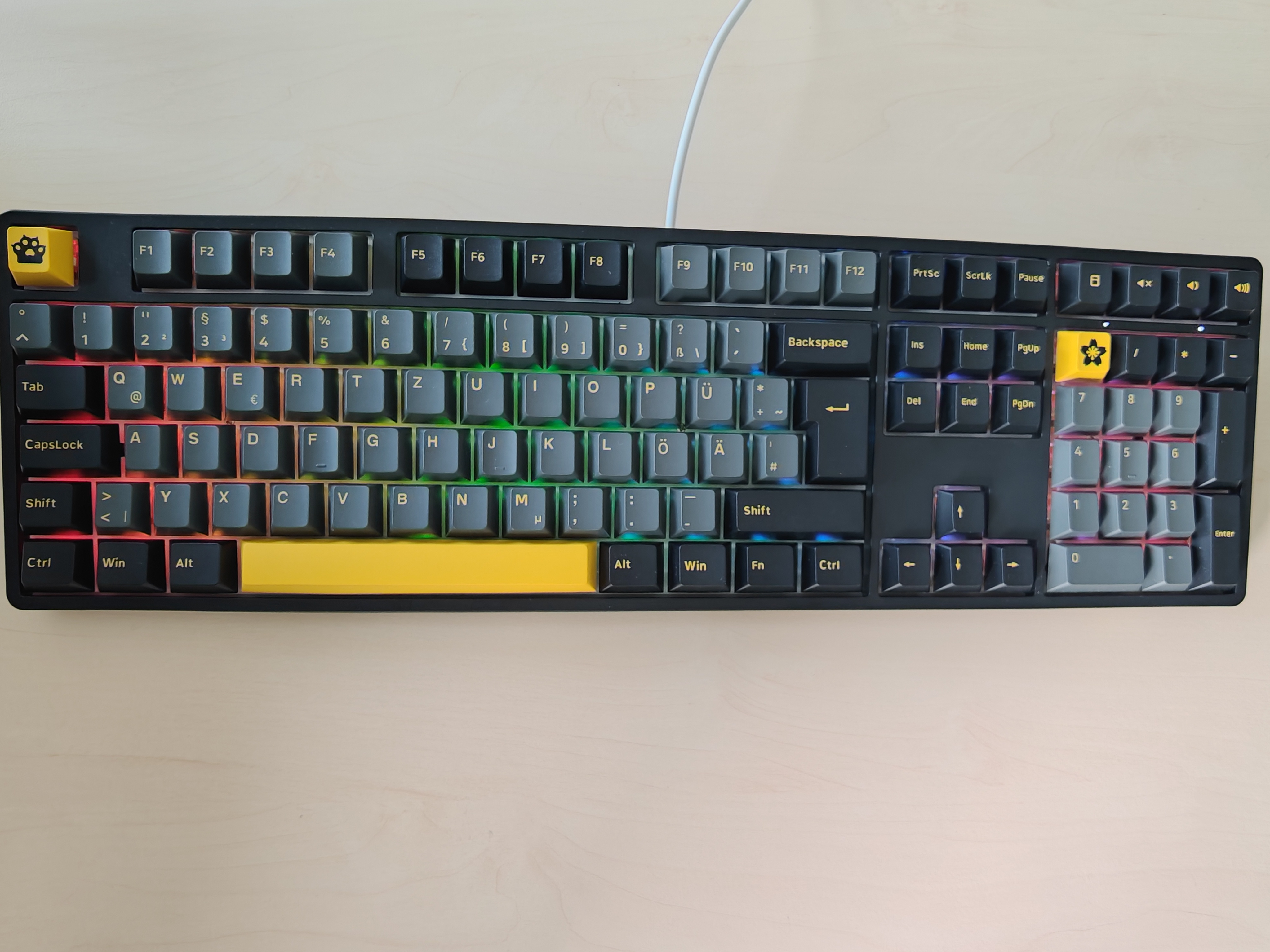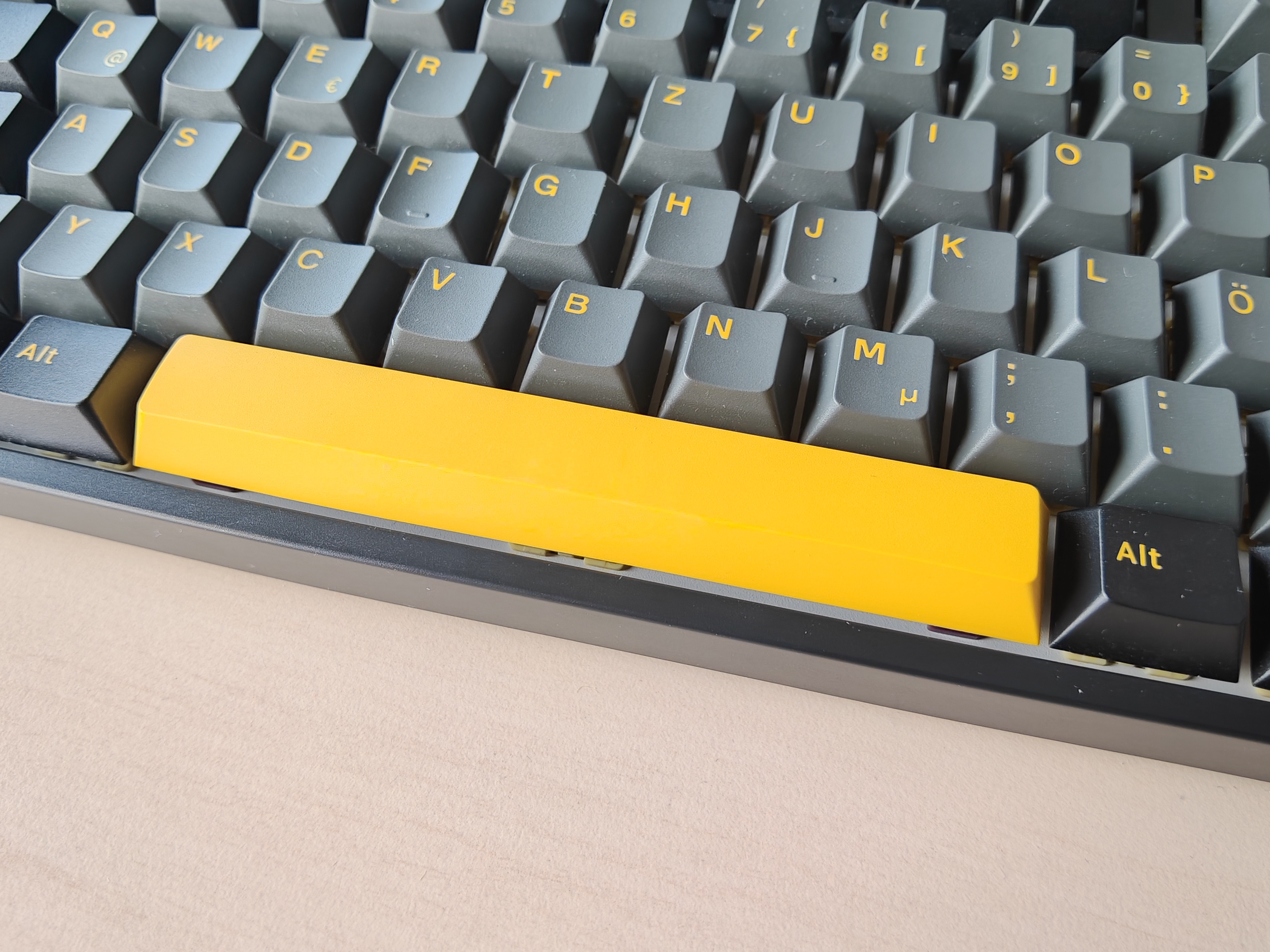 Die Creamy Yellow-Switches sind geschmiert und erhalten dadurch einen wunderbar, nun ja, cremigen, sanften Druckpunkt. Gleichzeitig fühlen sie sich dennoch präzise in ihrer Handhabung an und selbst die Geräuschkulisse bleibt für eine mechanische Tastatur im Rahmen. Ihr nehmt nur das Aufschlagen der Tastenkappen auf die Oberfläche der Tastatur wahr und selbst das wirkt leicht gedämpft.