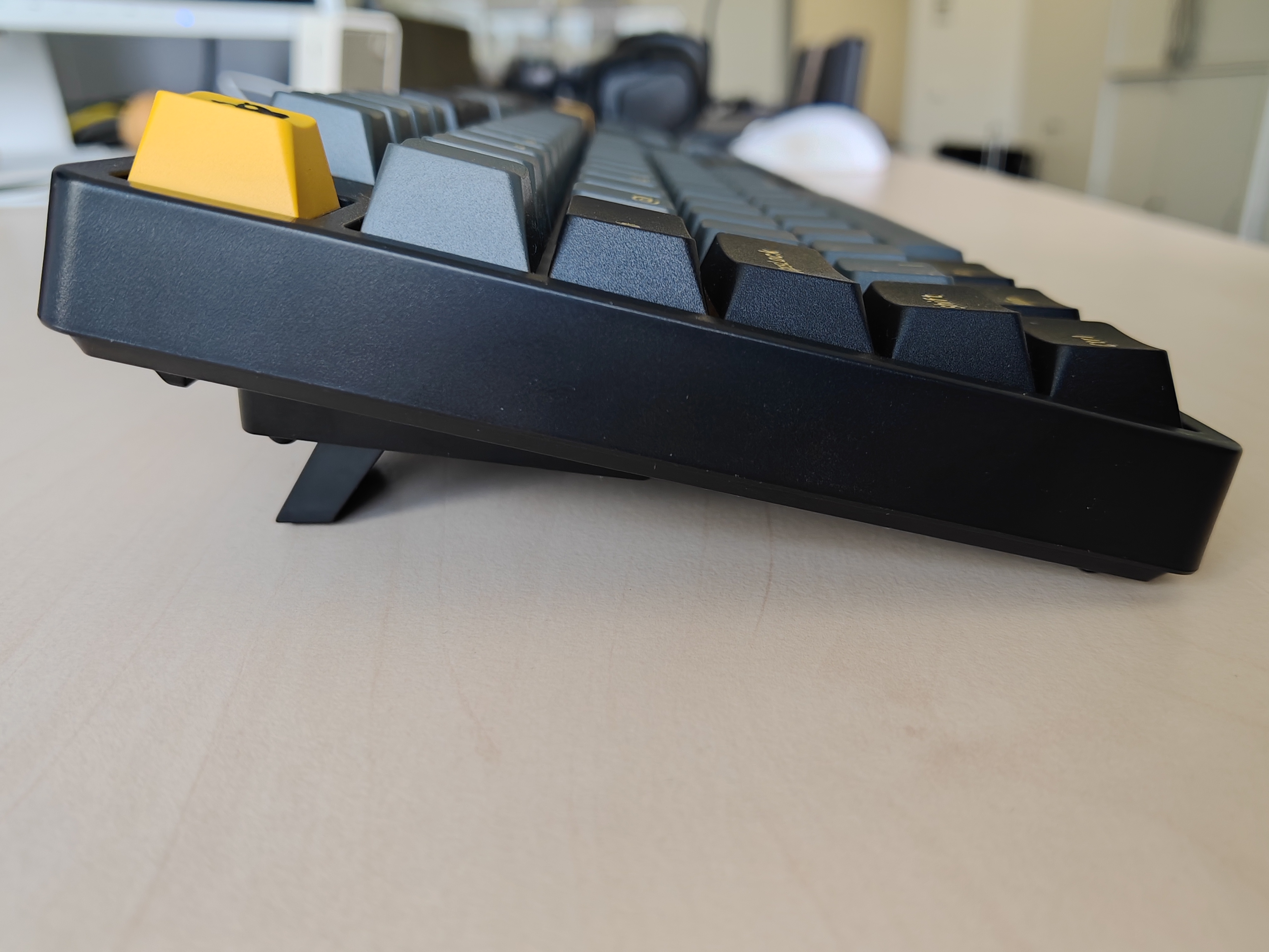 Bei der in drei Stufen einstellbaren Höhe habe ich mich fürs Gaming auf die höchste Stufe festgelegt. Beim Schreiben war jedoch die mittlere Stufe angenehmer. Anders als etwa bei der Epomaker TH99 (zum Test) wurden für die Umlaute Großbuchstaben verwendet, die sich homogen in das restliche Bild einfügen. Der Wechsel von Wireless auf kabelgebunden bei einem leeren Akku ging sauber und ohne Unterbrechung vonstatten.
