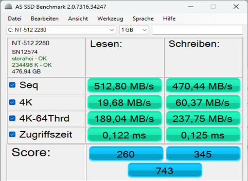 Die verbaute M.2-SSD mit 512 GB Kapazität befindet sich dauerhaft im Winterschlaf. Mit gerade einmal 563 MB/s Lese- und über 511 MB/s Schreibgeschwindigkeit enttäuscht sie auf ganzer Linie. Dennoch habe ich im täglichen Gebrauch keine besonders langen Wartezeiten erleben müssen und auch Windows 11 läuft konstant flüssig.