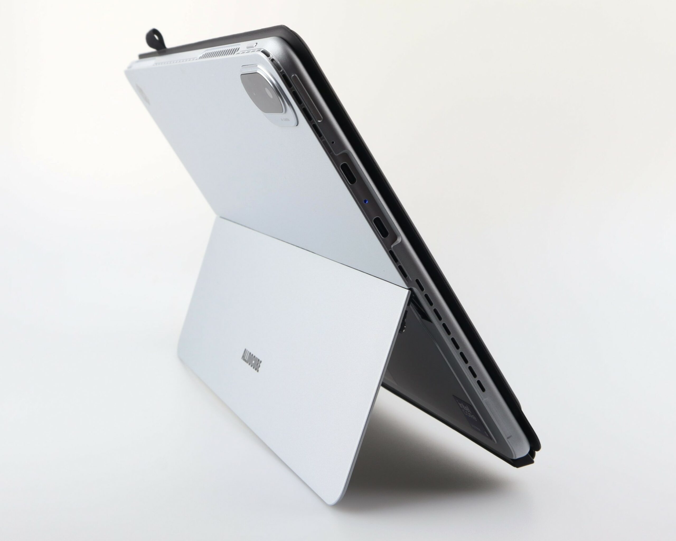 Das Alldocube iWork GT Ultra bietet für ein Tablet eine gute Anschlussvielfalt. Auf der linken Seite befinden sich zwei USB-C 3.1 Anschlüsse. Beide sind „full-function“ und unterstützen Power Delivery, Datenübertragung (10Gbit/s) sowie Display-Out. Auf Thunderbolt 4 müsst ihr trotz des Intel-Chips verzichten. Rechts sitzt ein klassischer USB-A 3.0 Anschluss, der den Anschluss von Peripheriegeräten ohne Adapter ermöglicht. Ein SD-Kartenleser oder ein Kopfhöreranschluss fehlen. Eine kleine LED befindet sich zwischen den USB-C-Ports.