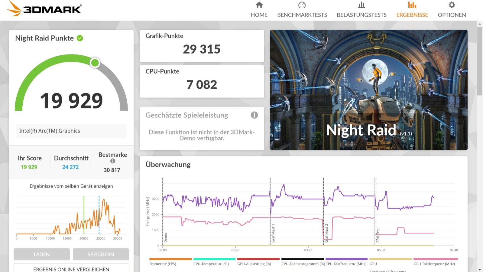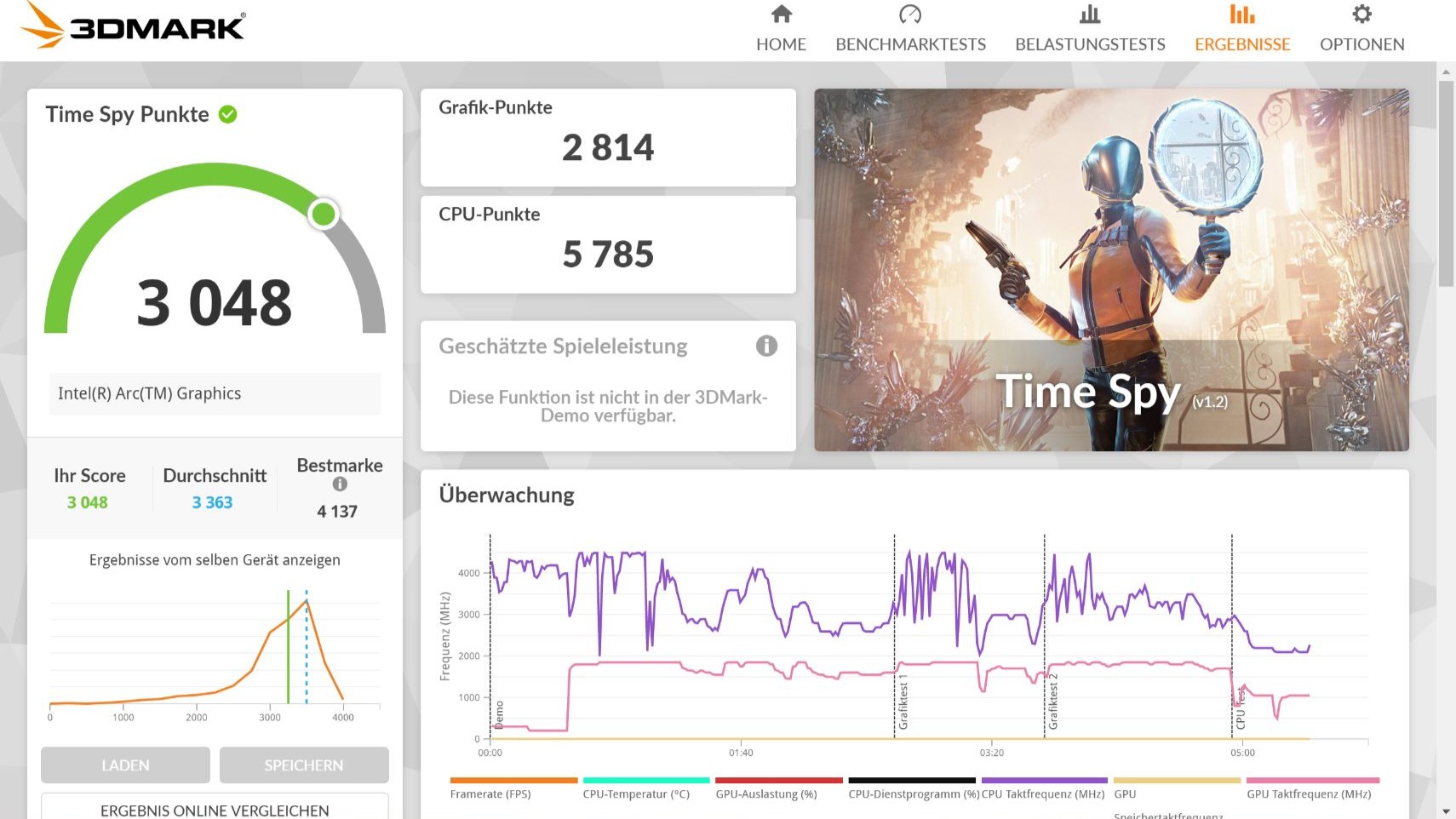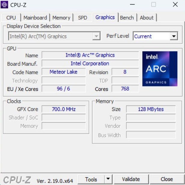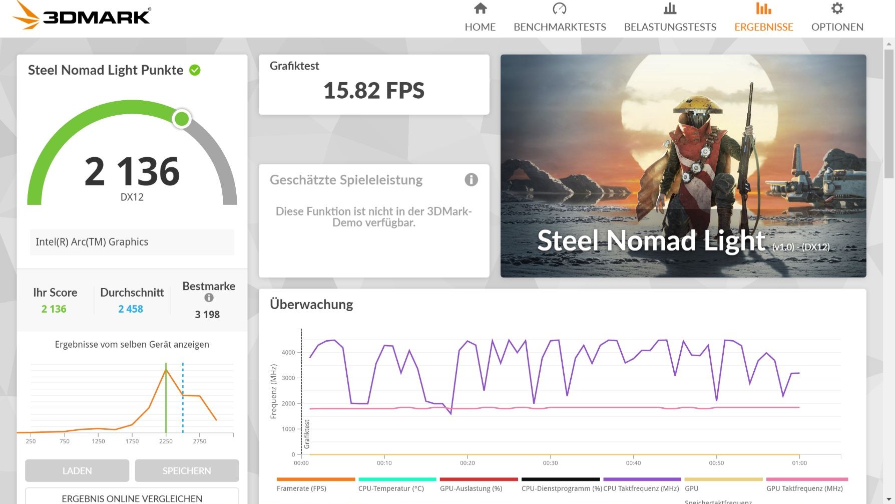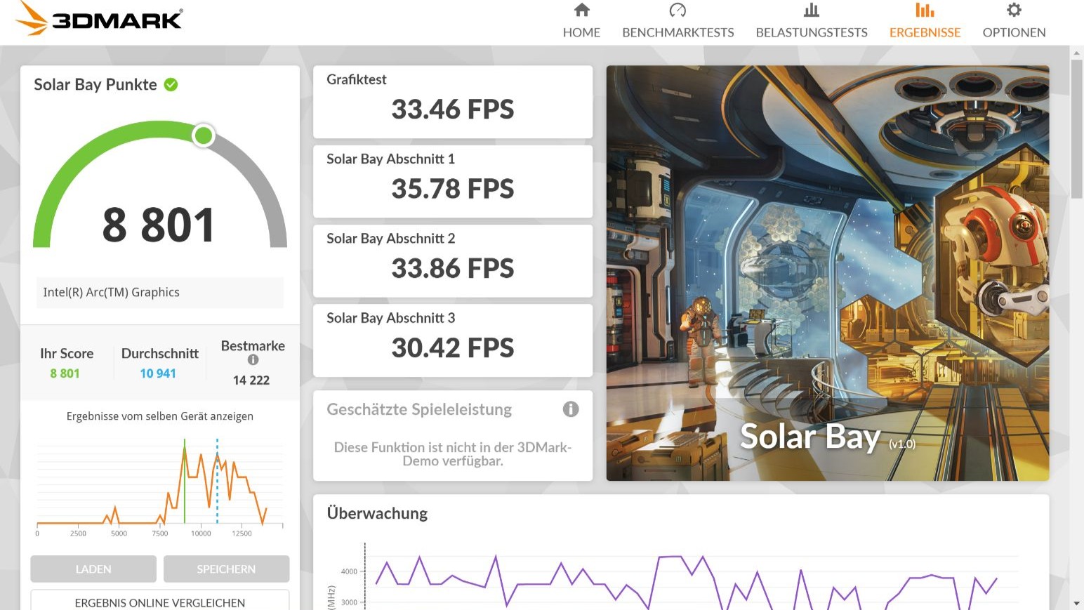 Für die Grafik ist die Intel Arc Graphics (mit 96 Execution Units / 6 Xe Kernen) zuständig. „Counter-Strike 2“ läuft in 1440 x 900 Pixel bei niedrigen Details mit 65FPS. Anspruchsvollere Titel überfordern die Hardware. Das Kühlsystem hat Mühe, die Abwärme abzuführen. Unter Last wird der Lüfter laut und gibt ein hochfrequentes Surren ab. Das Gehäuse erhitzt sich dabei spürbar, woraufhin das System die CPU-Leistung drosselt (Throttling).