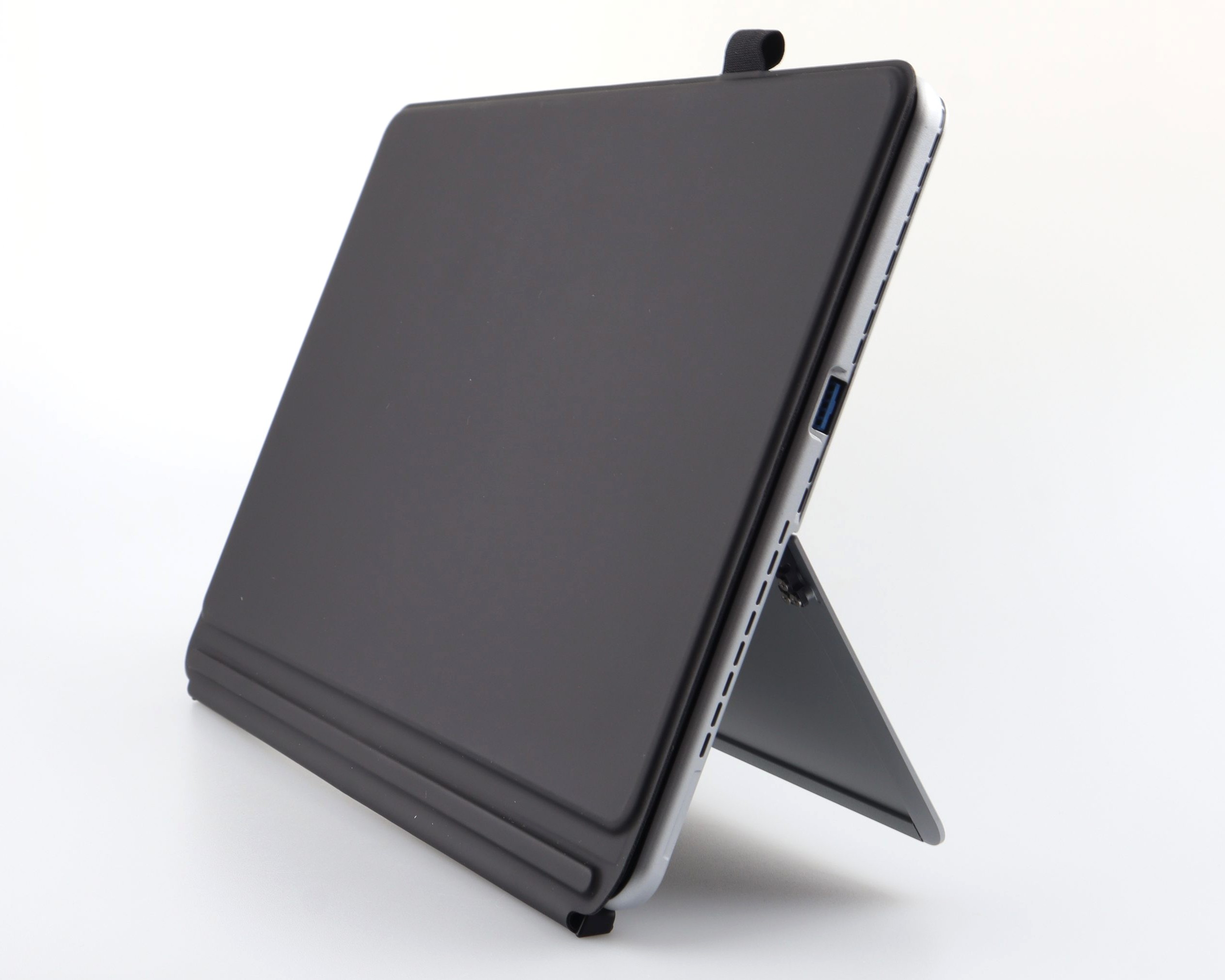 Das vollständige Metallgehäuse besteht aus einer Magnesium-Aluminium-Legierung. Die matte Oberfläche verhindert sichtbare Fingerabdrücke. Die Verarbeitung überzeugt durch saubere Kanten und gleichmäßige Spaltmaße. Die Haptik erreicht das Niveau der Surface-Modelle nicht ganz, da sich das Metall teilweise wie Kunststoff anfühlt. Der integrierte Kickstand auf der Rückseite lässt sich stufenlos bis zu 155° aufklappen. Das Scharnier ist stramm und hält das Tablet stabil, lässt sich jedoch etwas schwergängig bedienen. Auffällig sind die großen Kühlschlitze an der Oberkante und den Seiten, die für das thermische Management notwendig sind. Eine IP-Zertifizierung fehlt aufgrund der aktiven Kühlung.