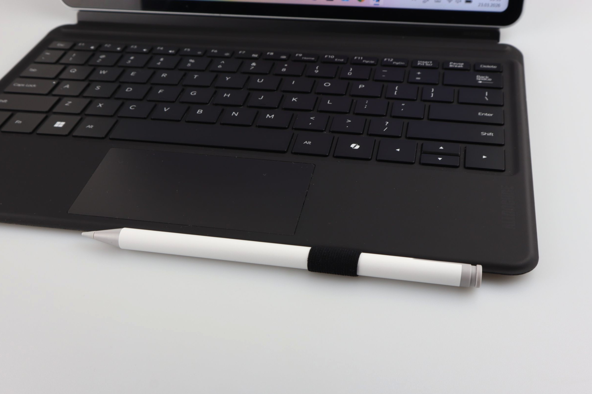 Das magnetische Tastatur-Cover dockt über Pogo-Pins an der Unterseite an. Die Verbindung ist stabil und das Cover dient gleichzeitig als Displayschutz. Die Tasten im QWERTY-Layout haben eine normale Größe, jedoch gibt das Kunststoffgehäuse beim Tippen spürbar nach. Damit ist die Nutzung auf dem Schoß nur bedingt möglich. Für kurze Texte reicht das Cover aus. Das Trackpad ist funktional, fällt aber in der Höhe klein aus. Die Navigation im Web ist nicht besonders intuitiv und flüssig. Wir hatten definitiv schon bessere Trackpads im Test.