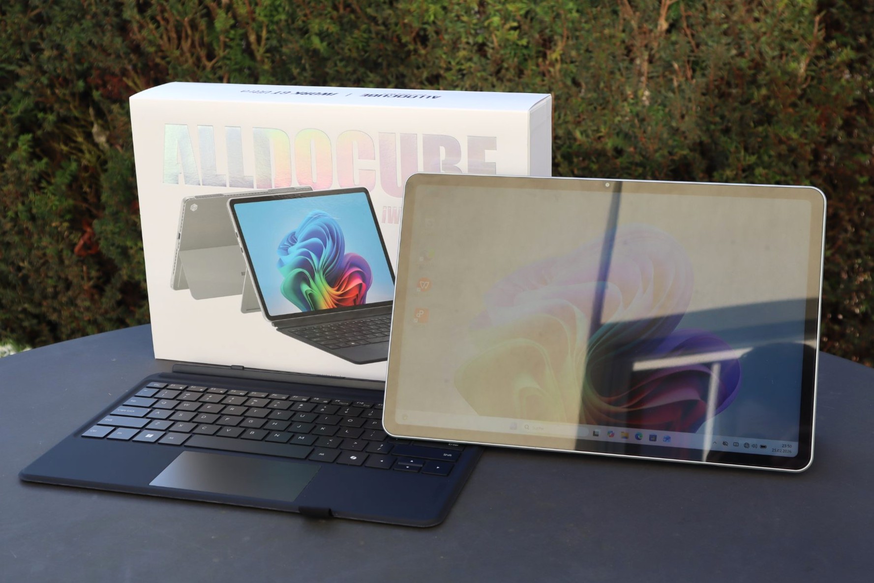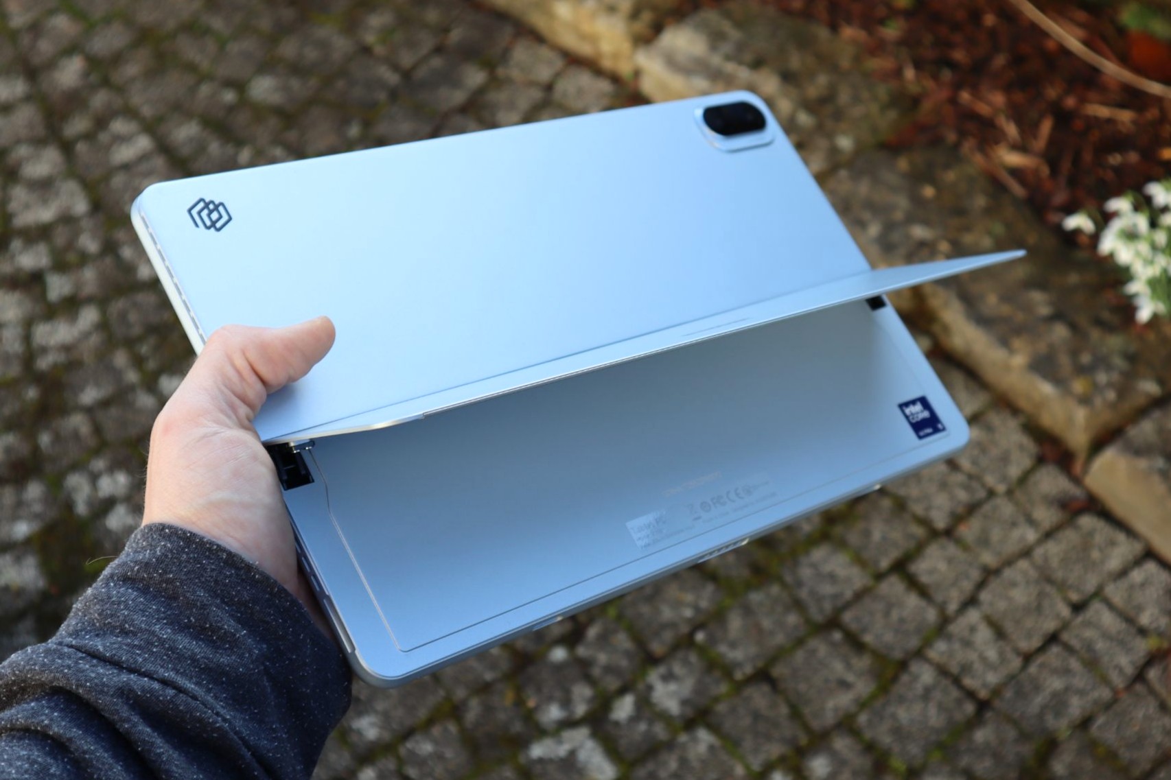 Ein Windows-Tablet mit Intel-Chip der Core-Ultra-Serie erfordert eine funktionale Bauweise. Das Alldocube iWork GT Ultra ist mit 9,89 Millimeter Dicke und 850 Gramm Gewicht (ohne Tastatur, 1255 Gramm mit Tastatur und Stylus) wuchtig. Für den Transport im Rucksack ist das unproblematisch, beim längeren freihändigen Halten ermüden jedoch die Handgelenke.