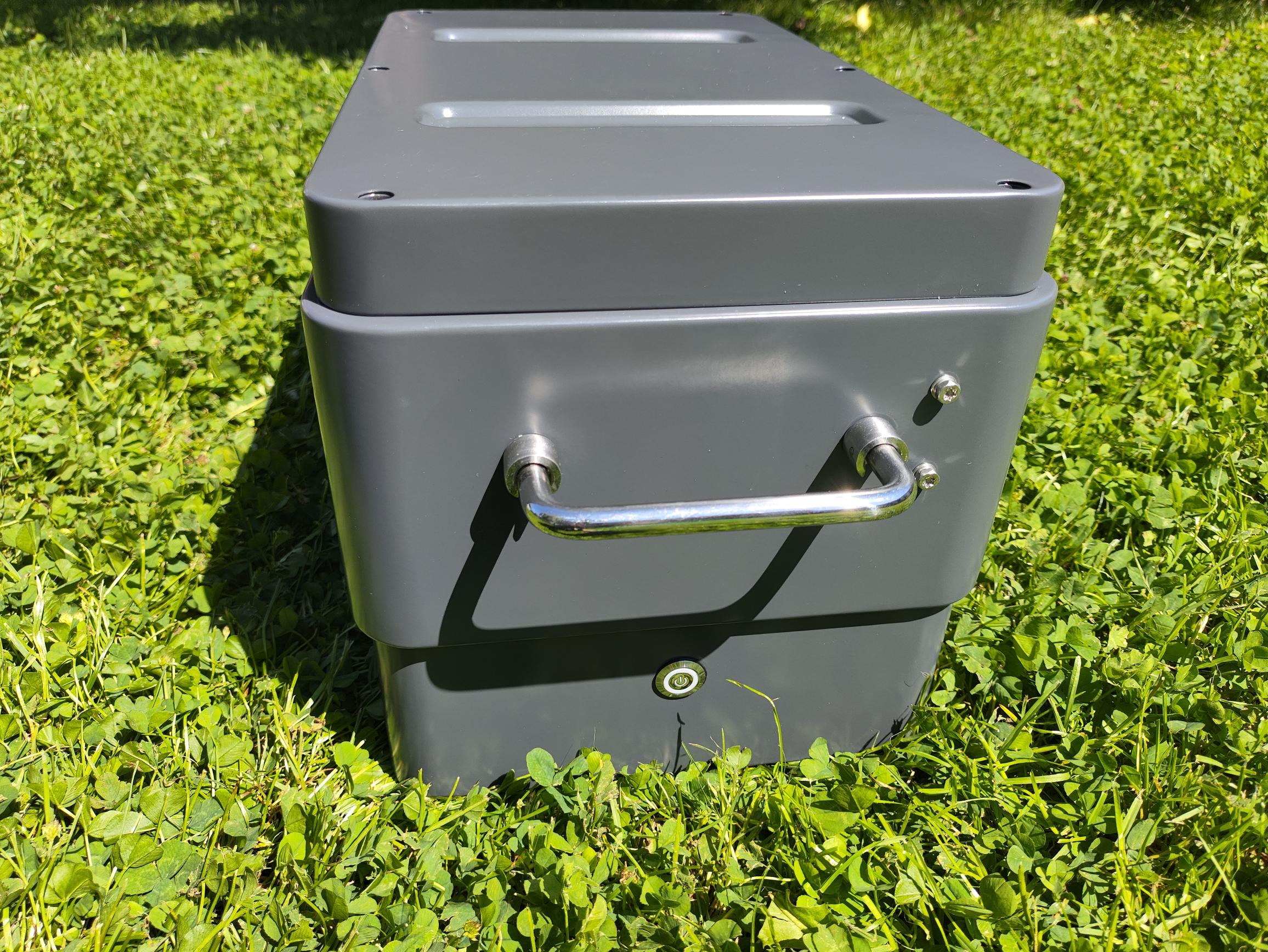 Die AlphaEss Zusatzakkus vom Typ Vitamate VM1000 bieten eine Kapazität von jeweils 1024Wh. Mit einem Gewicht von 13 Kilogramm und Abmessungen von 371 x 221 x 224 Millimeter sind diese deutlich kleiner als die Vitapower. Zudem besteht das Gehäuse vollständig aus Metall und bietet an den Seiten zwei einklappbare Tragegriffe. Die Akkus können aufeinandergestapelt werden und erweitern neben der Kapazität auch die maximale Ausgangs- und Ladeleistung der AlphaEss Vitapower.