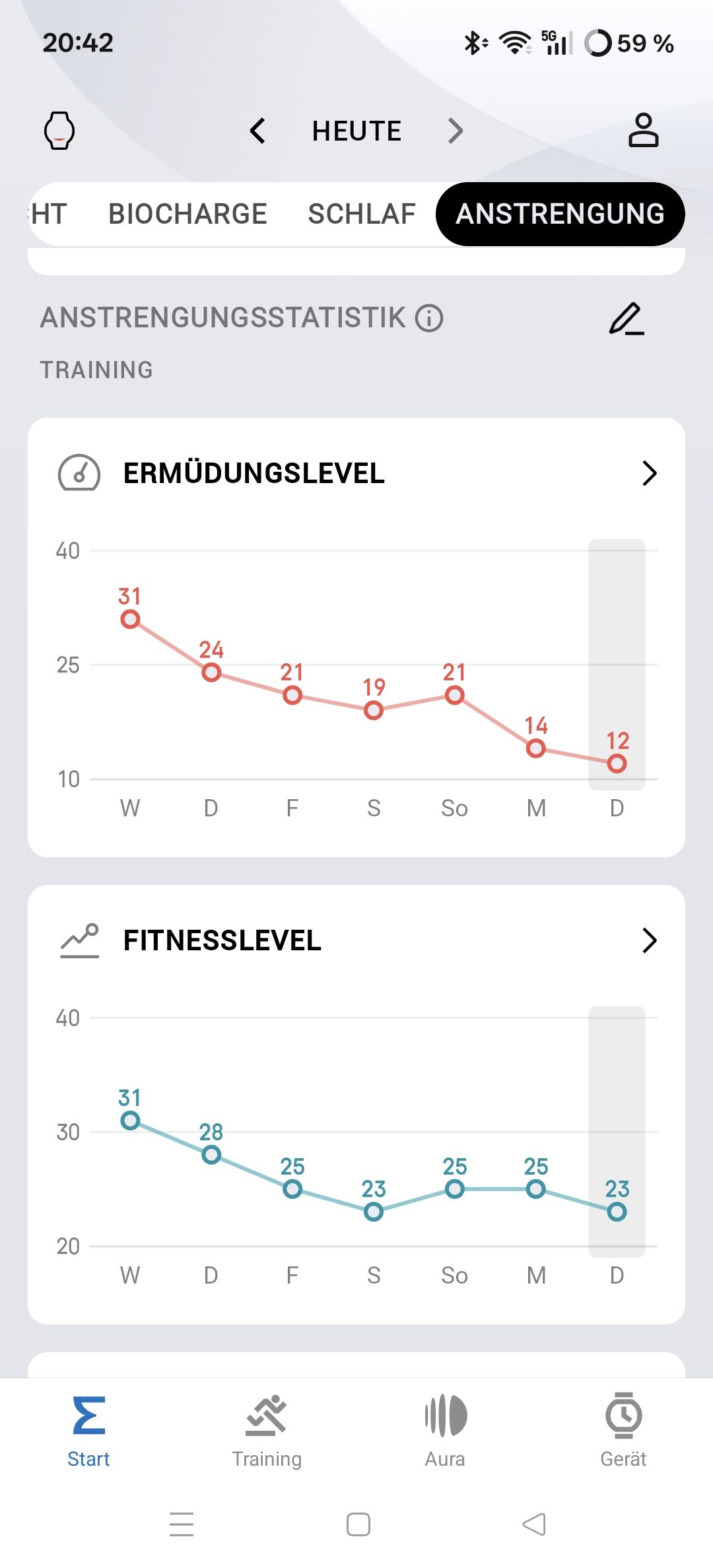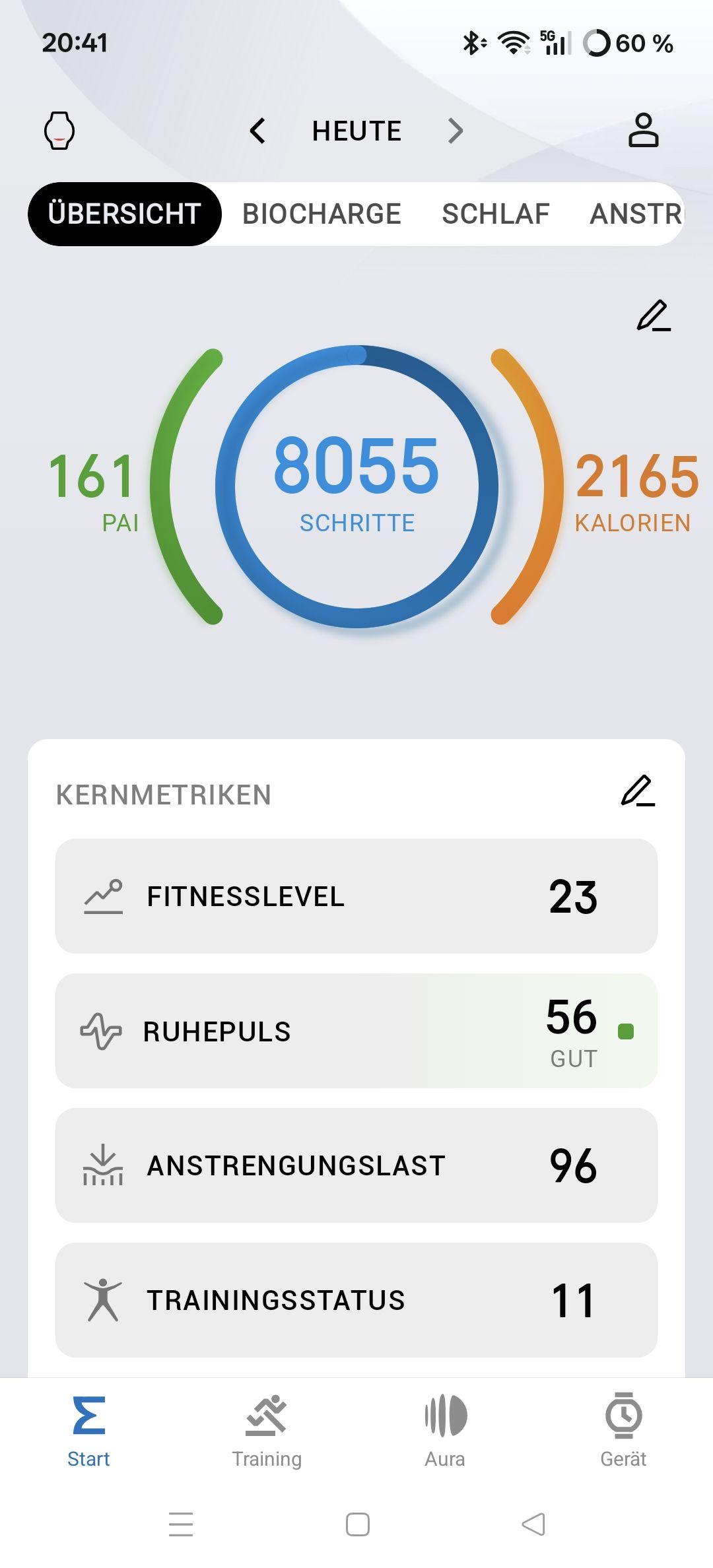Das Schlaftracking funktioniert nicht sehr zuverlässig. Das kurze Mittagsschläfchen wird oft nicht erkannt und die gemessene Einschlafzeit liegt meist um mehr als eine Stunde daneben. So interessant die BioCharge-Funktion auch ist, sie kann keine zuverlässigen Ergebnisse liefern, wenn Schlaf und Puls nicht stimmen.