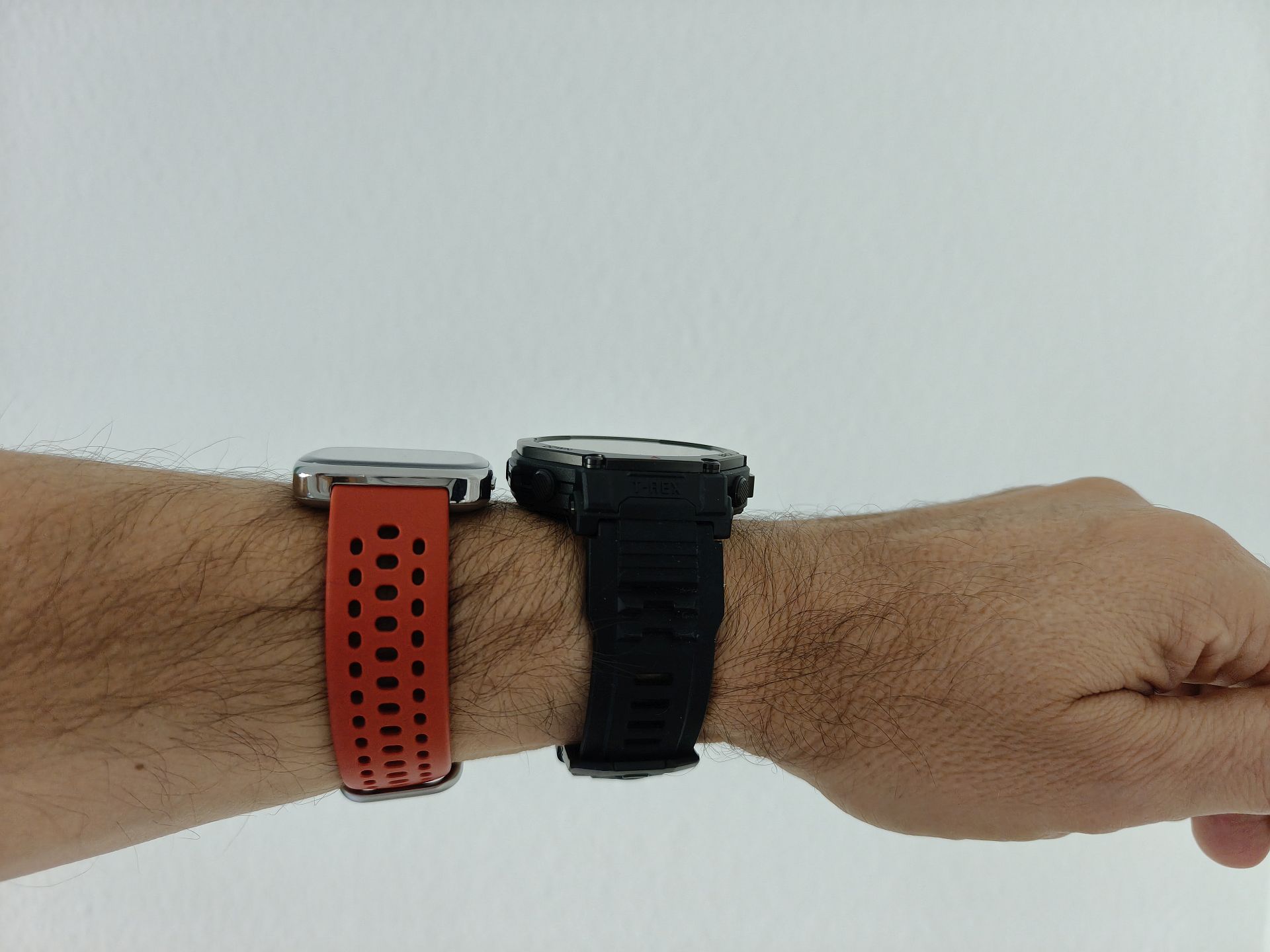 Nachdem ich mich bei der Amazfit Active 2 Square erst daran gewöhnen musste, das Armbandende nach unten hereinzuschieben, hat mich das herausstehende Ende der Amazfit T-Rex 3 Pro gestört. Um den Unterschied in der Größe mit der Amazfit Active 2 Square sichtbar zu machen, habe ich beide Uhren zusammen fotografiert.