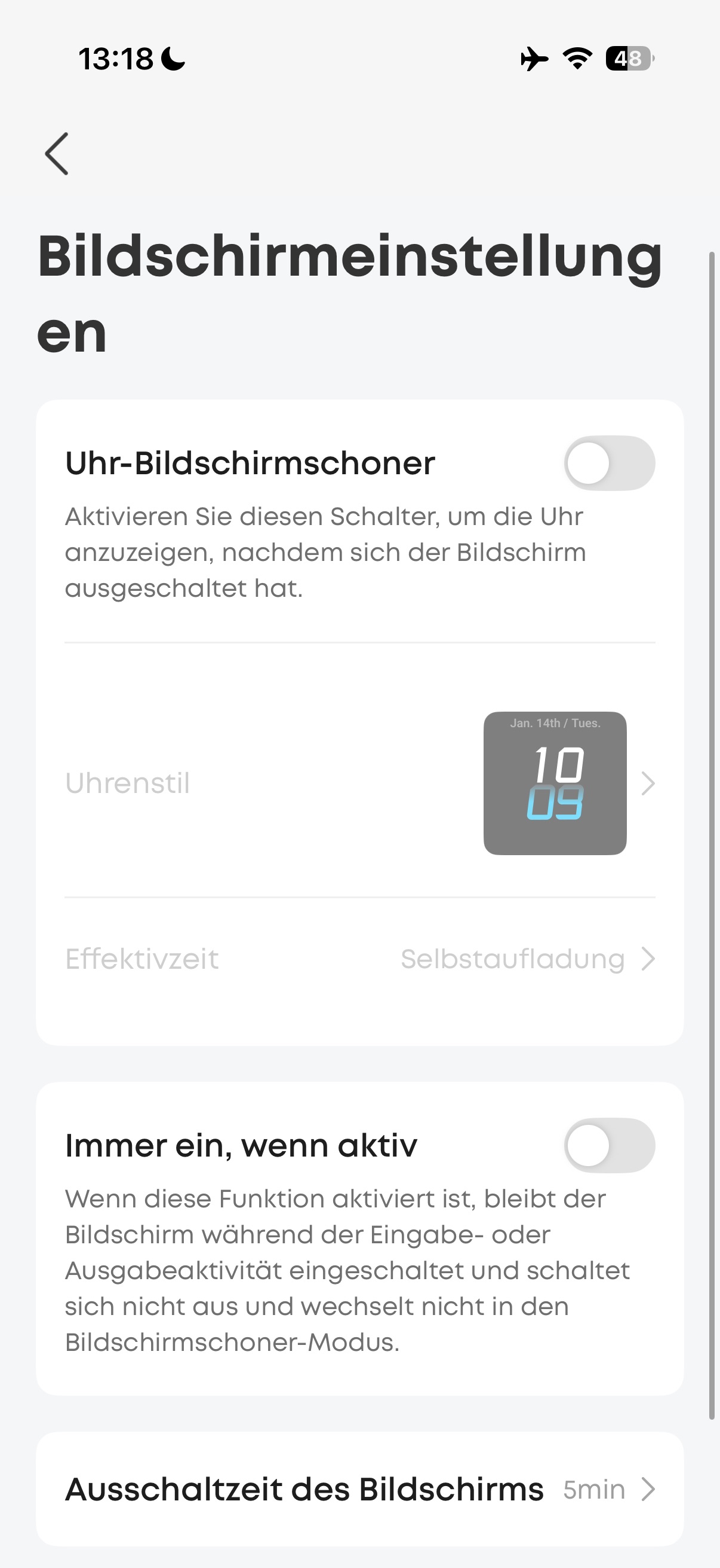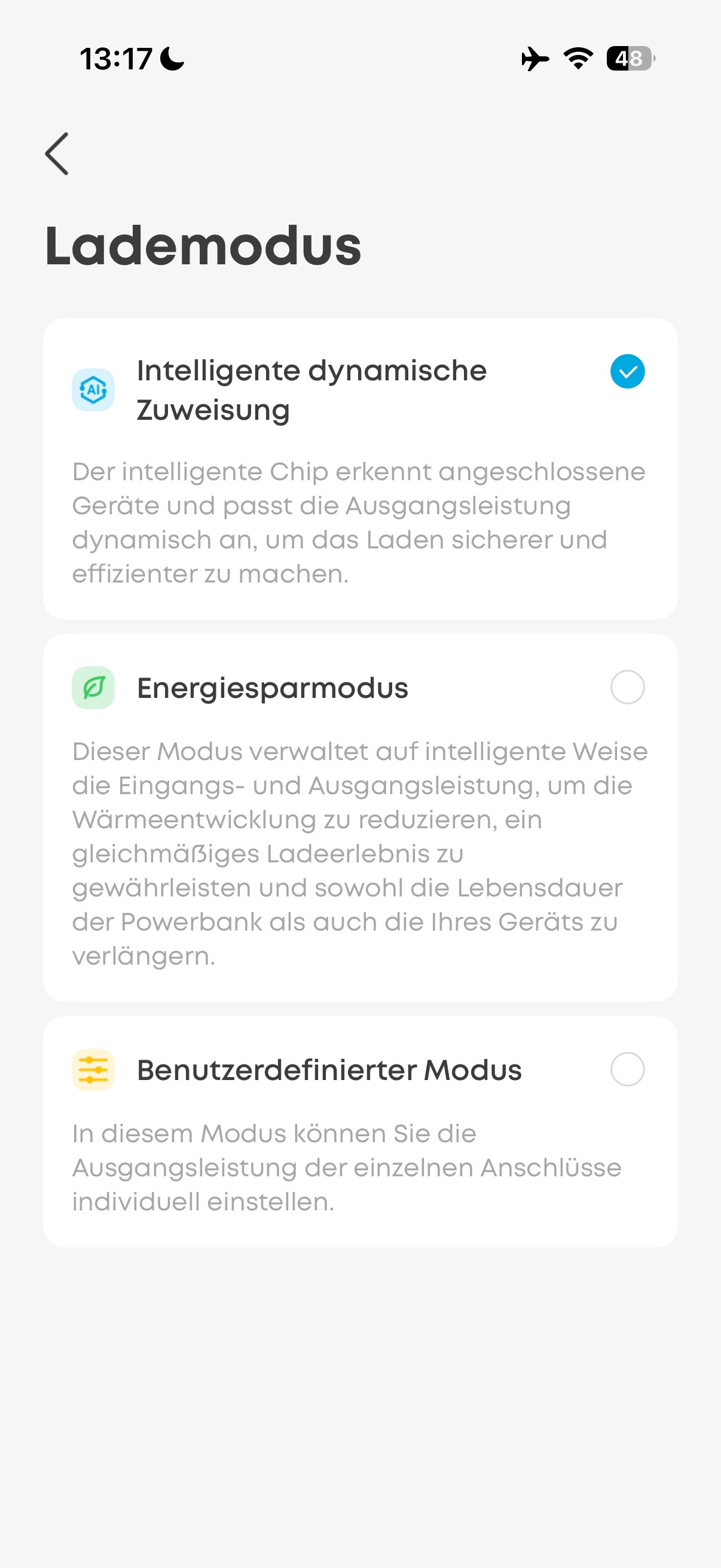 Ein Kernfeature der neuen Anker Prime 300W Powerbank sind die verschiedenen Lademodi. Standardmäßig aktiviert ist die intelligente dynamische Zuweisung. Beim Energiesparmodus drosselt die Powerbank deutlich schneller und früher herunter, um höhere Temperaturen zu vermeiden und die Langlebigkeit der Akkuzellen zu erhöhen. Interessant ist jedoch der „benutzerdefinierte Modus“, der es ermöglicht, die drei Ports der Powerbank individuell frei zu gestalten. Soll die Powerbank maximal 100W ausgeben können? Einstellbar! Der Input soll nur 50W betragen? Kein Problem. Des Weiteren können noch umfangreiche Einstellungen am Bildschirm selbst vorgenommen werden, wie die Ausschaltzeit. Das Display rotiert je nach Ausrichtung der Powerbank mit.