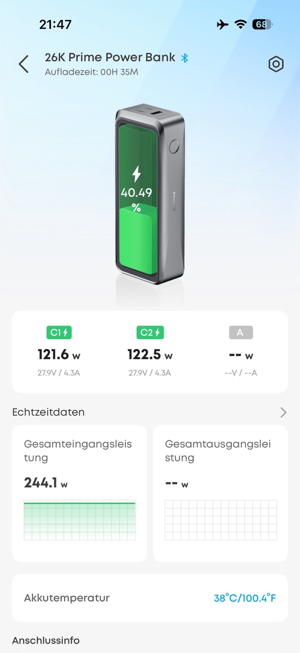 Während das Display also vergleichsweise simpel gehalten wurde, schöpft die Anker-App aus dem Vollen und bietet alle Infos auf einen Blick: Leistung in Volt, Ampere und Watt, die Temperaturen in °C oder auch Leistungskurven.
