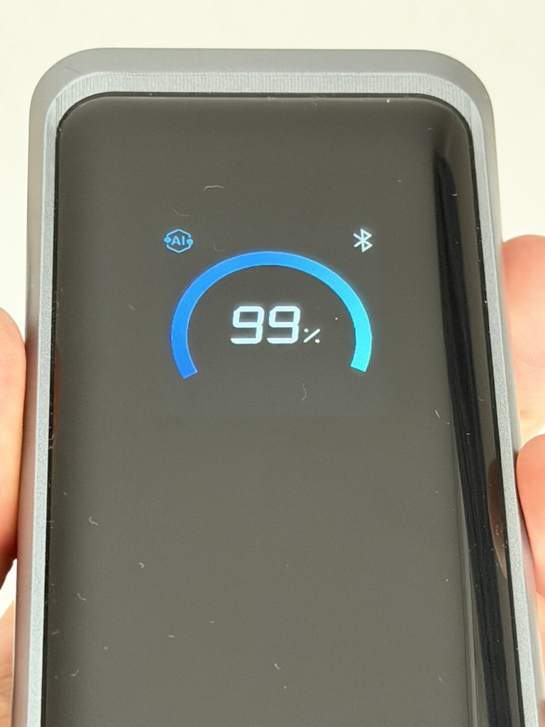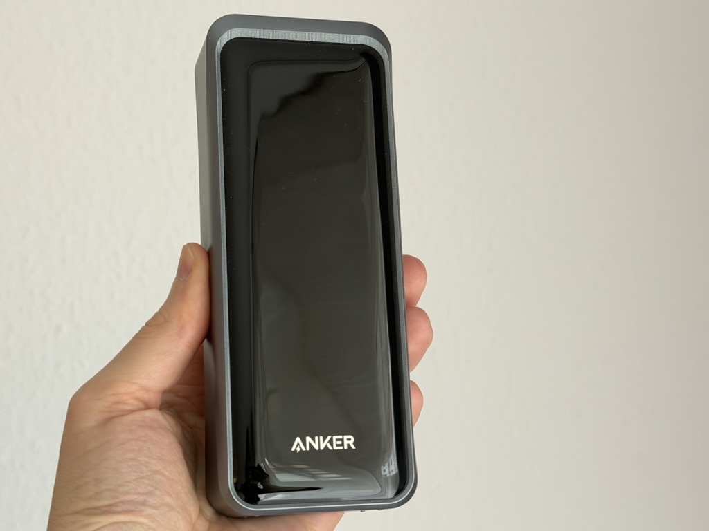 Anker bleibt sich beim Design der Prime-Modelle treu! Auf der vorderen Seite wird Hochglanz-Kunststoff verwendet, unter dem sich auch das schicke Display befindet. Das sieht zwar schick aus, aber zieht Fingerabdrücke magisch an. Die restliche Fläche setzt auf den bekannten matten, silbergrauen Kunststoff. Wie nicht anders zu erwarten, ist die Verarbeitungsqualität aus einem Guss. Erfreulich ist, dass die Powerbank trotz der gestiegenen Leistung und gleichbleibender Kapazität gegenüber dem Vorgänger geschrumpft ist.