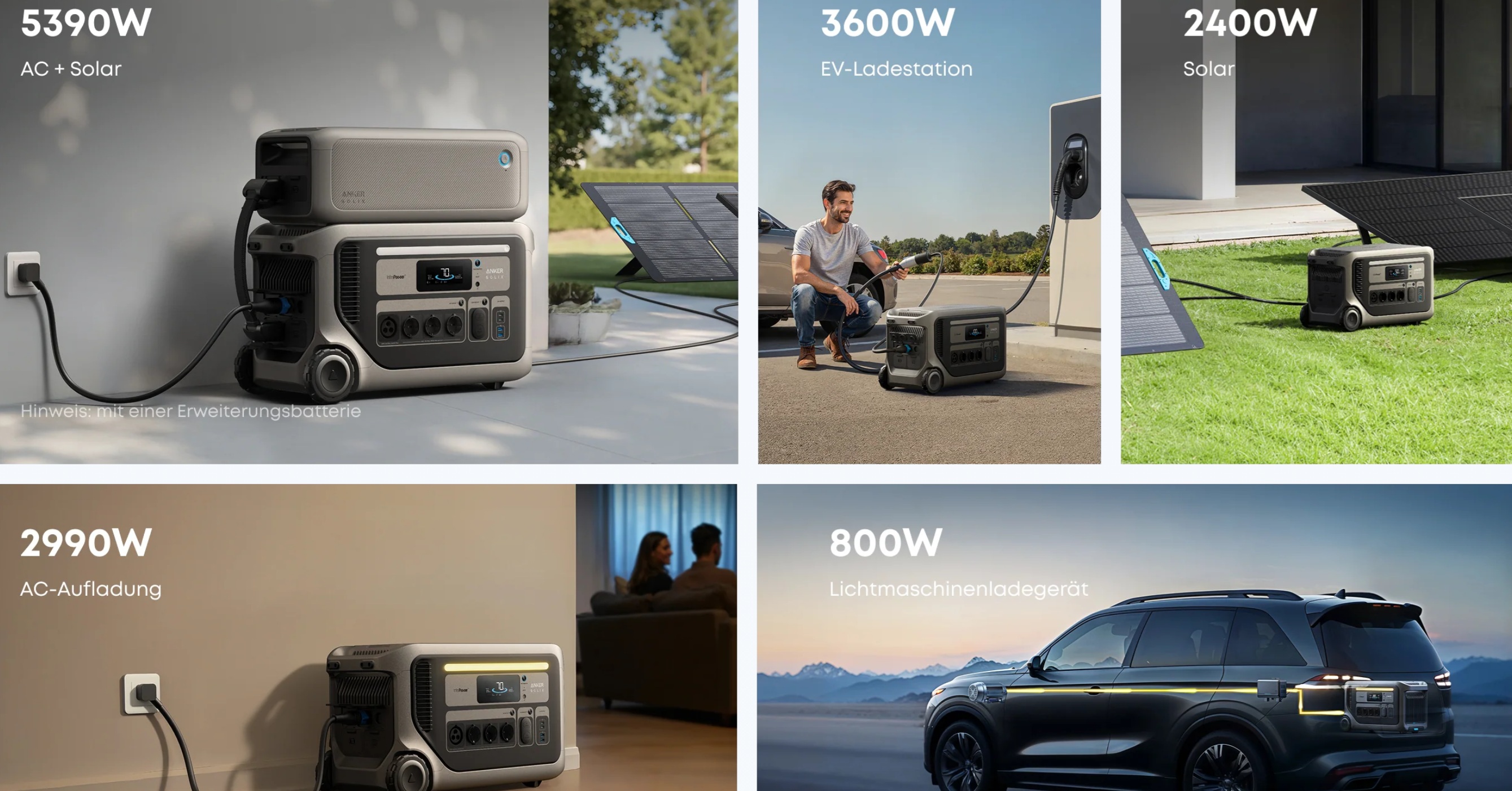 Die Anker Solix F3000 kann mit bis zu drei Zusatzakkus erweitert werden. Somit kann die Kapazität modular von 3.072Wh bis 12.288Wh konfiguriert werden. Geladen wird die Powerstation entweder über die heimische Steckdose mit bis zu 2.990W oder über die Solareingänge mit bis zu 2.400W. Hierbei steht sowohl ein Eingang für niedrigere Modulspannungen (max. 60V/800W) und ein Eingang für hohe Modulspannungen (165V/1.600W) zur Verfügung. Kombiniert ihr die AC- und Solarladung sind somit in Verbindung mit einem Zusatzakku Ladeleistungen von 5.390W möglich. Mittels des optionalen EV-Charger Kabels kann die Powerstation sogar an einer Ladesäule für Elektroautos mit bis zu 3.600W aufgeladen werden.