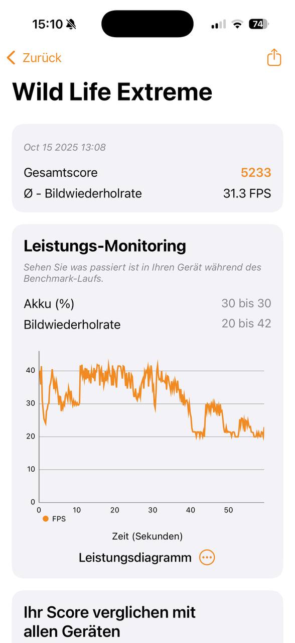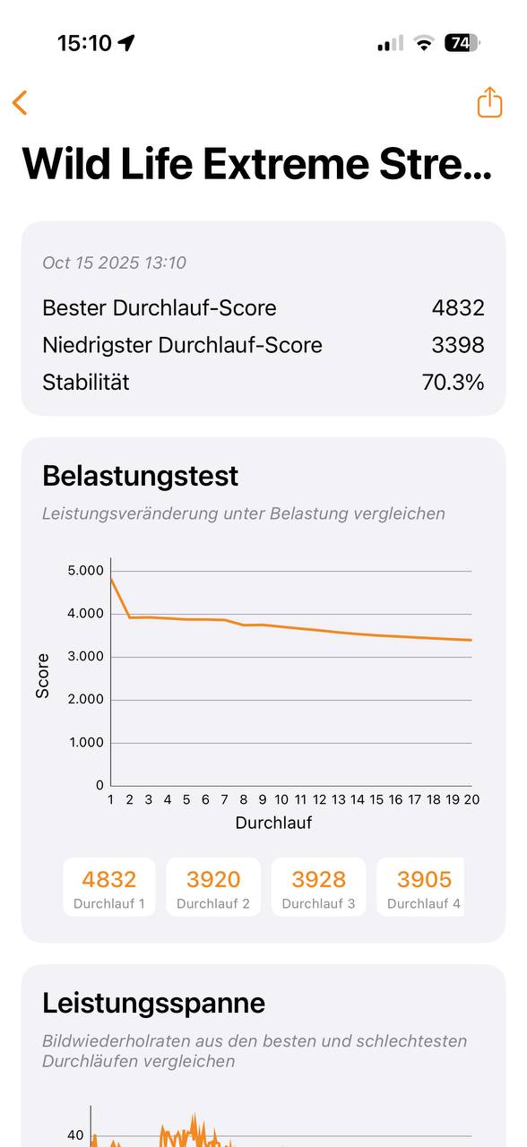 Kombiniert wird dies mit einer 16-Core Neural Engine für Apples KI-System Apple Intelligence und einer nicht näher benannten GPU. Die Neuerungen der 17. iPhone-Generation betreffen nicht nur das Unibody-Metallgehäuse, sondern auch ein neues Vapor-Chamber-Kühlsystem. Auch in der Android-Welt konkurrieren die Hersteller seit Jahren mit solchen Kühlsystemen und Flächenangaben, doch wirklich relevant sind nur aktive Kühlsysteme wie bei RedMagic. Alle anderen Smartphones mit Hochleistungschipsätzen takten bei voller Last schnell runter. Auch das iPhone ist hier keine Ausnahme, schlägt sich in den Stresstests aber gut. Beim CPU-Stresstest geht es zwar schnell, aber nur bis 70% bergab. Wie jedes andere Smartphone auch, wird das iPhone mit ca. 42°C an der wärmsten Stelle spürbar warm, aber nicht unerträglich heiß.