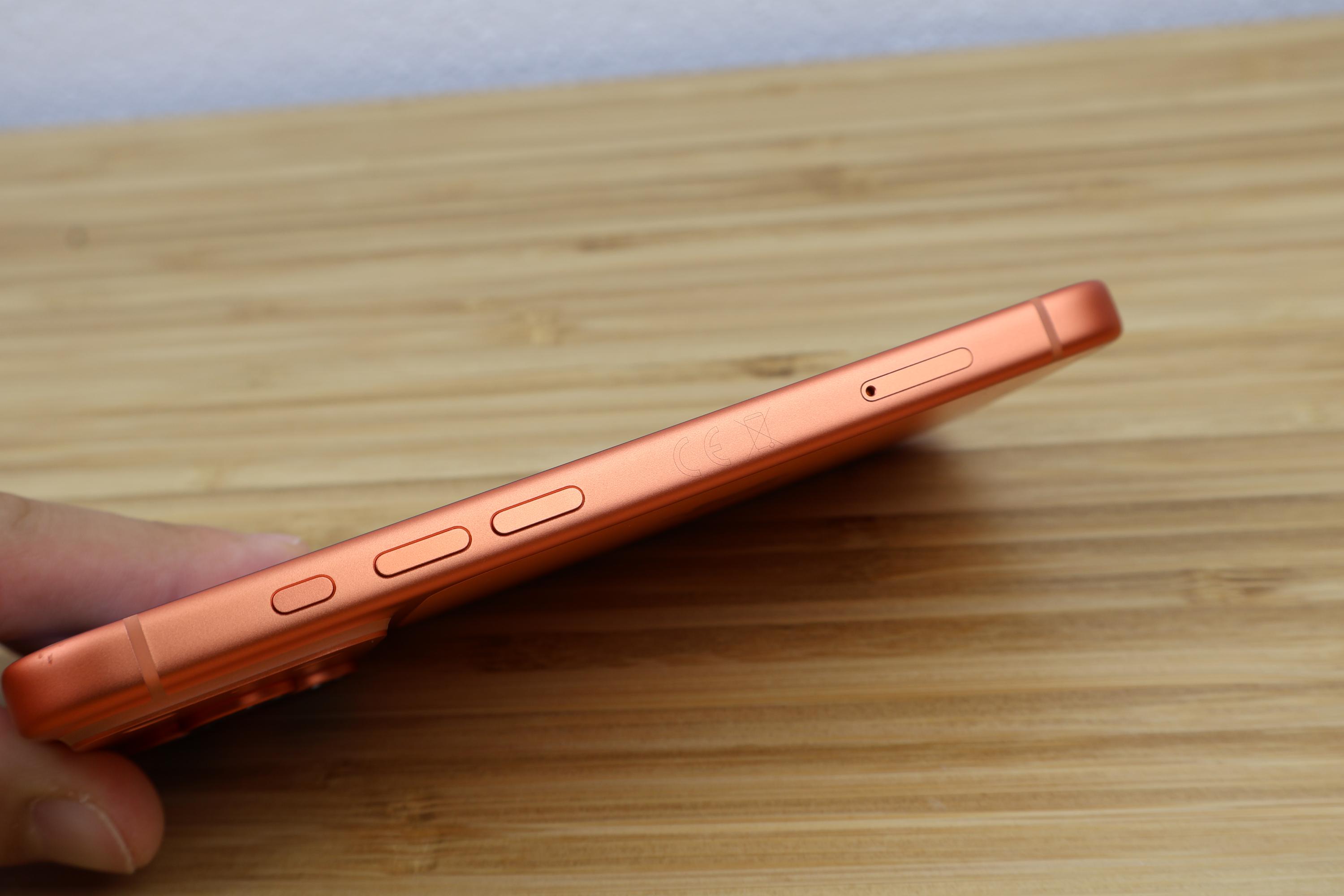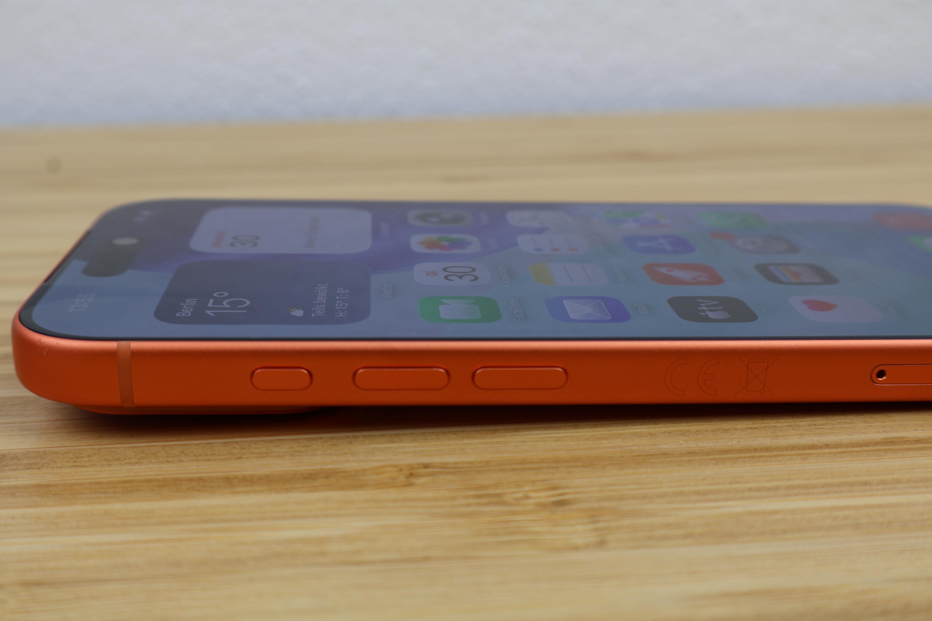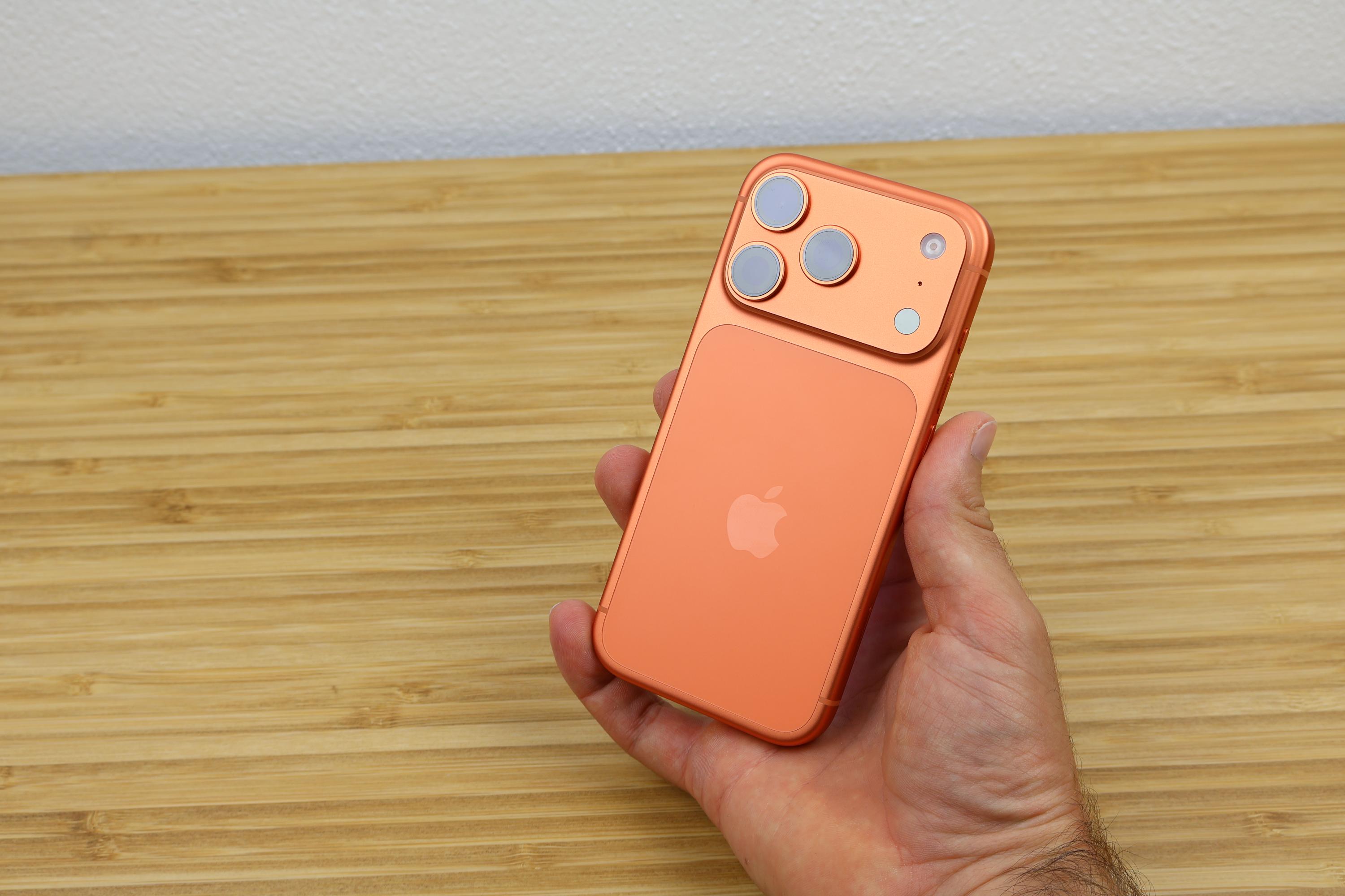 Das iPhone 17 Pro liegt auf Anhieb gut in der Hand und ist nicht rutschig. Die matten Elemente meines orangen Testgeräts sind griffig. Mit 150 x 71,9 x 8,8 Millimeter ist das iPhone 17 Pro zudem kompakt, mit 206 Gramm aber auch ziemlich schwer. Das Gehäuse komplett aus Aluminium (Unibody) wirkt einerseits altbacken, versprüht aber auch eine hohe Wertigkeit. Kleinigkeiten wie die Tatsache, dass der LED-Blitz nicht unter Glas sitzt, finde ich allerdings unangemessen. Der Kunststoff verkratzt leicht, wenn das Smartphone im Rucksack liegt. Aber immerhin gibt es mal ein neues Design von Apple, auch wenn dafür diesmal kein Edelstahl oder Titan verwendet wurde. Denn das Unibody-Aluminiumgehäuse ist zurück. Das iPhone 17 Pro wirkt wie aus einem Guss und ist perfekt verarbeitet. Besonders auffällig, filigran oder speziell ist nichts am Gerät. Lediglich die vielen Buttons fallen auch nach drei Wochen Nutzung noch auf – ob nun positiv oder negativ, müsst ihr selbst entscheiden. Der Glasteil der Rückseite wirkt im gesamten Design unrund und auch die breite Kamerainsel über die gesamte Rückseite ist überflüssig. Die Kamerainsel selbst steht 2,5mm aus der Rückseite hervor, wobei die drei einzelnen Kamerasensoren jeweils noch einmal 1,8mm mehr herausragen. Damit liegt das iPhone trotz durchgehendem Kamerahügel ohne Hülle kippelig auf dem Tisch. Mit Hülle ist das kein Thema mehr.