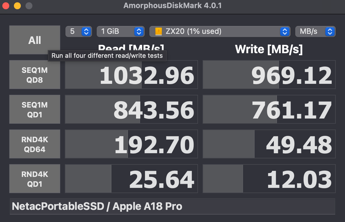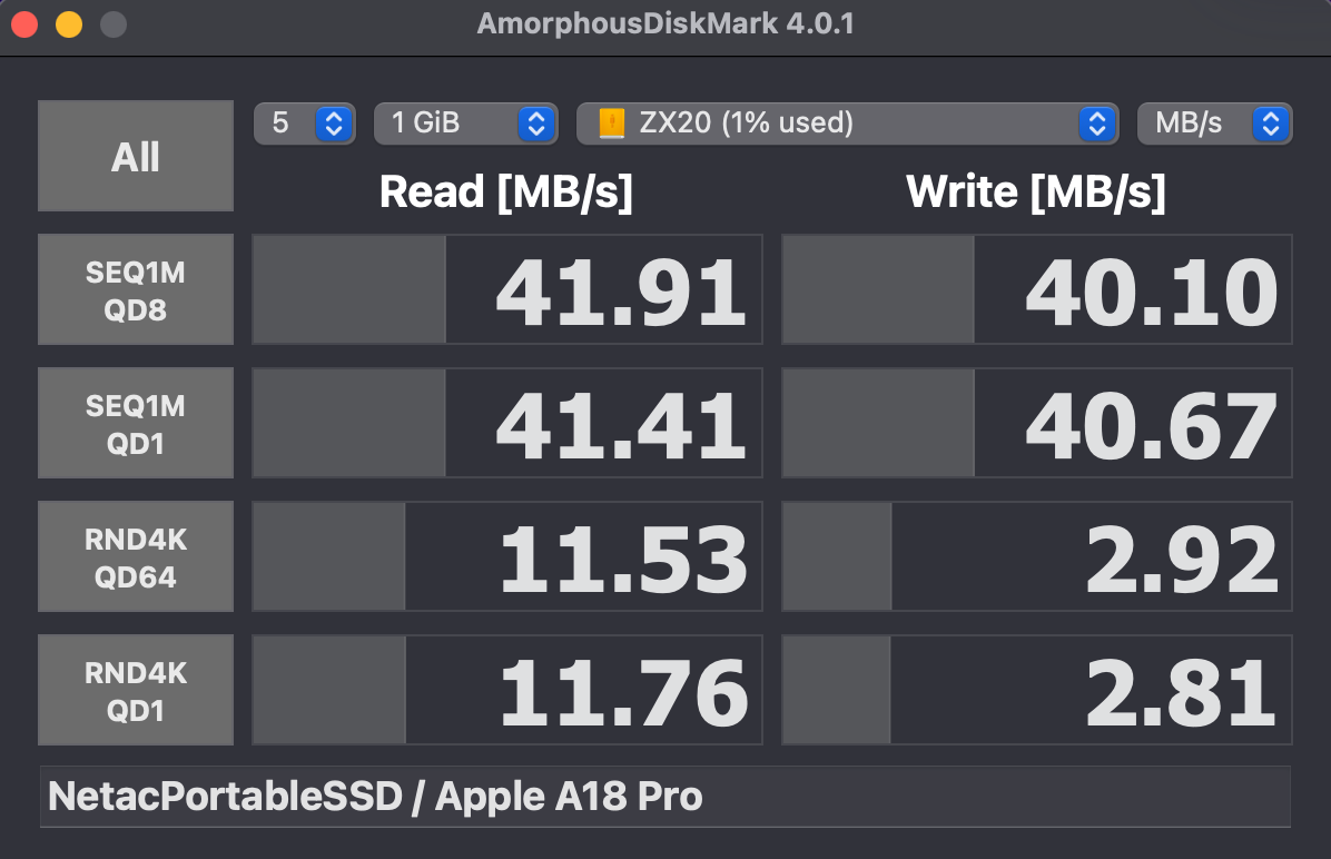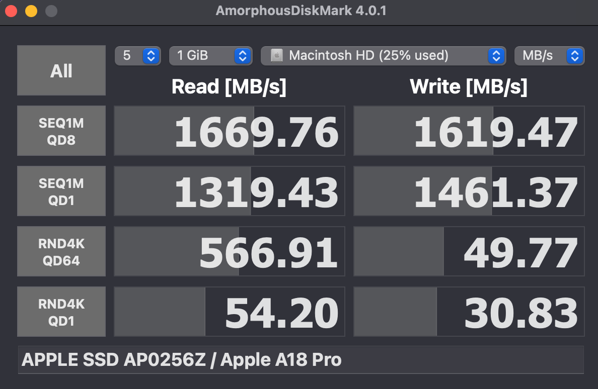 Hier liefert das MacBook Neo ein durchwachsenes Ergebnis, denn sowohl die interne SSD als auch der USB-C 3-Anschluss (10Gbit/s) agieren vergleichsweise gemächlich. Die gemessenen Übertragungsraten sprechen eine eindeutige Sprache. Lediglich der obere Port unterstützt bis zu 10Gbit/s, während der zweite Anschluss nur USB-2.0-Niveau bietet. Glücklicherweise weist euch das Betriebssystem darauf hin, falls ihr den langsameren Port nutzt. Das Notebook unterstützt WLAN 6, einen modernen Standard, der mit starkem Empfang punktet. Selbst durch drei Wände hindurch blieb die Verbindung stabil und der Datendurchsatz hoch. Bluetooth 5.3 arbeitet zuverlässig und unauffällig. Sämtliche externen Komponenten wie Maus, Tastatur oder Kopfhörer ließen sich im Test problemlos koppeln.