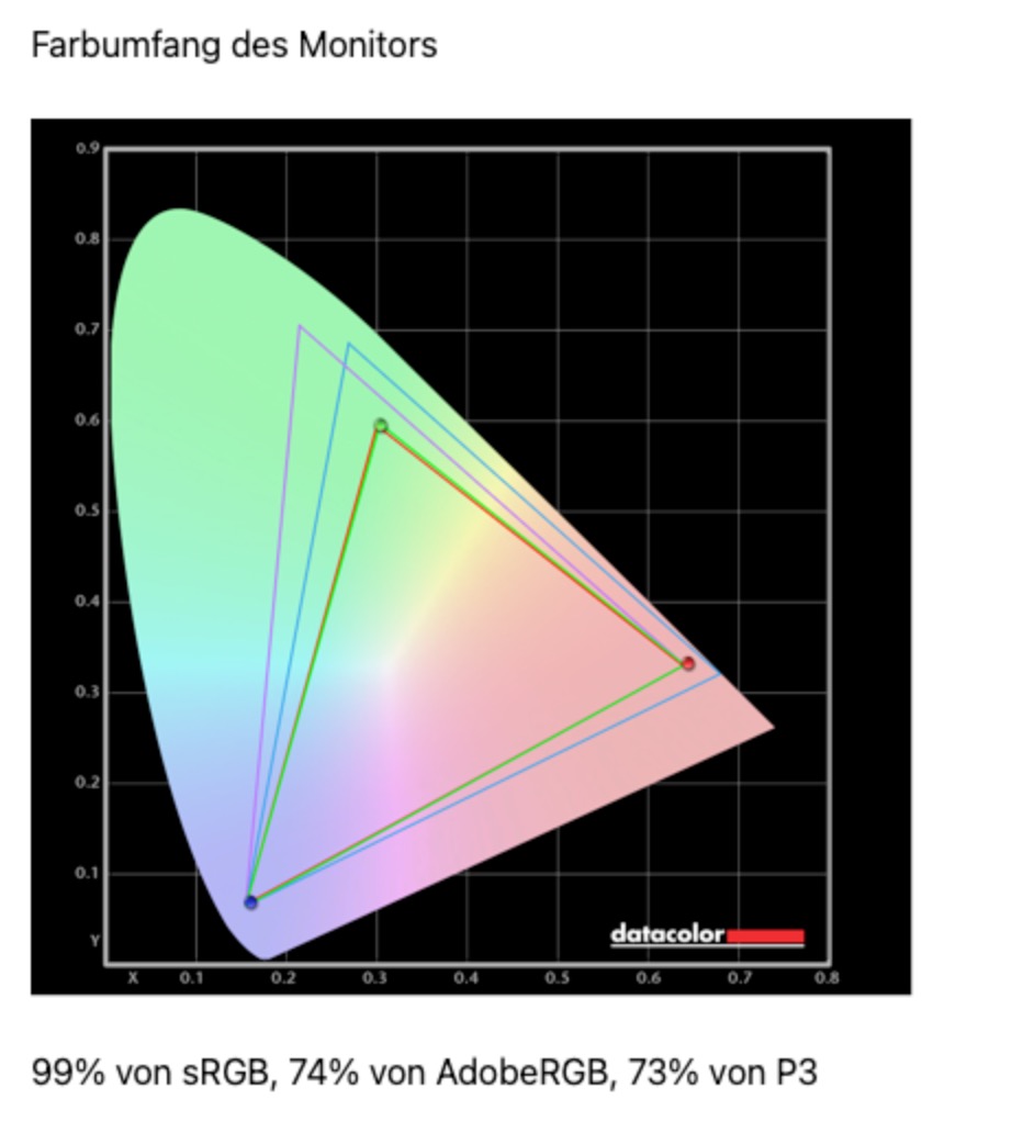 Diese wird nur knapp verfehlt. Das Notebook eignet sich dennoch gut zur Bildbearbeitung, da der Gamma-Wert von 2,2 ab Werk exakt getroffen wird. Zudem ist der Bildschirm homogen ausgeleuchtet und der Kontrast hoch, ebenso wie die maximal gemessene Helligkeit von 492 Lux. Diese lässt sich automatisch regulieren, was bei vielen Windows-Notebooks fehlt. Ebenso integriert Apple mit „Night Shift“ eine Technologie zur Reduzierung des Blaulichtanteils bei Nacht. Verschiedene Farbprofile ab Werk sind ebenfalls nicht selbstverständlich. Bis auf die geringe Bildwiederholfrequenz und die glänzende Oberfläche ist das Display des MacBook Neo einwandfrei.