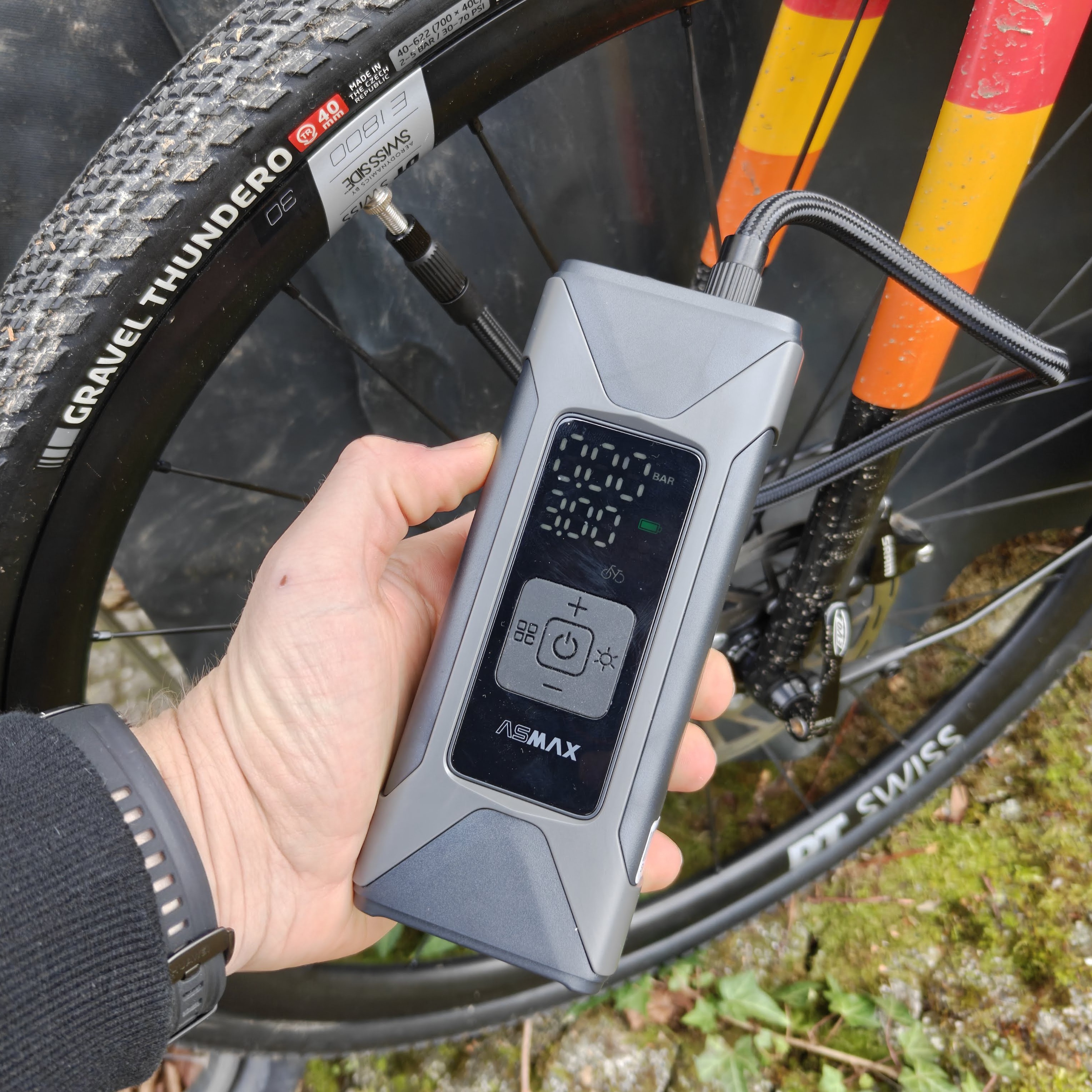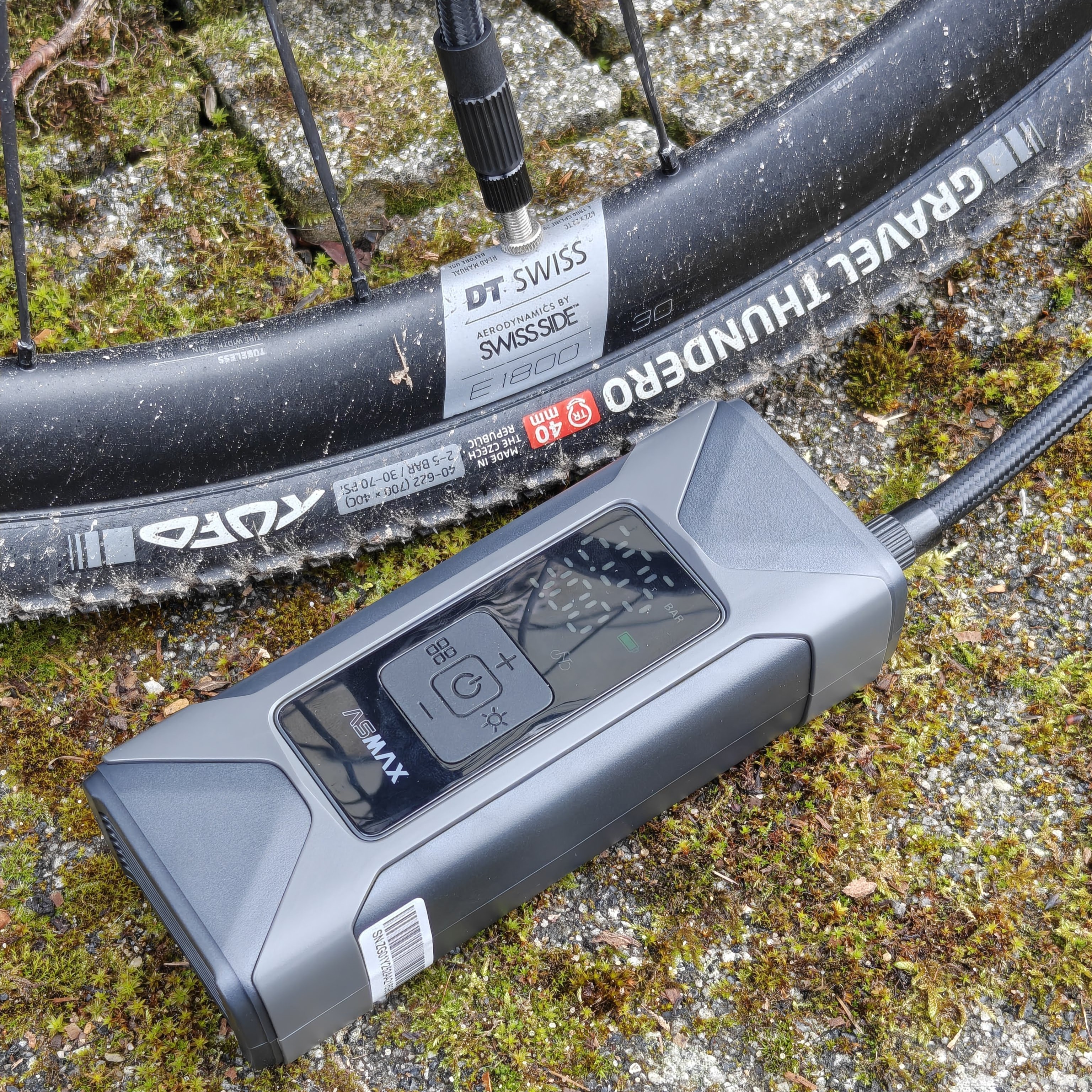 - Hochdruck: Wir haben versucht, einen Schwalbe Tire Booster (für Tubeless-Montage) aufzupumpen. Ab 5 Bar tut sich der Motor der Asmax hörbar schwer. Für die Füllung bis auf 8 Bar benötigte sie gut zwei Minuten (Xiaomi: ca. 1 Minute).