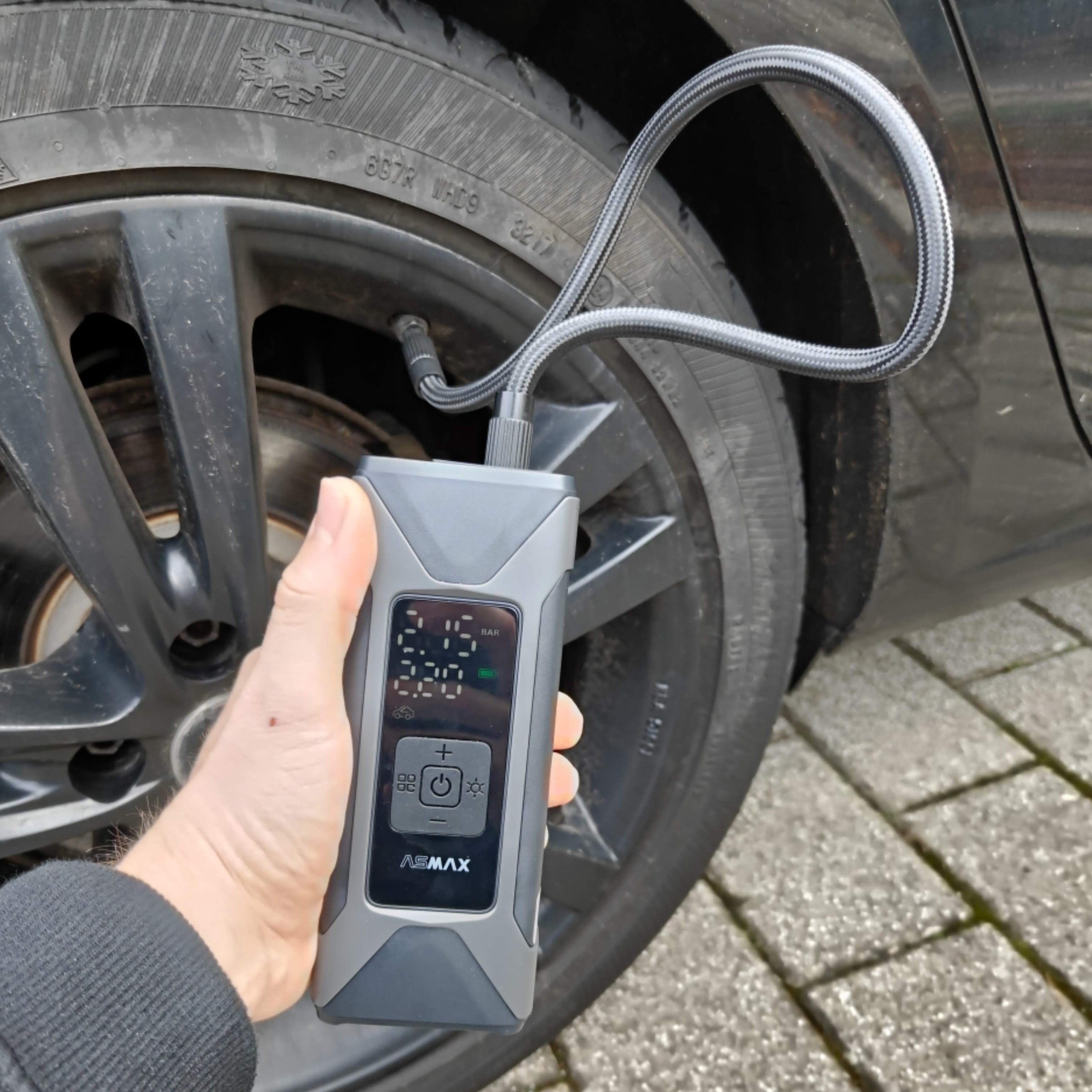 - Autoreifen: Um einen 17-Zoll-Autoreifen komplett zu füllen, benötigt die Asmax T10 rund 7 Minuten. Das ist eine Geduldsprobe, denn die kleine Xiaomi erledigt das in knapp 5 Minuten.
