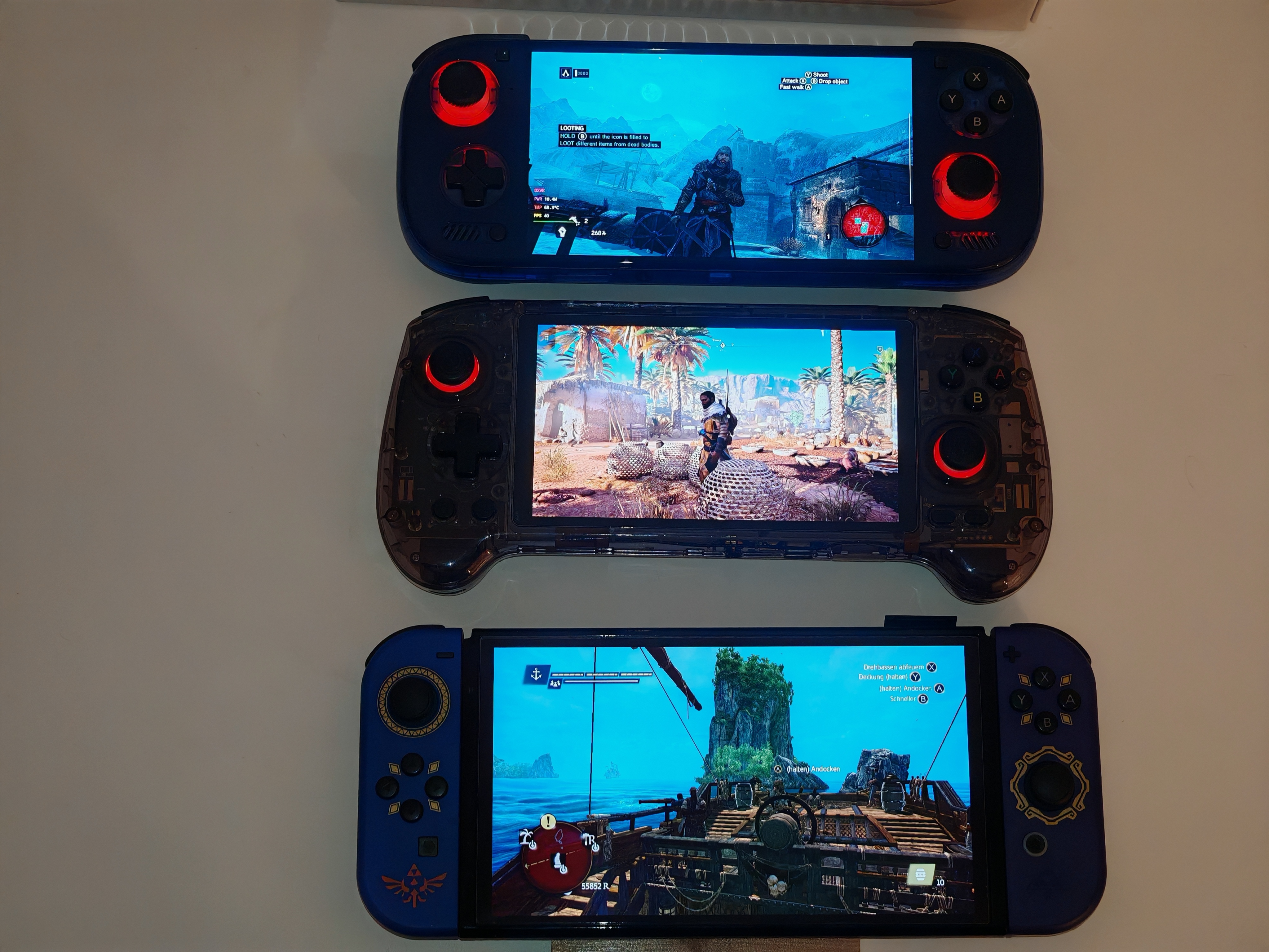 - Oben AYN Odin 3, Mitte Rg557, unten Nintendo Switch (innen) – max. Helligkeit