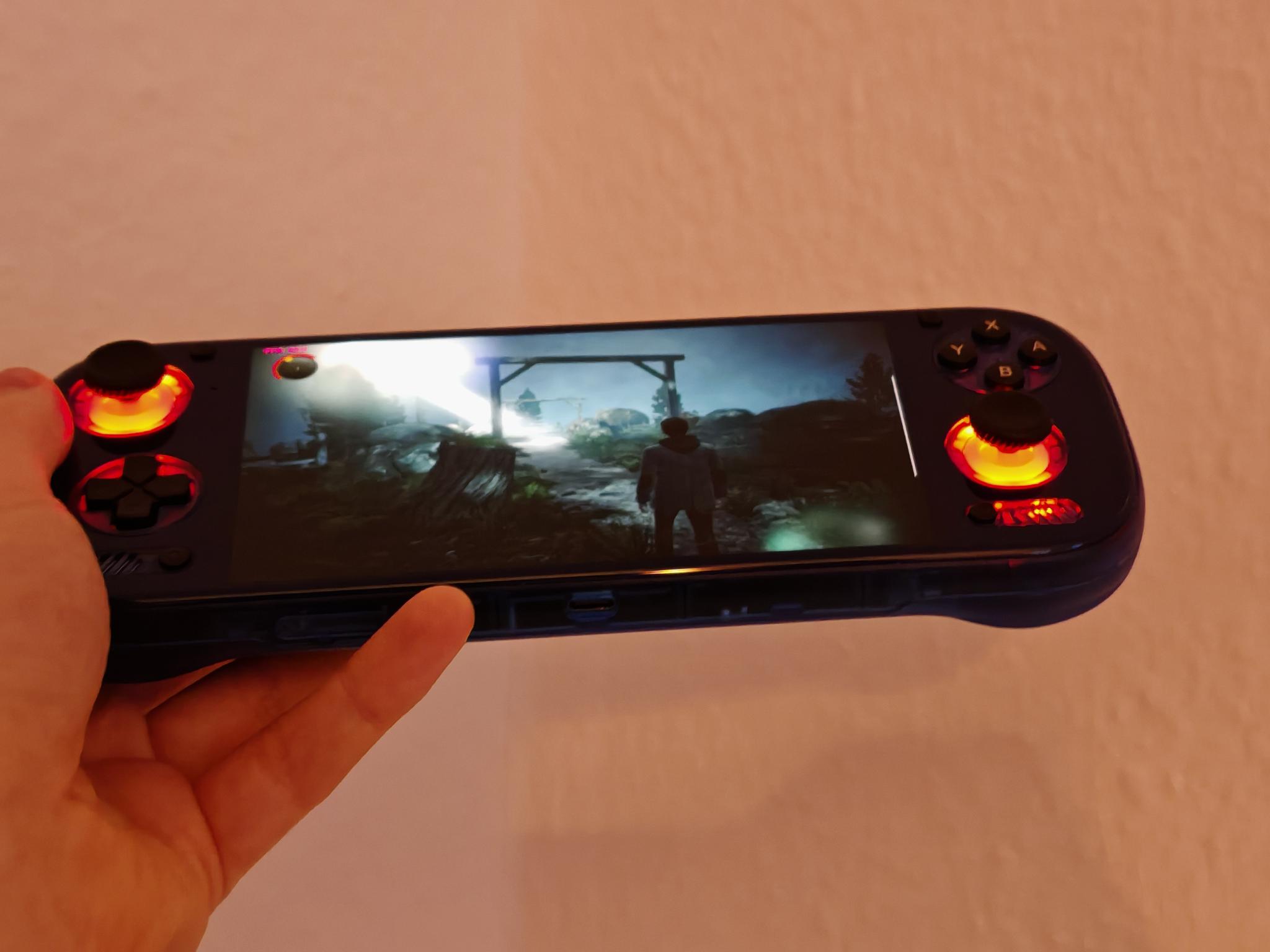 Das Tasten-Layout des Handhelds orientiert sich an den Controllern der Nintendo Switch. Dies ist etwas ungewöhnlich für einen Handheld, der diese Konsole eigentlich erst kürzlich emulieren konnte. Ein Xbox-Layout wäre für das Gerät, das besonders bei PC-Spielen so leistungsstark ist, vielleicht besser gewesen. Das Layout lässt sich jedoch softwareseitig anpassen, wobei es bei mir in beiden Layouts zu Fehleingaben beim Spiele-Streaming oder PC-Spielen kam. Die Analog-Sticks sind im Vergleich zum RG 557 riesig und damit genauso groß wie beim beliebten Original-Xbox-Controller. Das RGB-Licht der Joysticks lässt sich flexibel anpassen, allerdings können keine Farbverläufe ausgewählt werden.