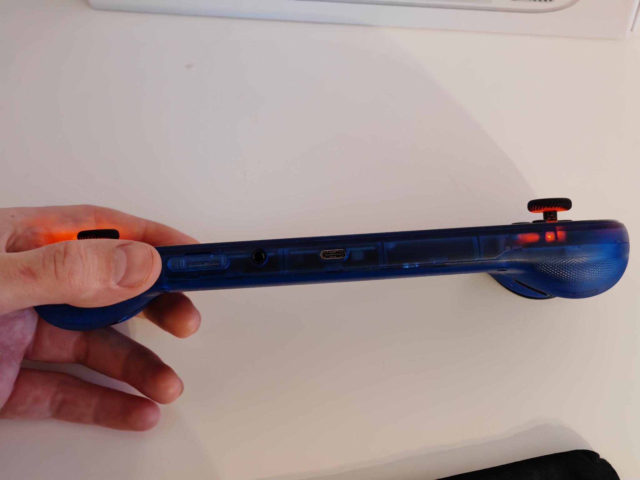 Die Oberseite des Odin 3 ist ebenfalls typisch für einen Handheld gestaltet. Die Schultertasten sitzen an der gewohnten Stelle, die Lautstärkewippe und der Power-Button mit Fingerabdrucksensor sind leicht nach rechts versetzt. In der Mitte der beiden Tasten ist eine Status-LED verbaut. Die Unterseite ist ebenfalls gewöhnlich gehalten. Neben einem Einschub für eine MicroSD-Karte befinden sich auf der Seite ein Kopfhörerausgang und ein USB-C-3.1-Anschluss.