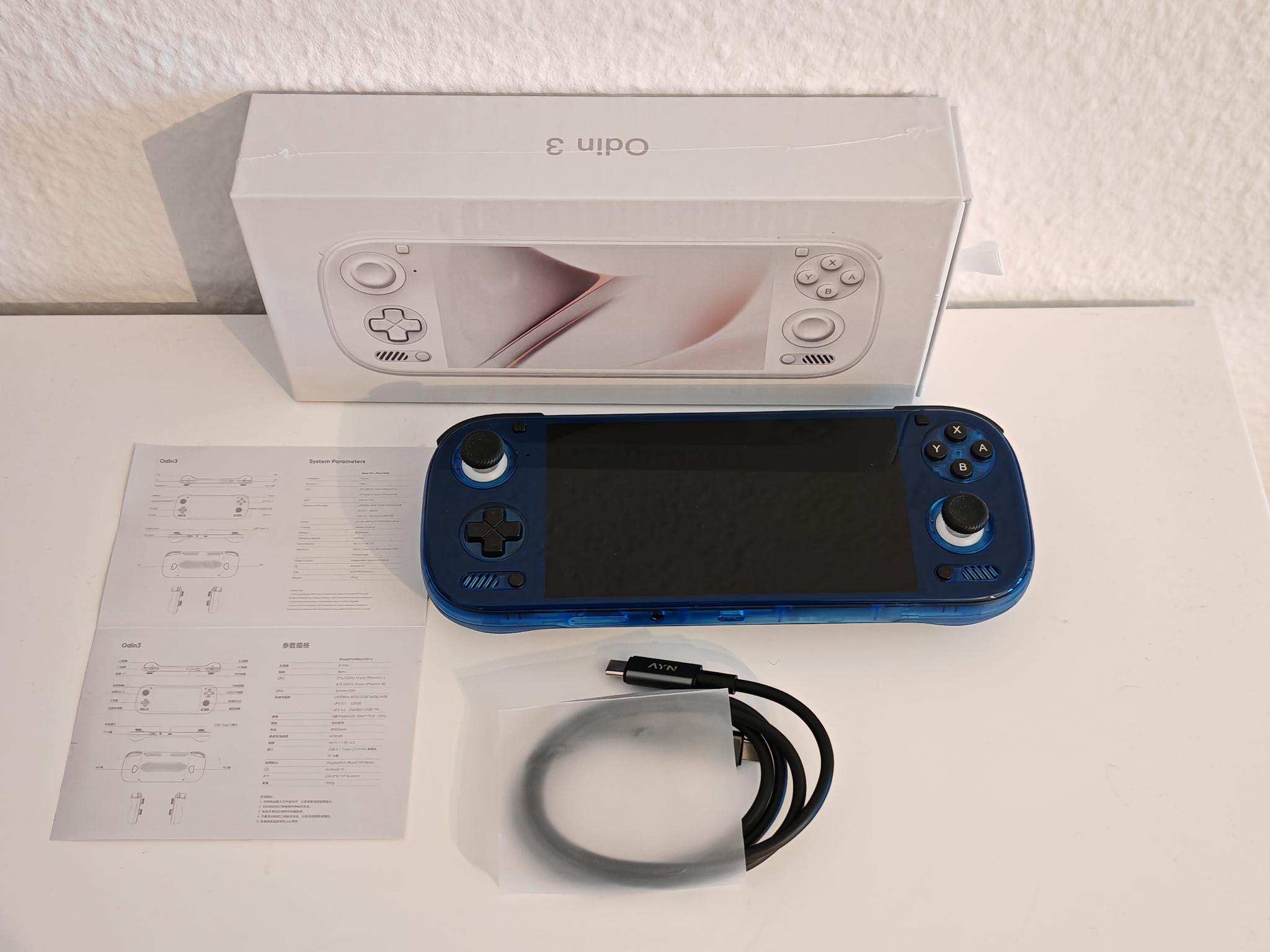 Der AYN Odin 3 hat einen spärlichen Lieferumfang, bietet dafür aber viel optional erhältliches Zubehör. Im Lieferumfang des Herstellers sind ein kurzes USB-C-auf-USB-C-Kabel und eine kleine Beschreibungskarte des Geräts enthalten. Ein Displayschutzglas liegt nicht bei. Dieses ist jedoch optional über den Hersteller direkt erhältlich und schützt das komplette Glas der Vorderseite, nicht nur das Display.