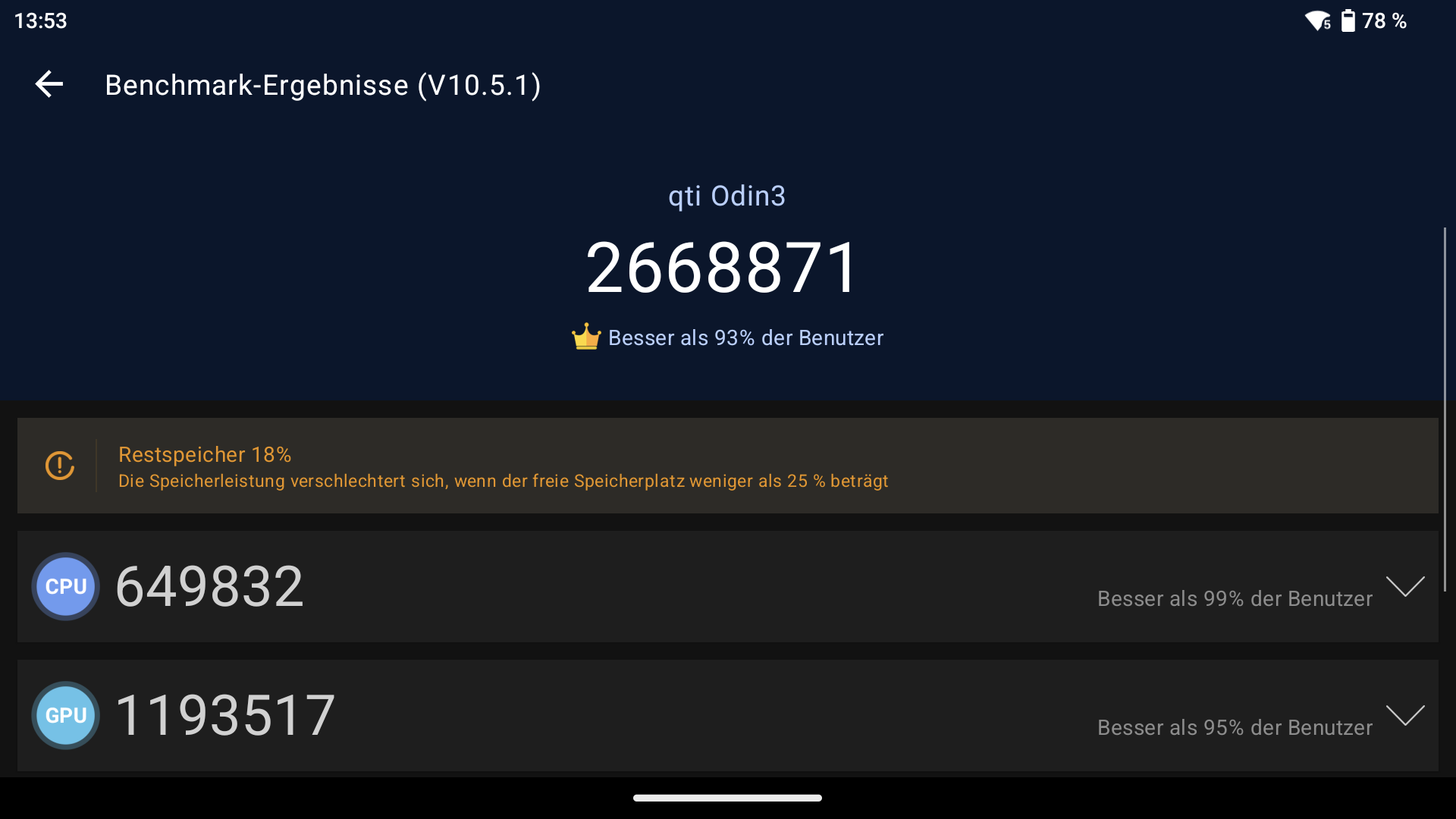 Vor allem der Performance-Boost zwischen „Performance“ und „High-Performance“ ist kaum spürbar, obwohl der Akkuverbrauch im letzten Modus deutlich höher ist. Bei Antutu erreichten wir mit dem „High-Performance“-Modus rund einen Prozent höheren Score und beim für den Handheld wichtigeren 3DMark erhielt ich kurioserweise sogar einen Prozent geringeren Wert (obwohl ich das auch mehrfach versuchte).