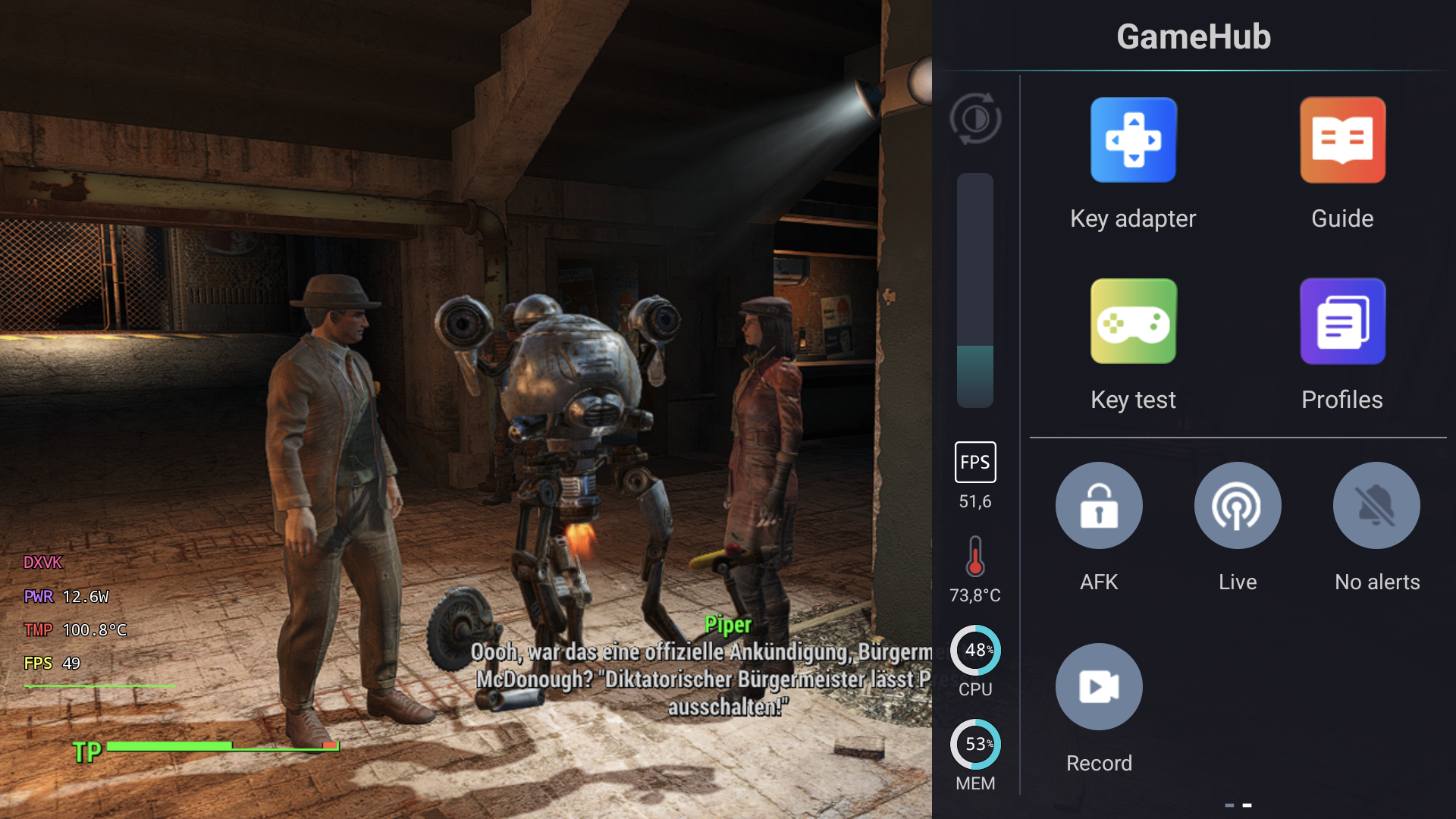 Ein weiterer Grund für den Kauf des AYN Odin 3 war für mich die Möglichkeit, auch grafisch aufwendigere PC-Spiele über GameHub zu installieren und dann direkt auf dem Handheld zu spielen. Nach der Anmeldung hat die App Zugriff auf eure Steam-Bibliothek und synchronisiert auch eure Spielstände. Die App kann auch kopierte Spiele von eurem PC abspielen. Leider lassen sich jedoch keine Spiele anderer Anbieter (Epic, Xbox Game Pass, …) einpflegen. Beim RG 557 funktionierte das Emulieren durch den MediaTek 8300 bei keinem von mir gewünschten Spiel. Beim hier verbauten Snapdragon 8 Elite sieht das anders aus …