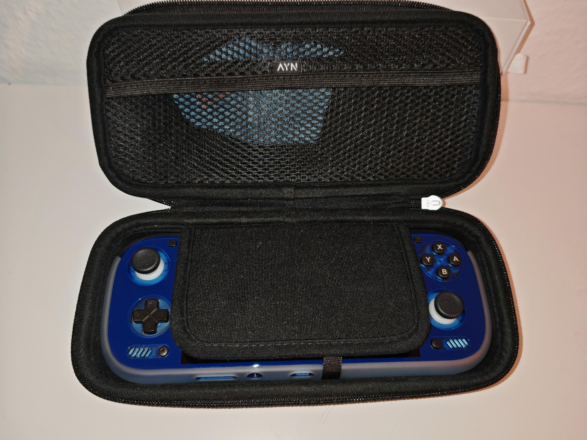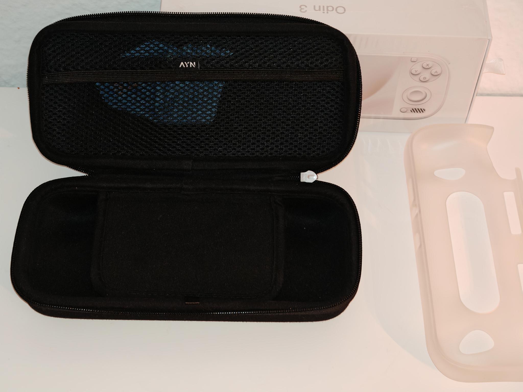 Optional bietet AYN beim Odin 3 einiges an Zubehör zu einem guten Preis. Neben einem transparenten oder schwarzen Silikon-Case gibt es auch eine passende, hochwertige Hülle für das Gerät. In dem Case befindet sich ein Netz, in dem sich problemlos ein Kabel oder andere Kleinigkeiten verstauen lassen. Ein Displayschutz und eine Schlaufe zum einfacheren Herausnehmen sind ebenfalls eingearbeitet.