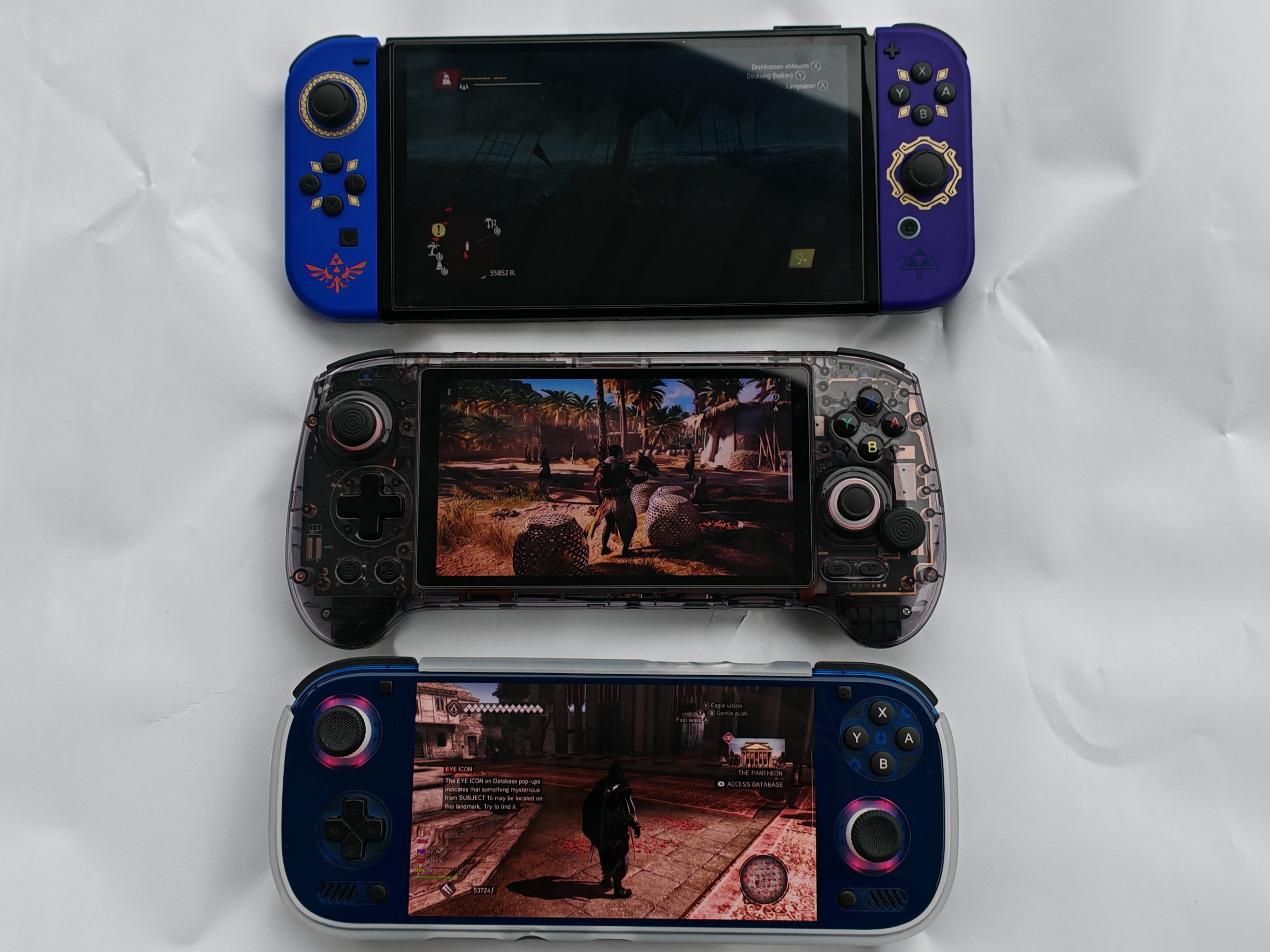 - Oben Switch OLED, Mitte RG557, unten AYN Odin 3 Tageslicht (draußen) – max. Helligkeit
