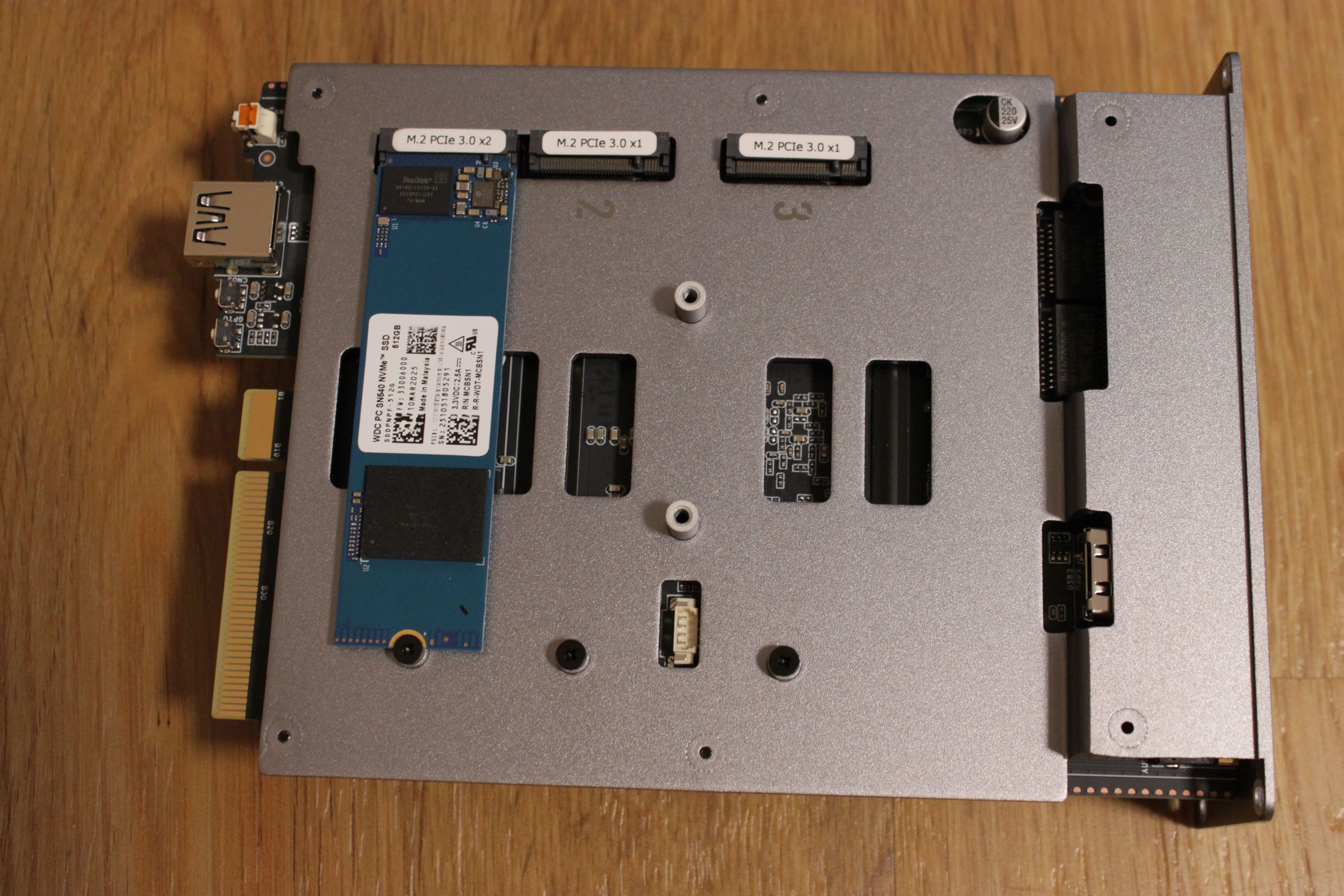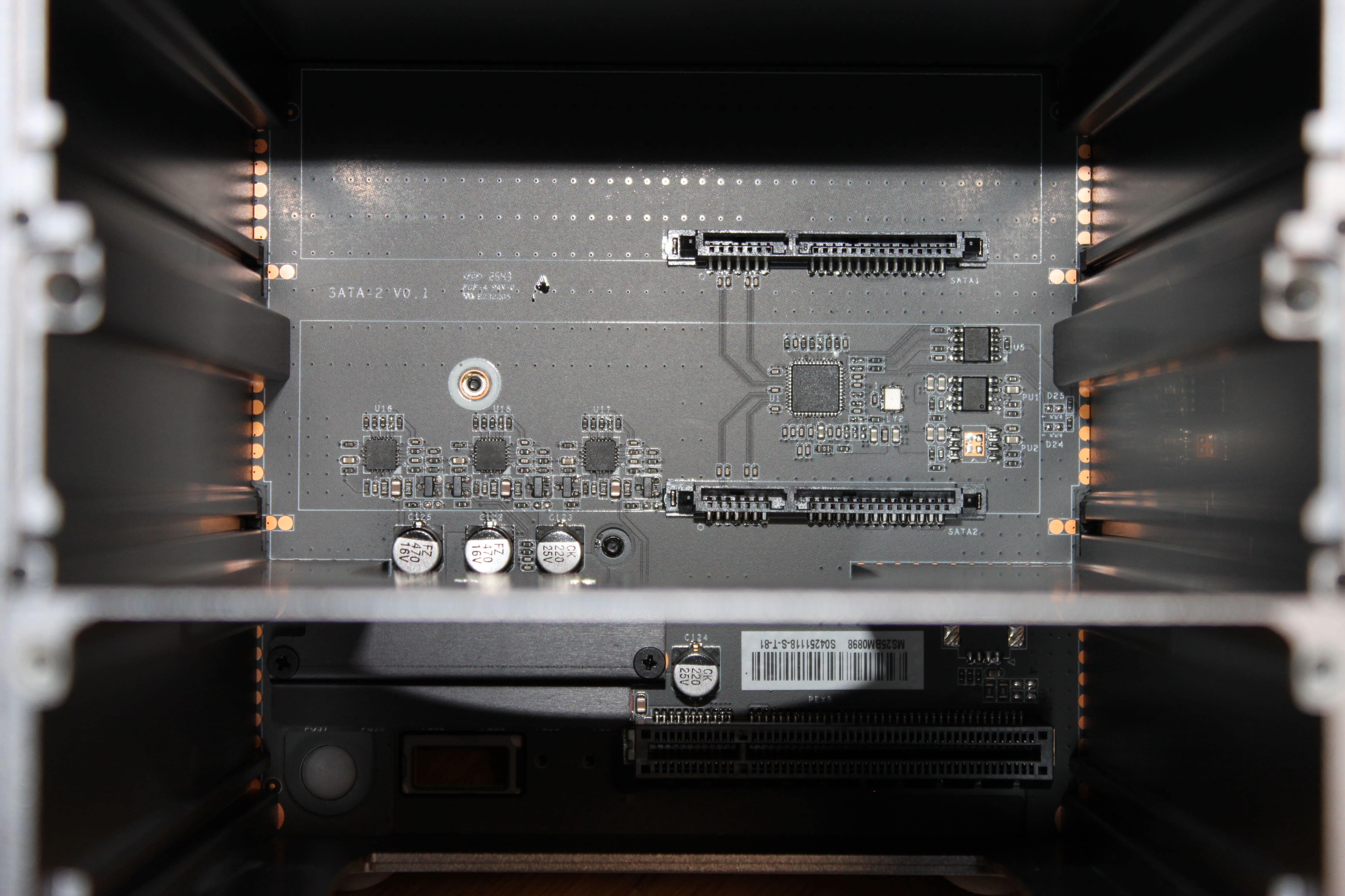 Unter der Haube des Beelink ME Pro finden wir die beiden SATA-Anschlüsse für die beiden Einschubfächer, welche Festplattengrößen bis zu 30TB pro Einschub unterstützen. Auf der Unterseite finden wir als Pendant zu den SATA-Anschlüssen drei NVMe-Steckplätze, von denen einer für die Systemfestplatte ein PCIe 3.0 x2 ist und die beiden anderen für die Datenplatten ein PCIe 3.0 x1 sind. Das sind zwar nur noch ca. 1GB/s, was aber für das Gesamtsetup reicht.