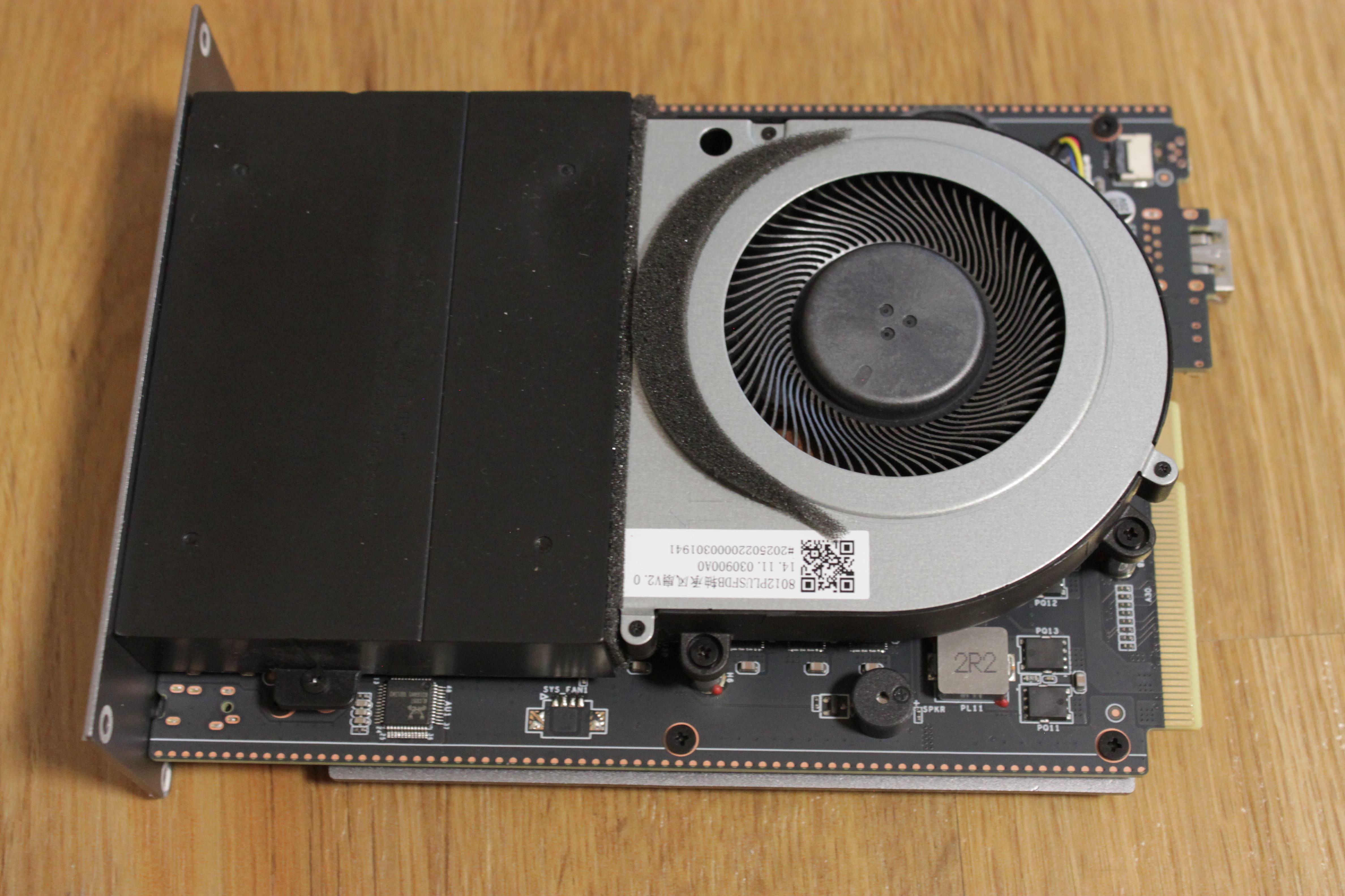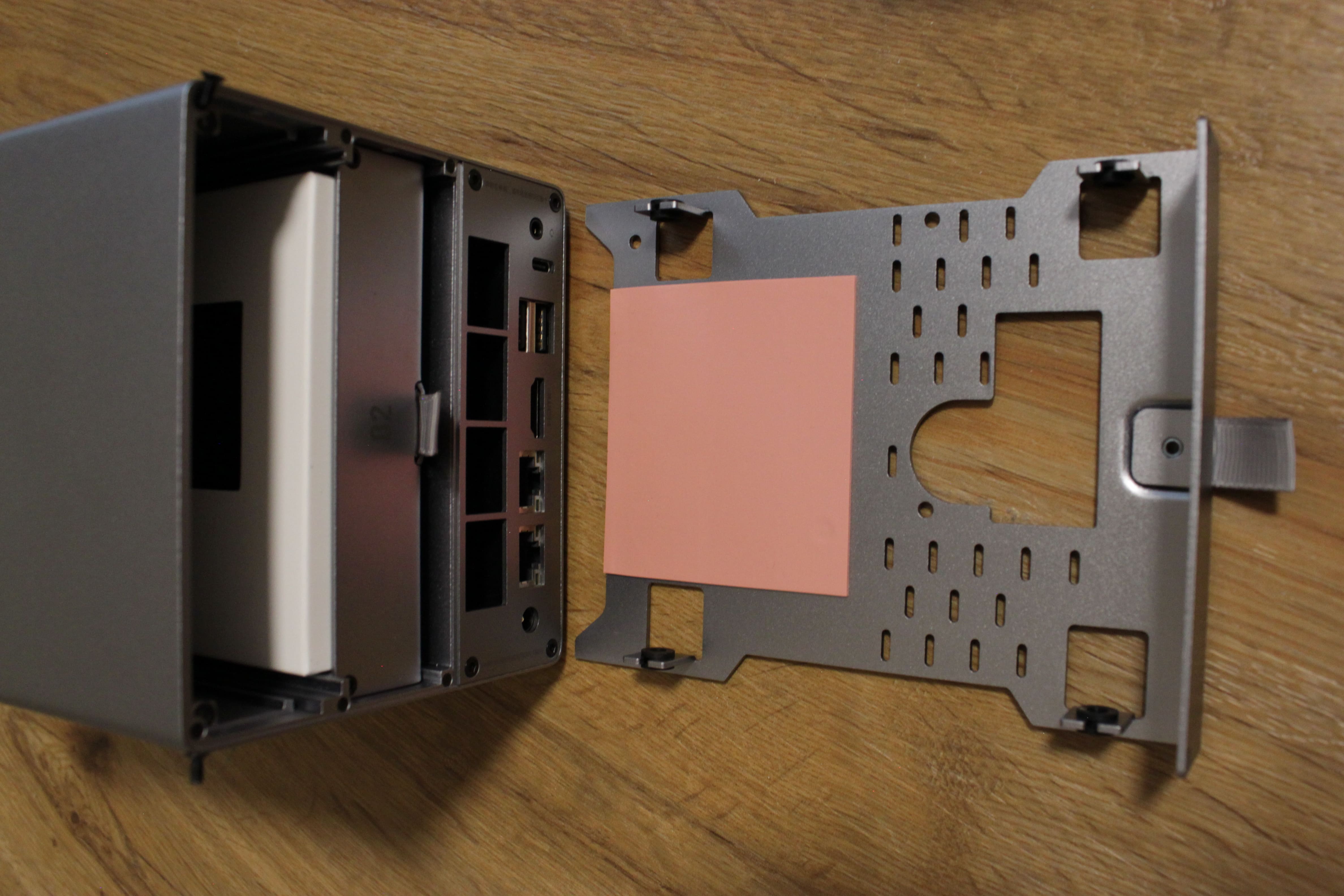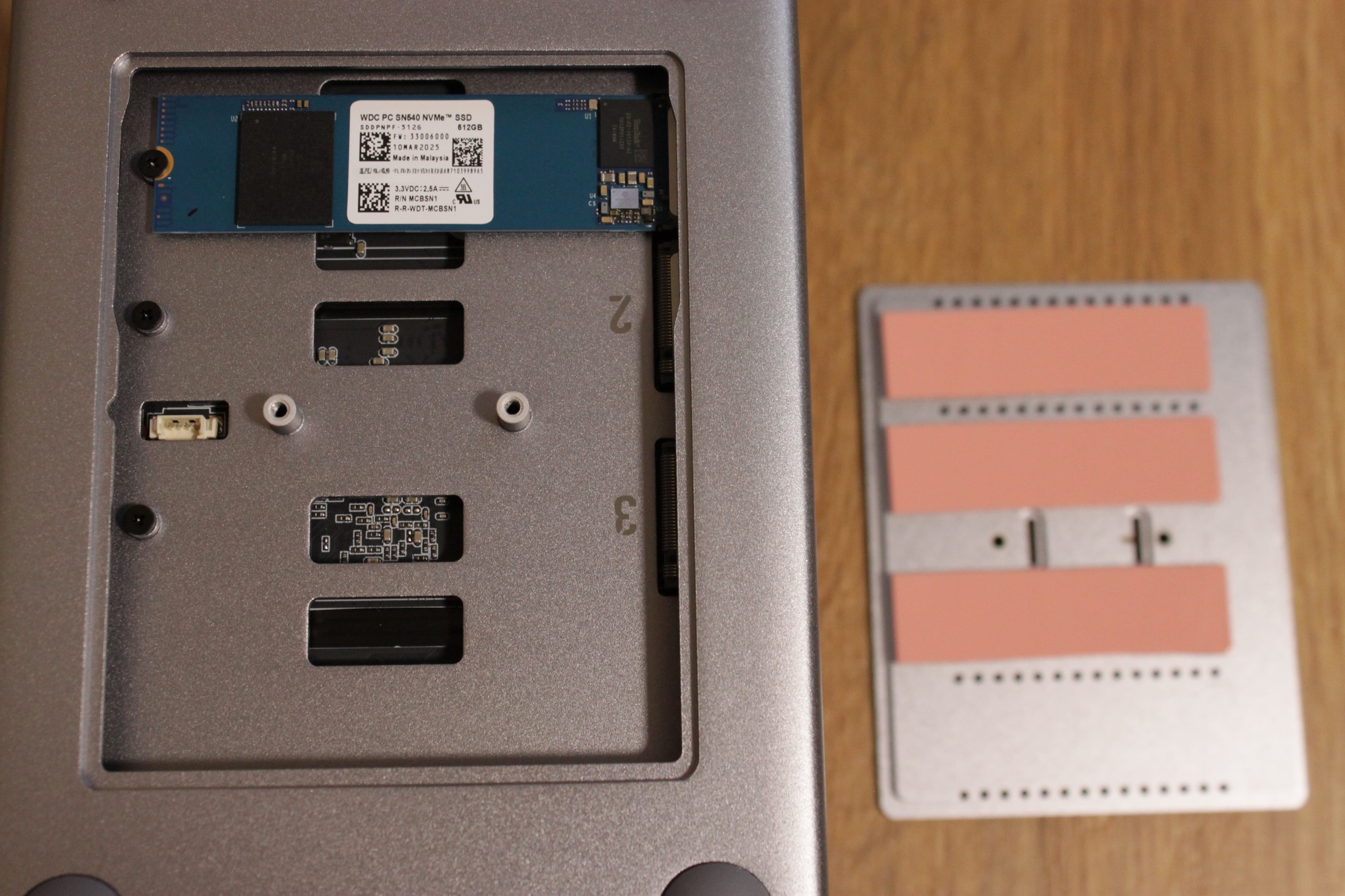 Entfernt ihr den Gummihalter für den Inbus, erhaltet ihr Zugang zur unteren Platte, die den Weg zu den SSD-Slots freigibt. Hier finden wir zwei freie Slots, die ihr beliebig verwenden könnt, etwa als Puffer- oder Festspeicher für Daten. Der erste Slot ist bereits durch die mitgelieferte SSD belegt, deren Größe je nach Konfiguration unterschiedlich ausfallen kann. Auch hier finden wir dicke Wärmeleitpads für die NVMe-Riegel.