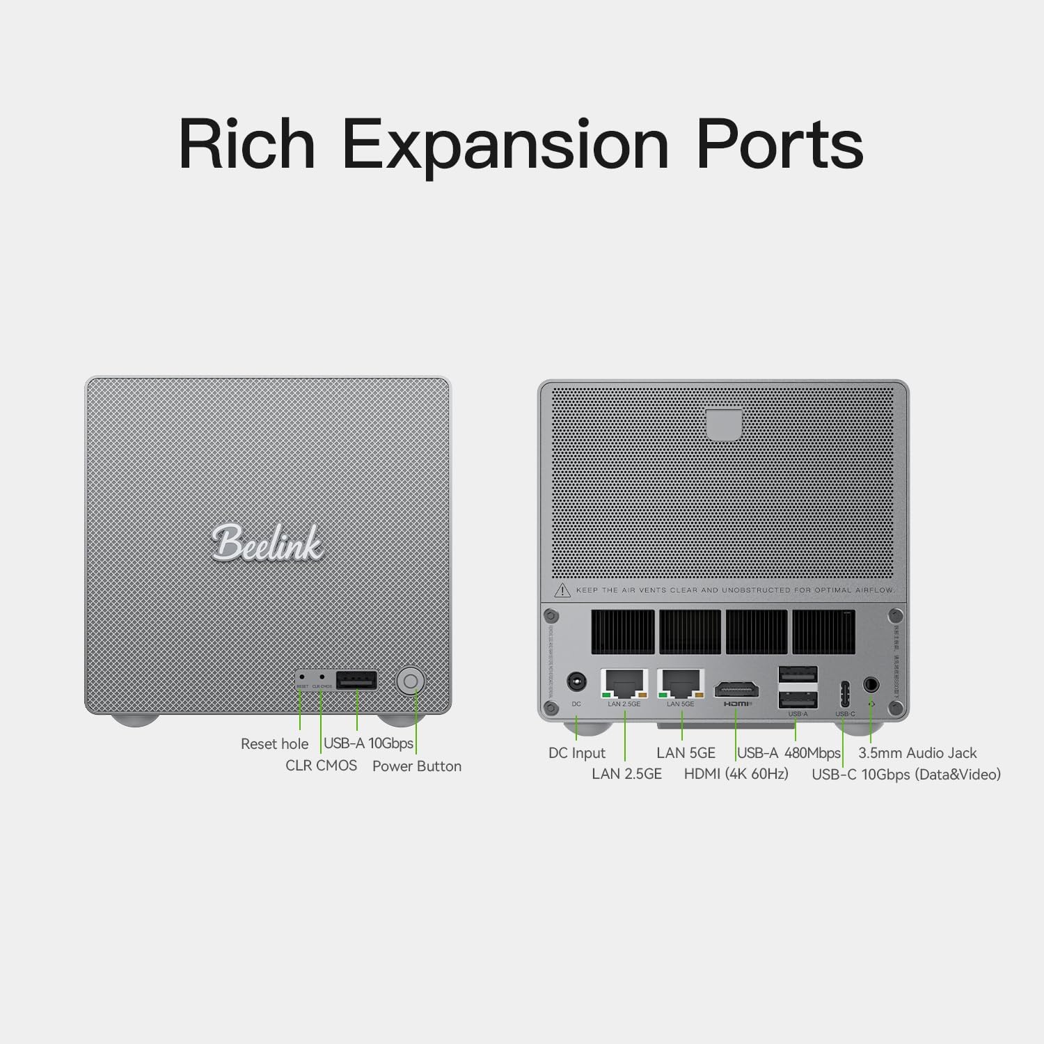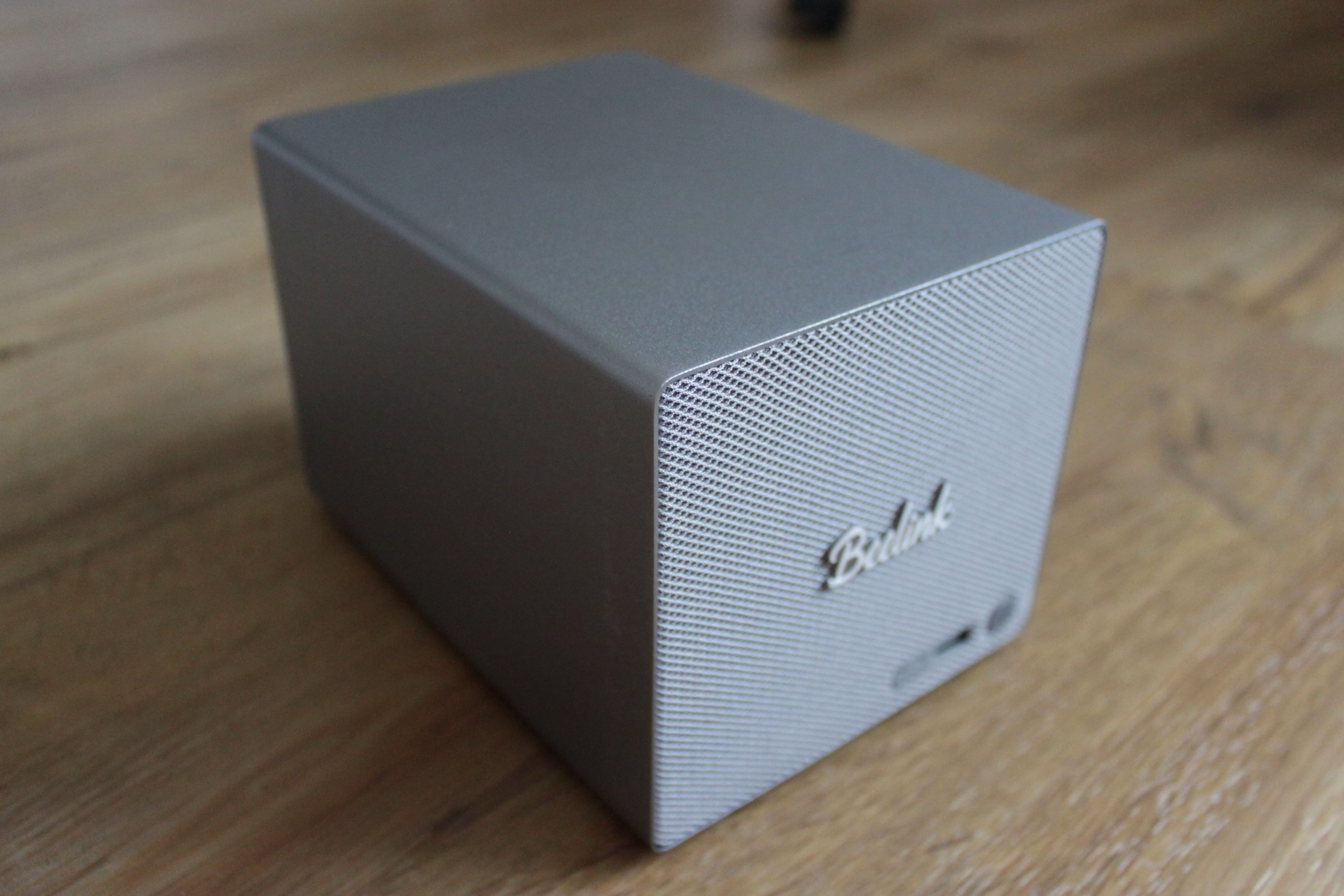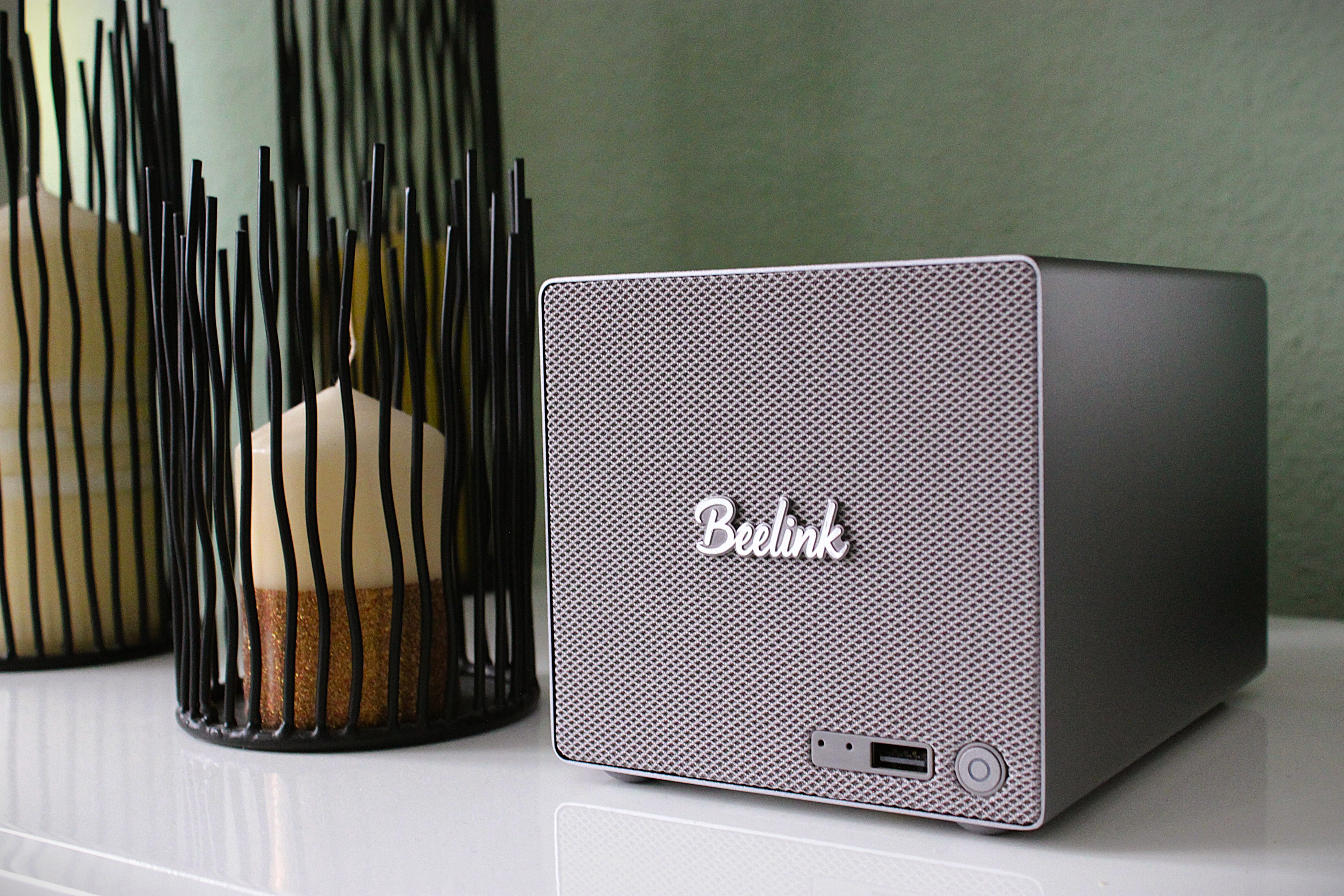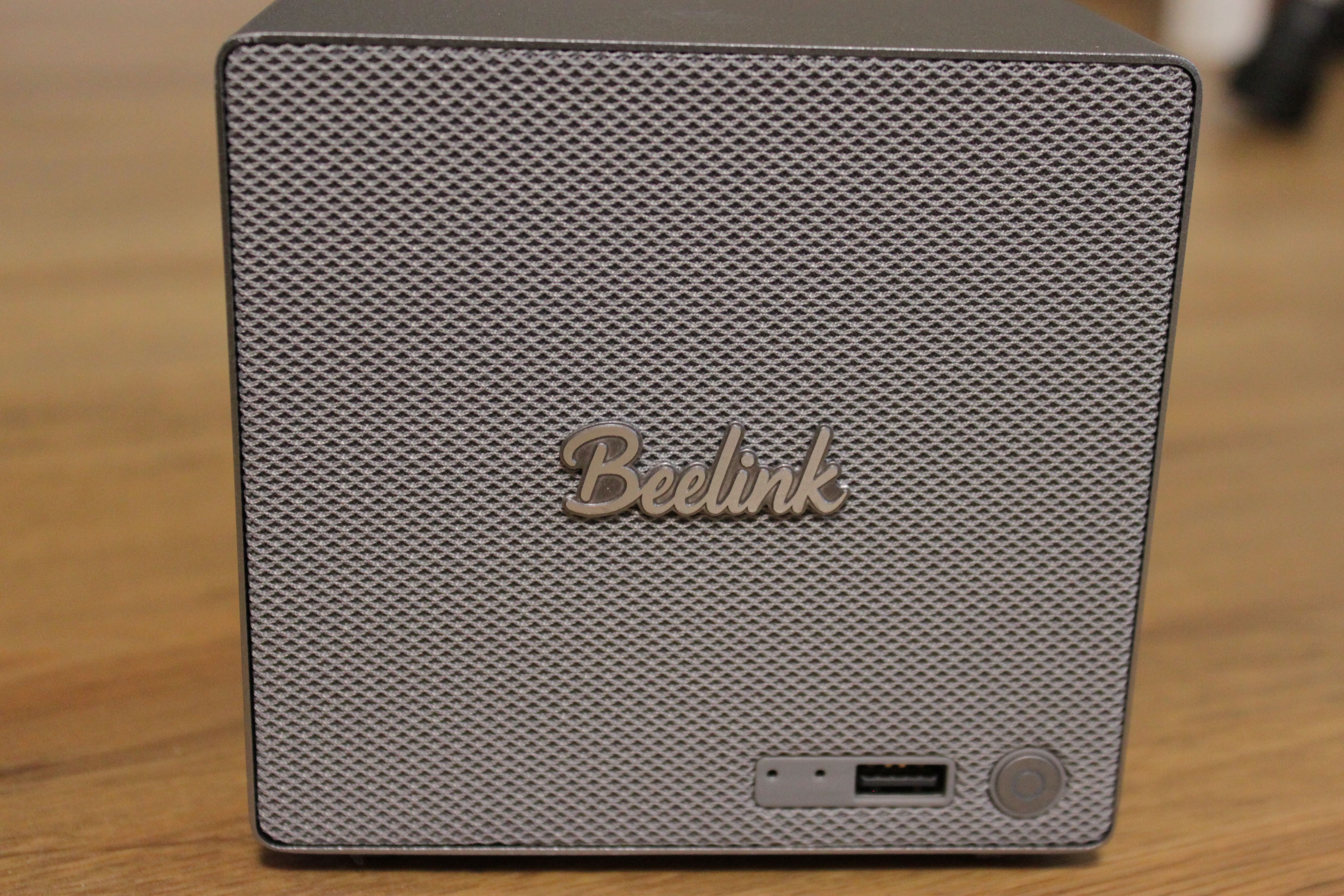 Das Gehäuse ist ansprechend gestaltet. Es bietet eine sehr gute Wärmeleitfähigkeit, Stabilität und Funktionalität. Auf der Vorderseite setzt das Designteam ein Highlight: Diese ist mit einem modernen, farblich passenden Stoffgeflecht verziert. Das hochglänzende, silberne Beelink-Logo steht souverän in der Mitte der Front und fügt sich in die Designlinie ein.